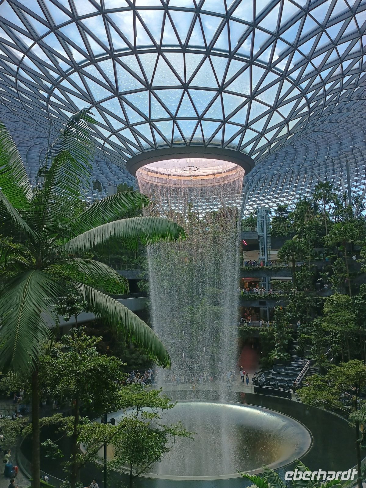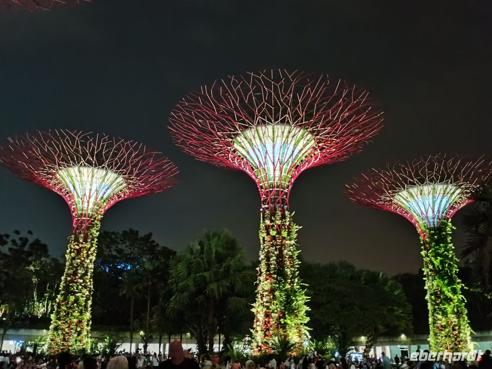 Weiter geht es für uns zu den Gewächshäusern Gardens by the Bay. Schon beim Eingang sehen wir die größte Orchidee der Welt und auf unseren kurzen Spaziergang können wir noch weitere atemberaubende Skulpturen und Bäume sehen. Zuerst geht es dann für uns in den Flower Dome, eine der größten frei stehenden Hallen der Welt, der zahlreiche exotische Pflanzen beherbergt. In dem Gewächshaus ändert sich alle zwei Monate das Thema, bei uns war alles noch auf das chinesische Neujahr, das Jahr des Drachen, ausgestellt und so war alles mit farbigen Drachen und Blumenarrangements dekoriert. Im Cloud Forest, wo man die Vegetation des tropischen Hochlandes bestaunen kann. Direkt nach dem Eingang wartet schon das Highlight ein Wasserfall, der vor einer Wand dekoriert mit prächtigen grünen Pflanzen 35 m fällt.