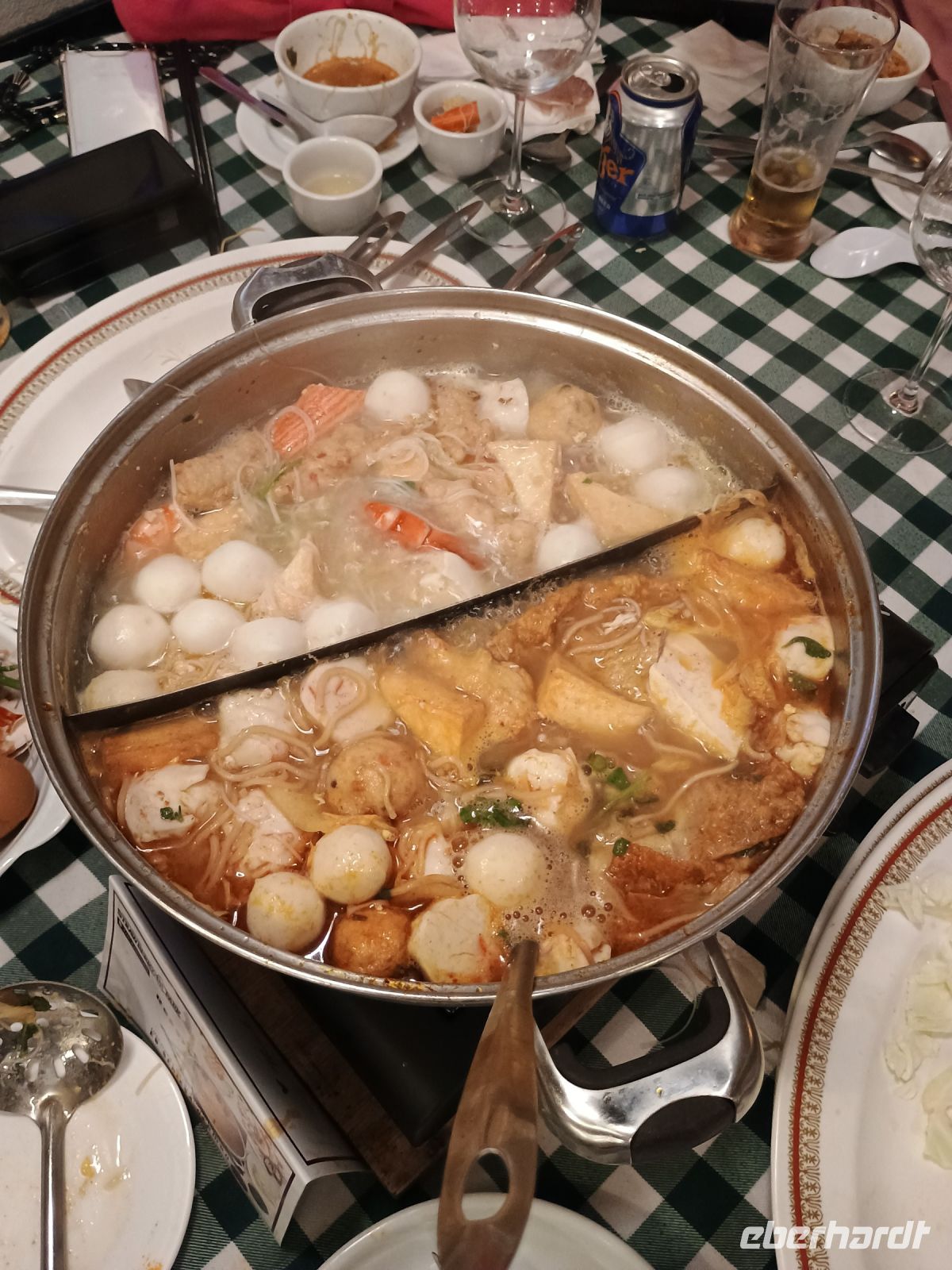 Heute geht es für uns aus dem Dschungel wieder in die Zivilisation und zumindest ich freue mich auf eins, zwei Insekten weniger. Wir setzen, nachdem Frühstück, mit dem Taxiboot über auf die andere Flussseite, laufen ein kleines Stück durch das Dorf und begrüßen dann nach 2 Tagen endlich wieder unseren Busfahrer, den wir schon vermisst haben. Unser heutiges Ziel sind die Cameron Highlands, eine Hochlandsiedlung benannt nach einem Landvermesser der britischen Kolonialregierung, William Cameron. Neben Backpacker und Touristen kommen auch viele Einheimische über das Wochenende oder zu ihrem Urlaub in die Cameron Highlands, denn durch seine hohe Lage um circa 1500 Meter bietet es mit seinen kühleren Temperaturen eine willkommene Abwechslung zu den tropischen Verhältnissen. Nach einer langen Busfahrt mit zahlreichen Kurven kommen wir in Tanah Rata an und machen eine kleine Mittagspause in der Hauptstadt des Distrikts. Danach geht es für uns weiter in die BOH „Best of Highland“ – Teeplantage. Die Teeplantage gehört der schottischen Familie Russell und liegt auf circa 1505 Meter. Mit unserem Bus würden wir über die enge Straße gar nicht hinkommen und so werden wir von einem kleinen Schulbus abgeholt und genießen während der Fahrt den Blick auf die vielen Teeplantagen. Die Plantage ist etwa 234 Hektar und täglich werden hier 820.000 Tassen Tee pro Tag verkauft. Bei einer kleinen Führung können wir uns den Prozess der Teeverarbeitung genauer anschauen und danach im Shop Tee für zu Hause kaufen. Passen zur Kaffeezeit gibt es für uns mit Blick auf die grünen Hügel Scones und frischen Tee. Danach geht es für uns wieder zurück und weiter in eine Schmetterlingsfarm. Hier sehen wir hunderte Schmetterlinge verschiedener Größe, Farbe und Art. Auch andere Insekten können wir hier sehen. Danach müssen wir nur die Straße überqueren und wir kommen auf eine Erdbeerfarm, wo wir auch eine Kostprobe machen dürfen. Weiter geht es für uns ins Hotel und wir machen uns fertig für das Abendessen. Heute steht für uns ein Steamboad Dinner an, das heißt jeder Tisch bekommt einen großen Topf in die Mitte gestellt, der mit zwei Brühen, eine scharfe und eine klare Brühe, gefüllt ist und dazu stehen auf dem Tisch viele verschiedene Sachen, die man darin garen kann. Nach anfänglichen Schwierigkeiten wie man am besten anfängt, ist man danach voll dabei und wir essen uns satt an Nudeln, Hühnchen, Fisch, Pilze und verschiedene Salat und Gemüsesorten.