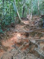 Wir stärken uns für den heutigen Tag, den heute haben wir viel vor uns. Zuerst geht es auf eine kleine Wanderung, wo uns die Guides die verschiedenen Pflanzen und Bäume etwas näher bringen, so können wir unter anderem ganz frischen wilden Ingwer probieren. Nach einiger Zeit muss sich jeder entscheiden, ob man mit auf den Teresek Hill hochwandern oder doch bei dem entspannten Wanderweg bleiben und schon einmal den Baumwipfelpfad überqueren möchte. Sieben Gäste und ich entscheiden uns für den 900 m Anstieg zum Aussichtspunkt. Der erste Teil des Aufstiegs erfolgt über unendlich viele Treppen, bis wir nach 15 Minuten bei dem ersten Aussichtspunkt ankommen und wir entscheiden, dass wir eine kleine Verschnaufpause benötigen. Unserem Guide sieht man überhaupt keine Anstrengung an und auch die Gäste sind fitter unterwegs als ich. Nach der kleinen Pause geht es für uns auf den zweiten Abschnitt und dieser ist etwas angenehmer, so gibt es keine Treppen mehr und wir gehen fast gerade und müssen nur über einige Baumwurzeln steigen. Oben angekommen belohnt uns eine bombastische Aussicht auf den Nationalpark und den Tahan, der höchste Berg auf der malaysischen Halbinsel. Wir sind glücklich und stolz, dass alle diesen Weg so gut gemeistert haben. Der Weg runter ist dann auch wieder leichter und so geht es für uns danach auch weiter zum Baumwipfelpfad, hier geht es für uns auf der Höhe der Baumkronen durch den Dschungel. Zum Mittagessen treffen wir uns dann mit der restlichen Gruppe wieder in unserer Lodge. Am Nachmittag geht es dann für uns erneut mit Booten, in denen jeweils 3-4 Personen Platz finden, auf den Fluss entlang. Unser erster Stopp machen wir an einem 80 m hohen Baum, der um die 400 Jahre alt sein soll. Wir fahren weiter, bis zu unserem nächsten Stopp, hier können wir Fische füttern. Zurück in unseren Booten, wo das ein- und aussteigen schon bei jedem Stopp eine wackelige Angelegenheit ist, geht es nun zu einem Wasserfall-Jacuzzi, wo wir baden, gehen können. Bevor wir jedoch an unserer Badestelle ankommen, steht uns erst noch eine 30-minütige Wanderung bevor. Der Weg führt uns über Baumwurzel und enge Trampelpfade. Am Wasserfall angekommen sehen wir zwar kein Wasserfall und sind etwas enttäuscht, aber einige der Gäste springen trotzdem zur Abkühlung in das Wasser und genießen die kleine Badepause. Danach geht es für uns wieder zurück zur Lodge. Je nachdem, ob sich die Hütte am Anfang und damit in der Nähe der Rezeption befindet oder eher ganz hinten und somit mit einem Fußweg von 10 Minuten verbunden ist, wird entschieden, ob man sich in der Zeit bis zum Abendessen noch mal frisch macht oder vorn an der Bar sitzen bleibt und lieber ein kaltes Bier oder ein Wein trinkt.