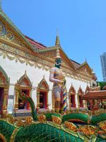 Da wir bis zum Mittagessen noch etwas Zeit haben, entschließt sich Malik uns einen thailändischen Tempel, den Wat Chaiya Mangalaram Tempel, zu zeigen. In diesem Tempel können wir den drittgrößten liegenden Buddha bestaunen. Wir kehren in einem indischen Restaurant ein, wo uns auf Bananenblätter, Reis und verschiedene Soßen aus großen Behältern serviert werden. Dazu bekommen wir verschiedene Platten mit Huhn, Fisch und Lammgerichten. In Indien ist es typisch, dass man alles mit der rechten Hand isst, aber wir entschließen uns doch alle zu Gabel und Messer zu greifen. Für eine kleine Verdauungspause geht es zurück zu unserem Hotel und eine Stunde später warten bereits die Rikschas auf uns. Denn über den Nachmittag werden wir weitere Sehenswürdigkeiten bei einer Rikscha-Fahrt entdecken. Nachdem die erste Hürde, das Zusammensitzen in den jeweiligen engen Rikschas, geschafft ist, geht es für uns zu unserem Fotostopp das Rathaus von Georgetown. Nach einigen Metern geht es dann zu Chew Jetty, eine kleine Stadt gebaut auf Stelzen. Wir laufen durch die Häuser über dem Ozean, bevor es für uns weiter mit den Rikschas geht. Vorbei an verschiedenen Street-Art Projekten geht es zu unserem letzten Stopp, dem Leong San Tong Khoo Kongsi, dem prächtigsten Clan Tempel Malaysias. Der Tempel hat sich sein historisches, authentisches Ambiente bewahrt, mit seinem traditionellen Theater und den Häusern für Clan-Mitglieder aus dem 19. Jahrhundert. In einer kleinen Ausstellung erfahren wir auch, dass es ein Drehort für den Film "Anna und der König" war. Durch die sehr hohen Temperaturen sind wir froh, als wir wieder im Hotel ankommen und wir noch etwas Zeit haben bis zum Abschiedsabendessen. In unserem Hotelrestaurant erwartet uns heute ein vielfältiges Buffet und so genießen wir unseren letzten Abend zusammen, während sich das Restaurant um 360 Grad dreht und wir bei jeden Bissen einen anderen Ausblick auf Georgetown genießen können. Danach setzen sich noch einige zusammen auf der Dachterrasse an die Bar und genießen einen Cocktail und nette Gespräche.