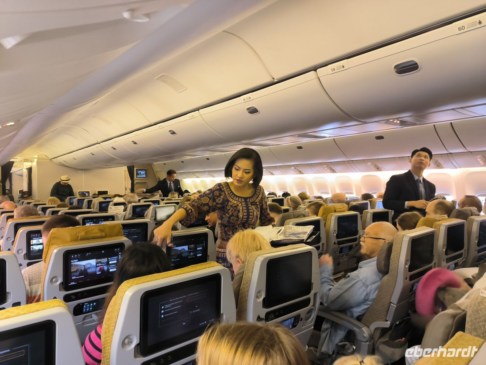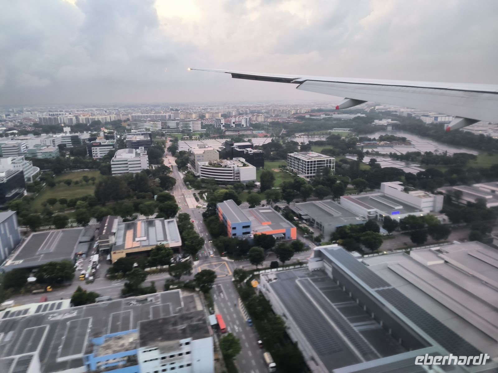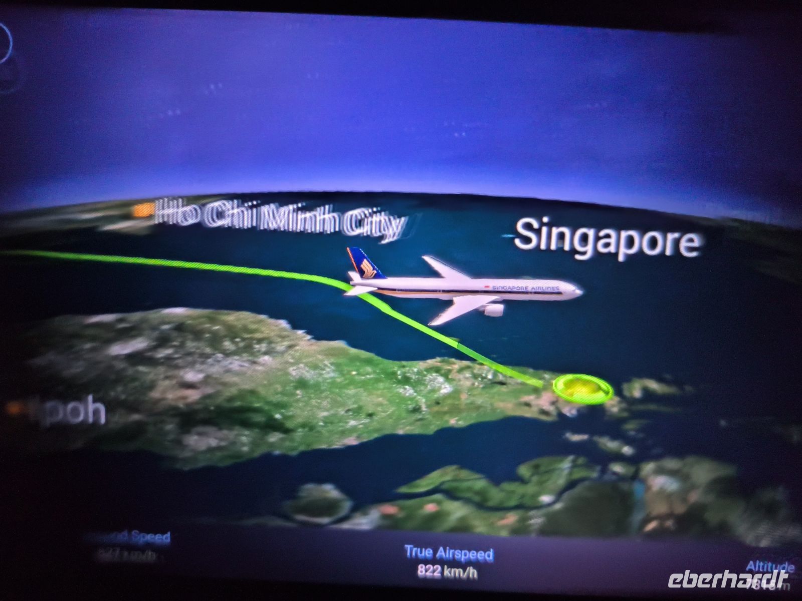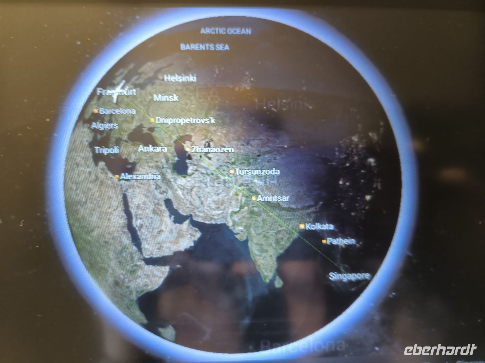 Check in, Boarding und Abflug verlaufen problemlos und pünktlich. Im Flugzeug können wir die Flugstrecke verfolgen, das Bord Entertainment bietet verschiedene Filme zur Auswahl und das wunderschöne Bordpersonal bewirtet uns freundlich. Trotzdem ziehen sich natürlich zwölf Stunden Flugzeit, bis wir – mit sieben Stunden Zeitverschiebung – am sehr frühen Morgen endlich in Singapur landen.