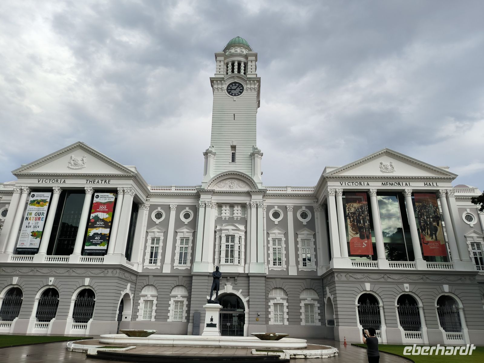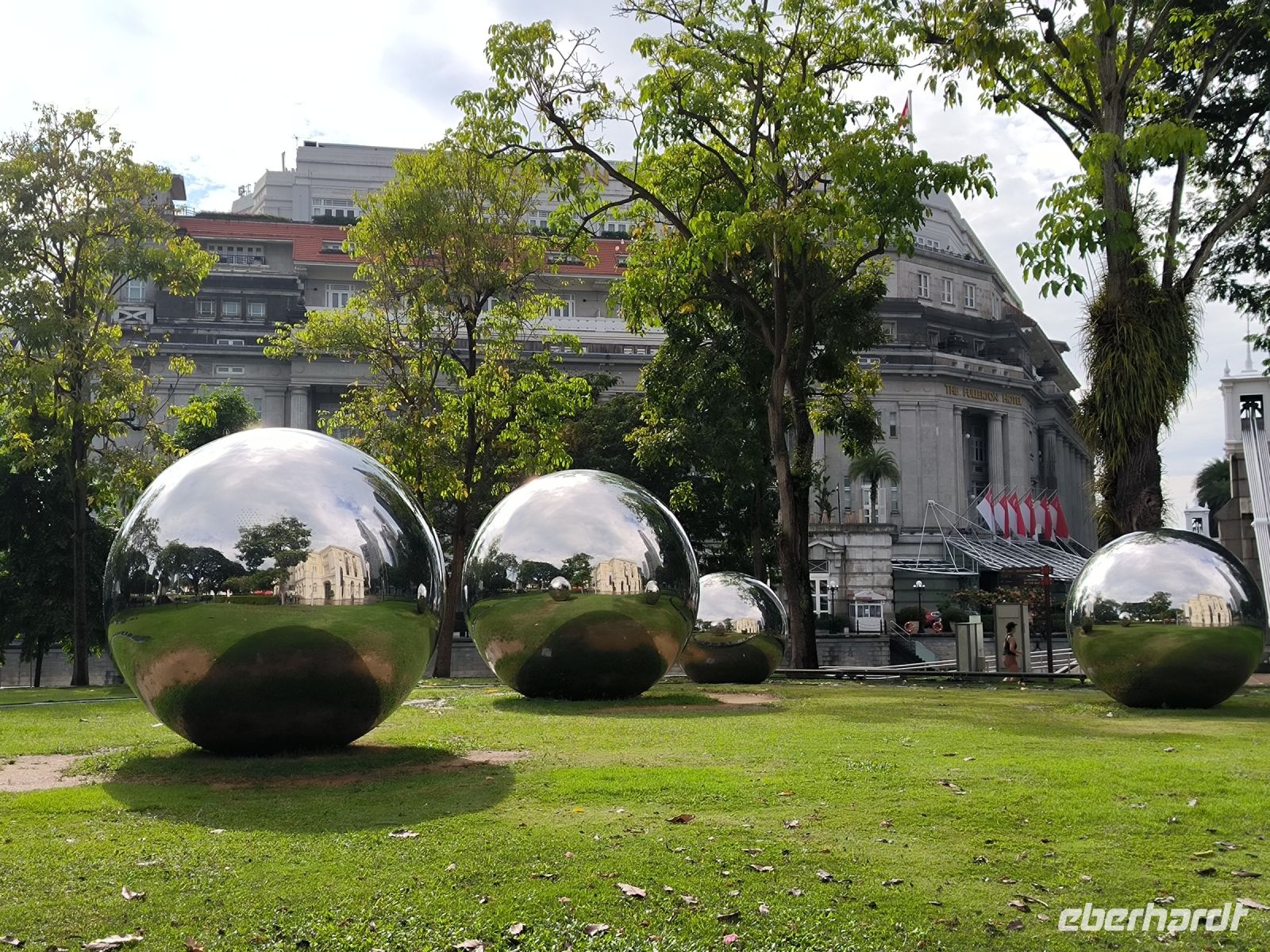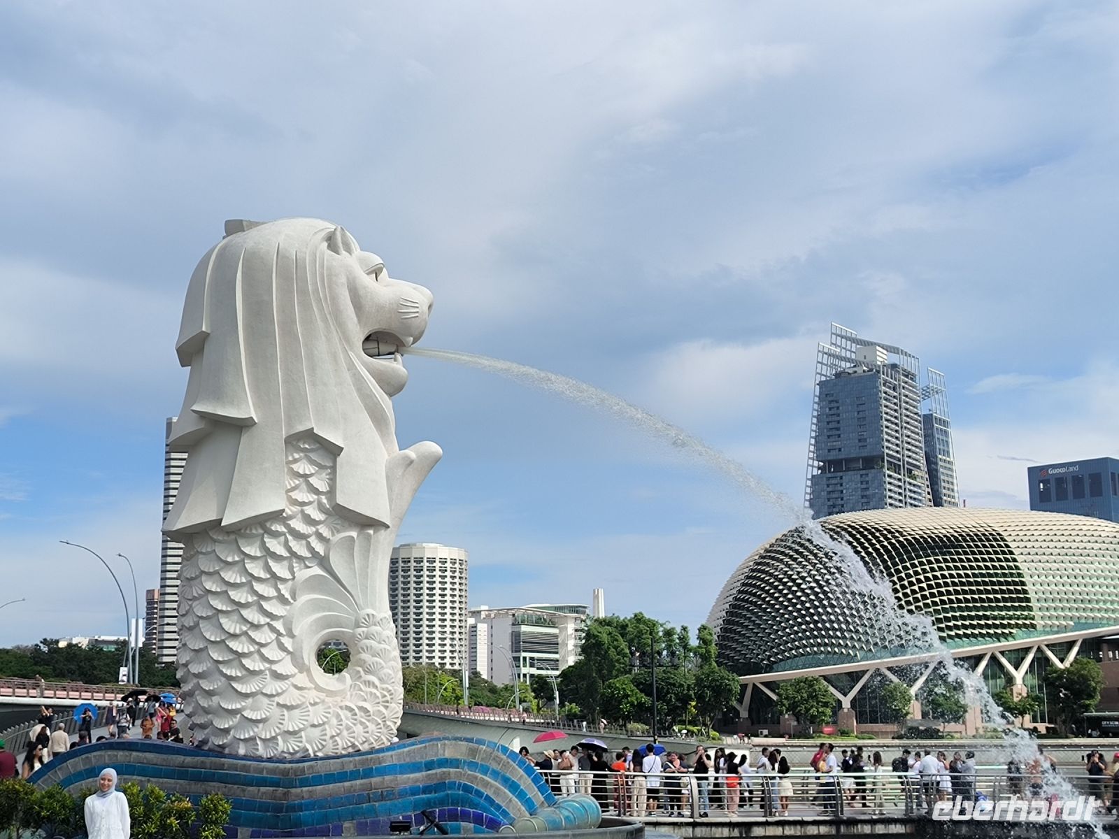 Die Fahrt in die Innenstadt dauert nicht lang und Bibi erzählt uns, dass es auch einen Fahrradweg gibt, der direkt an der Küste entlang führt. Erster Stopp in Singapur ist an der Victoria Memorial Hall, einem Gebäude im Kolonialstil, in dem Konzerte und Theateraufführungen stattfinden. Die Skulptur davor zeigt Sir Stamford Raffles, den Gründer des modernen Singapur. Noch ist es früh und es sind nicht viele Touristen unterwegs. Der Regen lässt nach und schon als wir die Cavenagh Bridge überqueren, können wir die Schirme einpacken. Wir durchqueren das mondäne Fullerton Hotel und schon öffnet sich der Blick auf eines der Wahrzeichen von Singapur: das Marina Bay Sands Hotel mit den drei Türmen, auf denen ein „Schiff“ liegt. In den nächsten Jahren soll übrigens ein vierter Turm entstehen und das Bauwerk vollenden. Ein weiteres Wahrzeichen ist der weiße „Merlion“ – eine Symbiose aus Mermaid und Lion. Hier erklärt sich auch der Name Singapur: im Sanskrit heißt Singa der Löwe und Pura die Stadt, also Singapur.