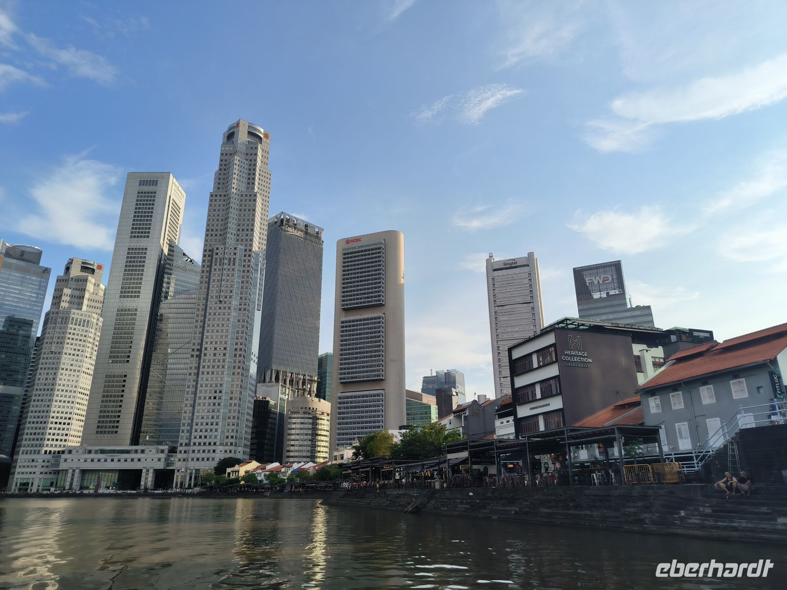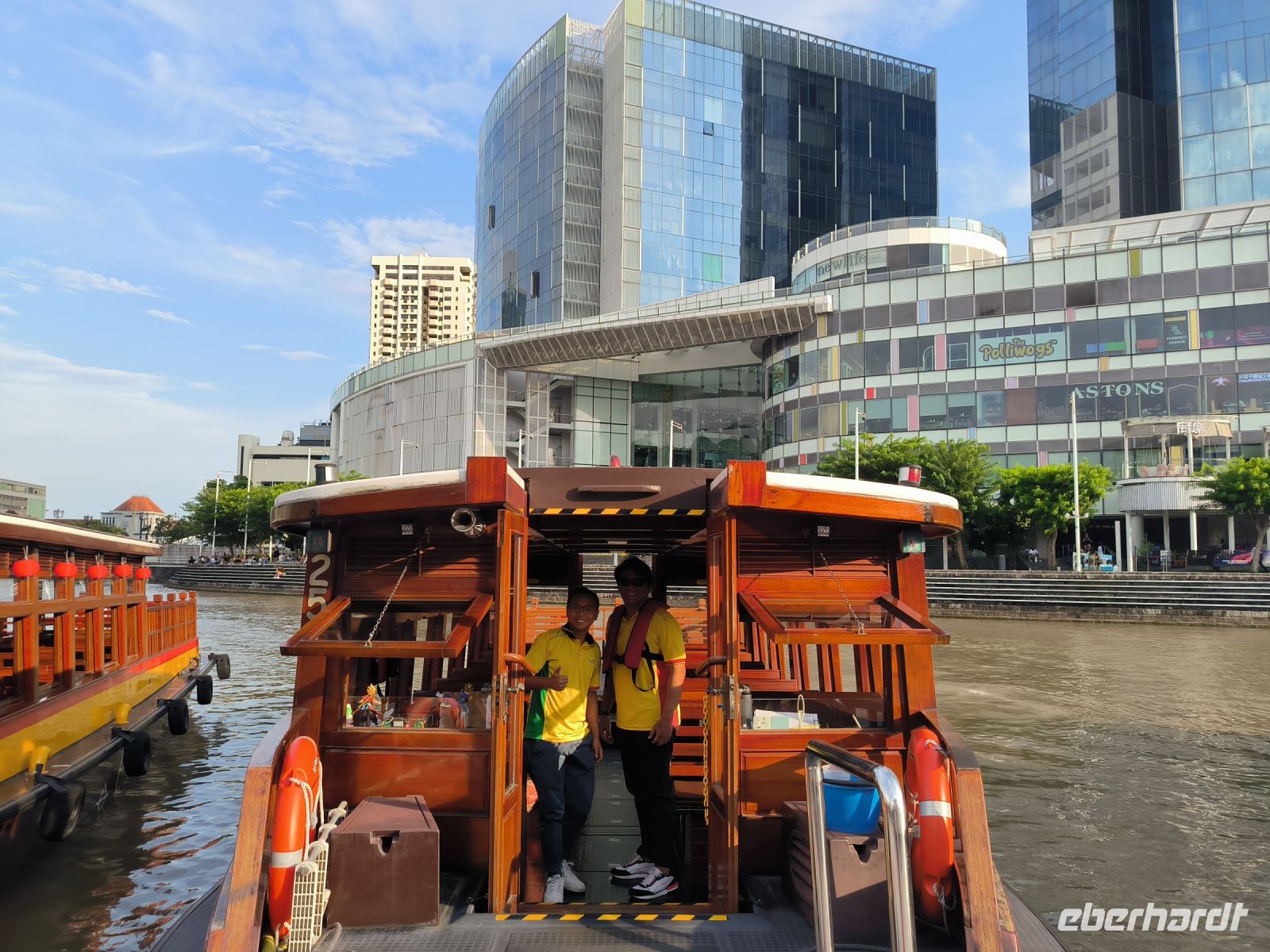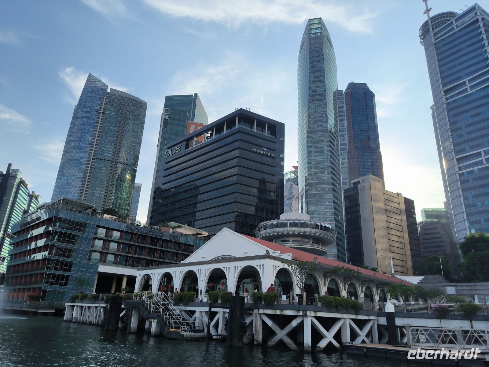 Am Clark Quay in der Nähe unseres Hotels entspannen wir bei einer kurzen Mittagspause, bevor wir an der Bootsanlegestelle unsere Bootsfahrt auf dem Singapore River beginnen. Hier können wir die nun uns schon vertrauten Gebäude um Marina Bay noch einmal von der Wasserseite aus bewundern.