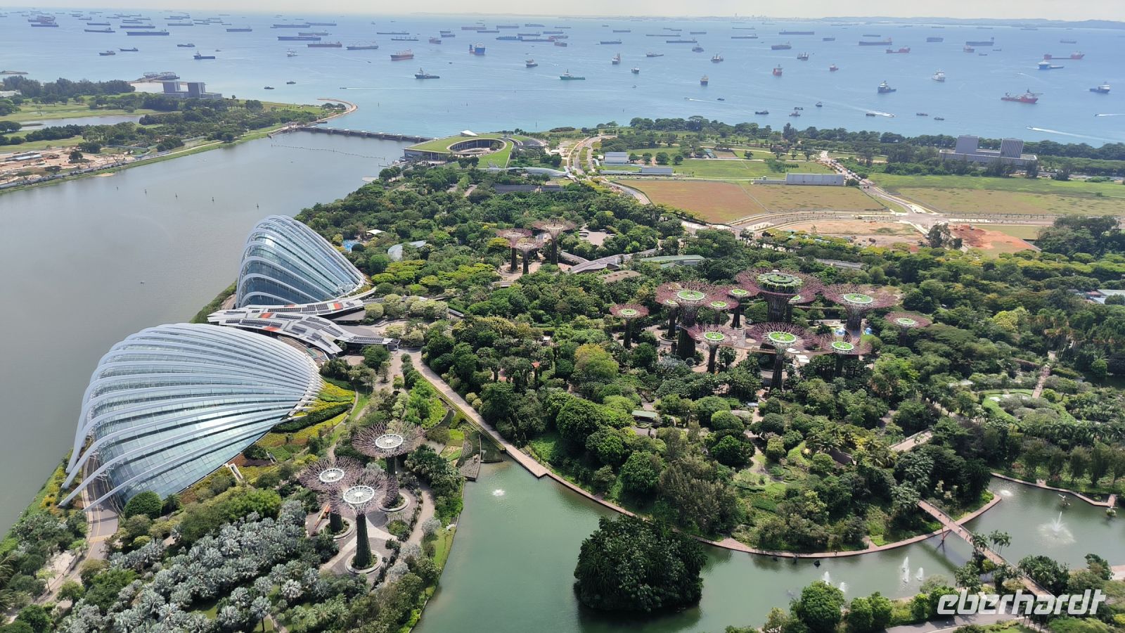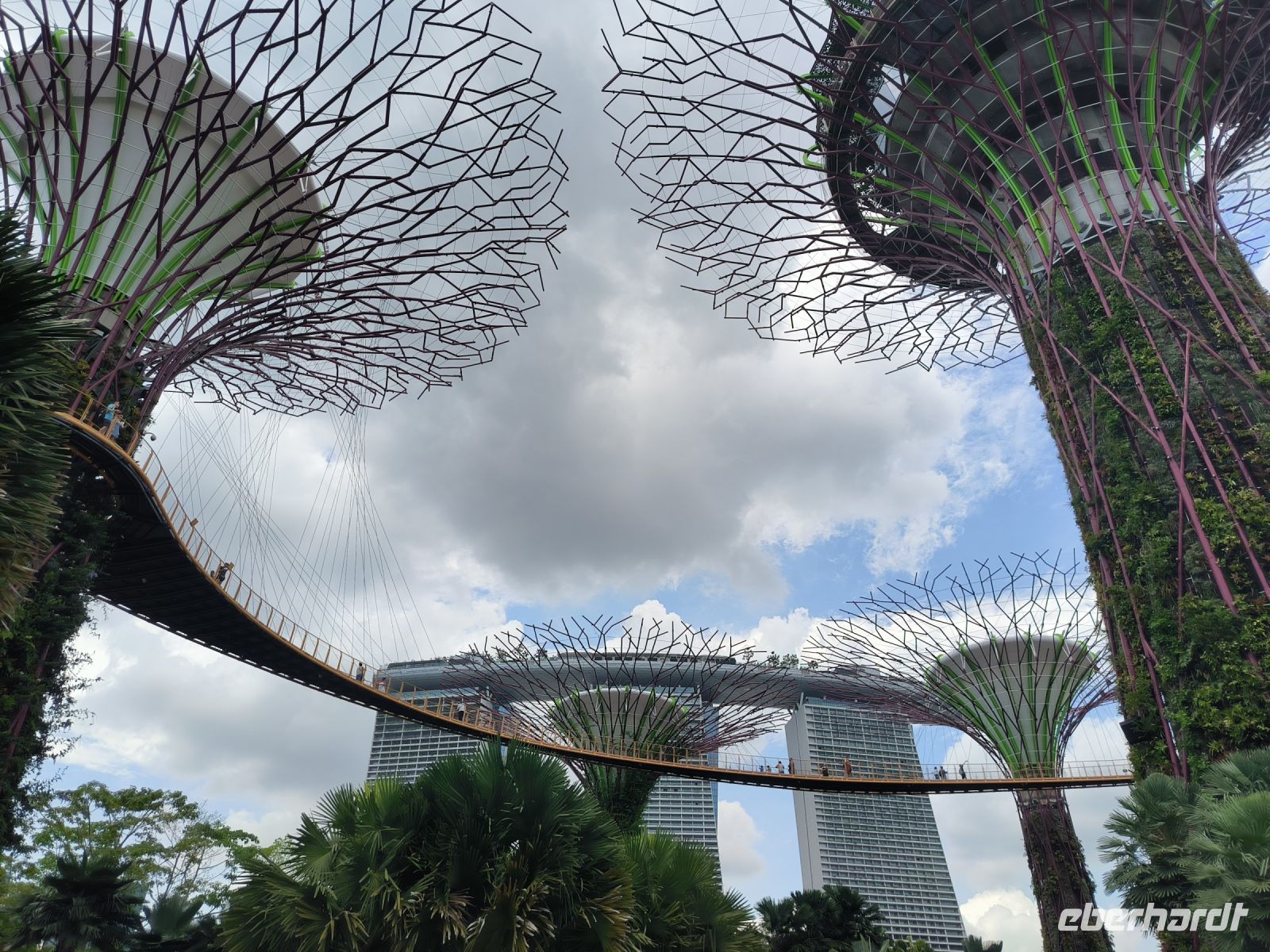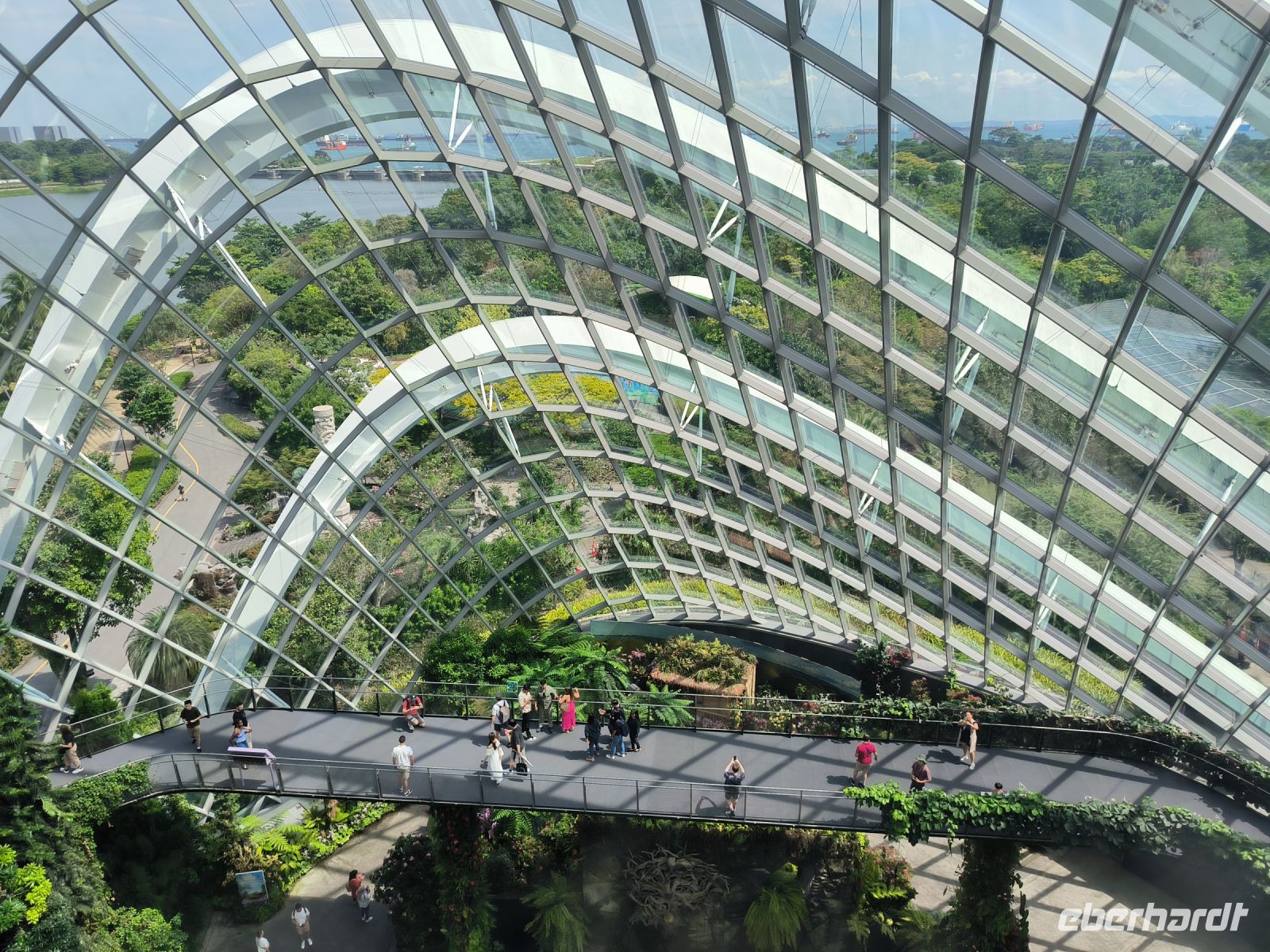 Natürlich darf auch ein Besuch der Gardens By the Bay nicht fehlen. Die sogenannten Supertrees wirken wie gigantische Pilze von einem anderen Stern und sehen nicht nur schön aus. Die 25 bis 50 Meter hohen vertikalen Gärten sammeln Regenwasser, gewinnen Sonnenenergie und fungieren als Belüftungskanäle für die Gewächshäuser des Parks, die wir als nächstes auch besichtigen. Im Flower Dome (Blumen-Treibhaus) können wir kühles, trockenes Klima erleben und mehr als 32.000 Pflanzen aus 160 verschiedenen Arten, Kulturformen und Varianten bestaunen. Im ebenfalls kühlen Nebelwald (Cloud Forest Dome) steigen wir auf den 35 Meter hohen Nebelberg, der mit Orchideen, Farnen und Bromelien übersät ist und einen spektakulären Innenwasserfall beherbergt.