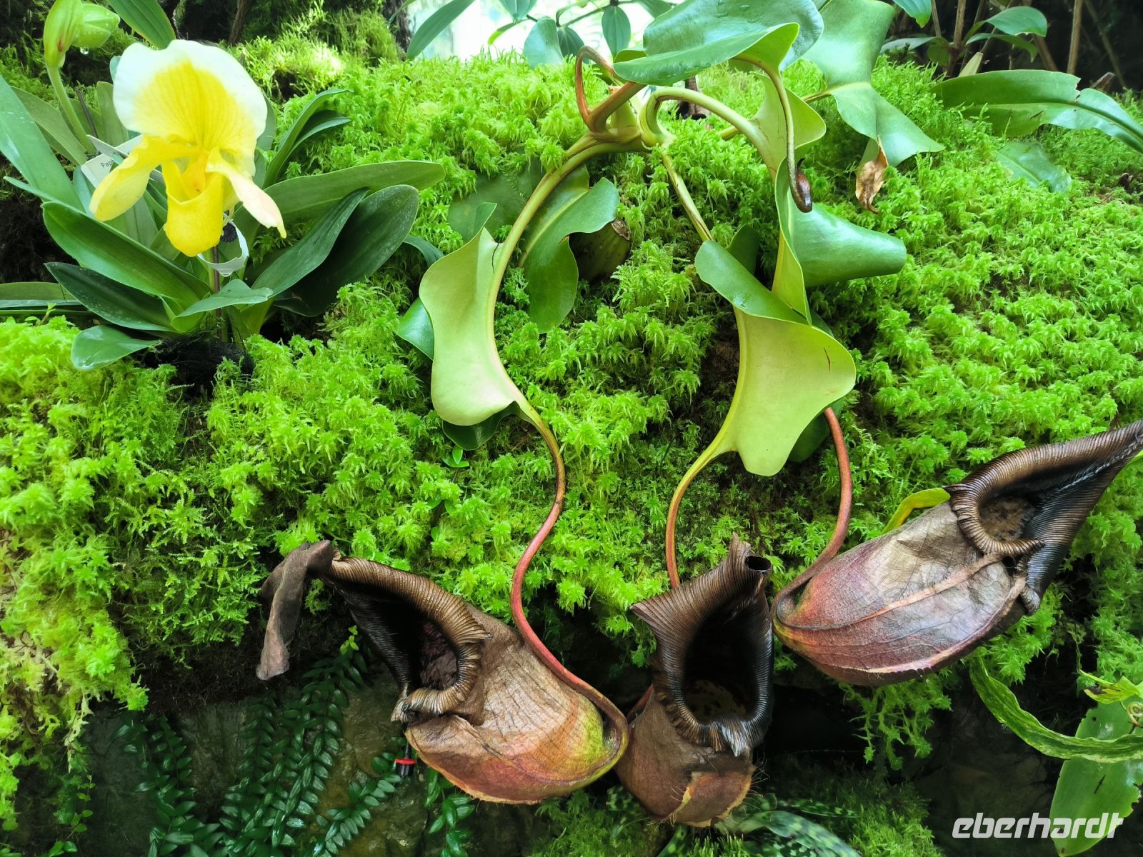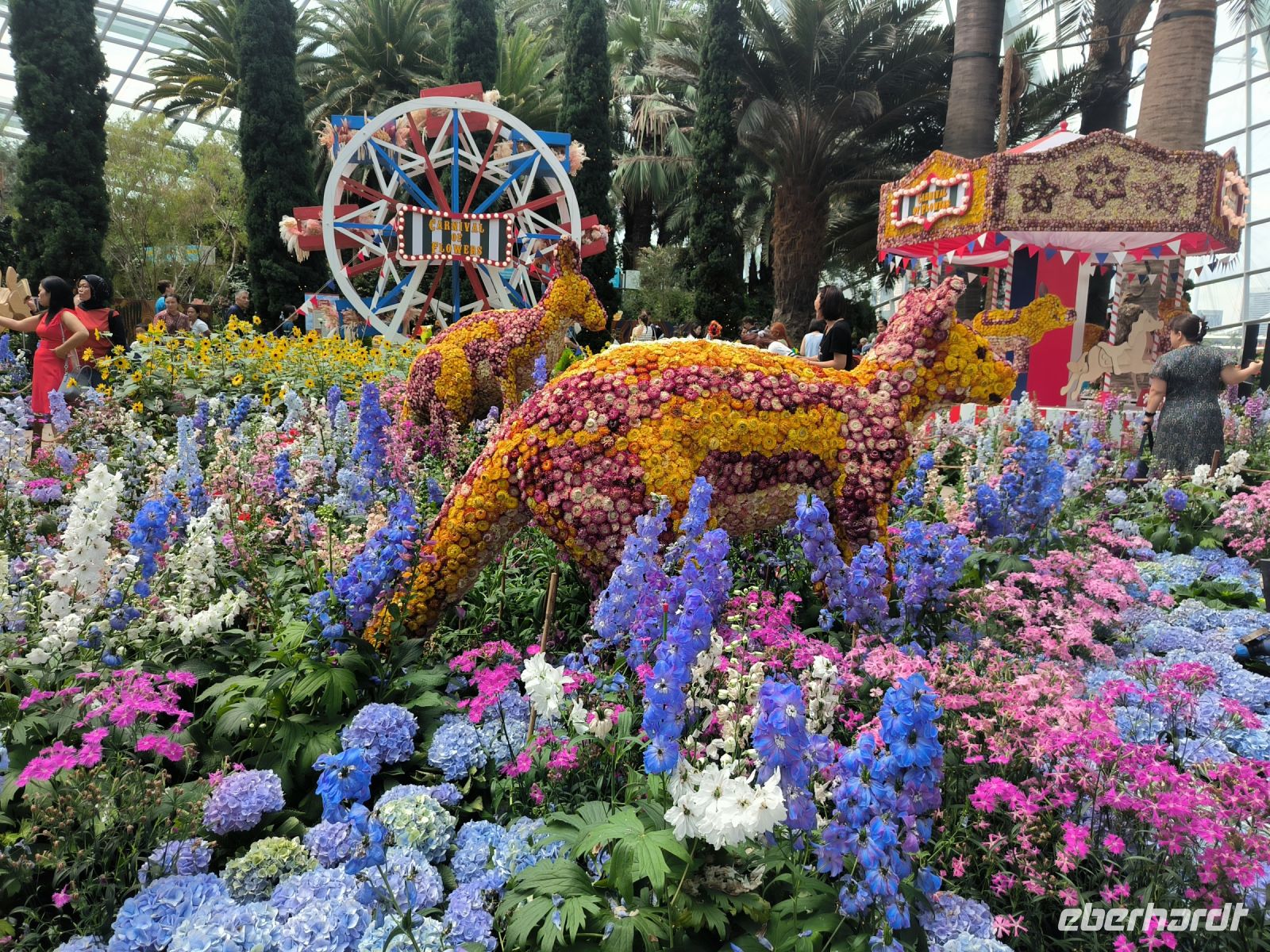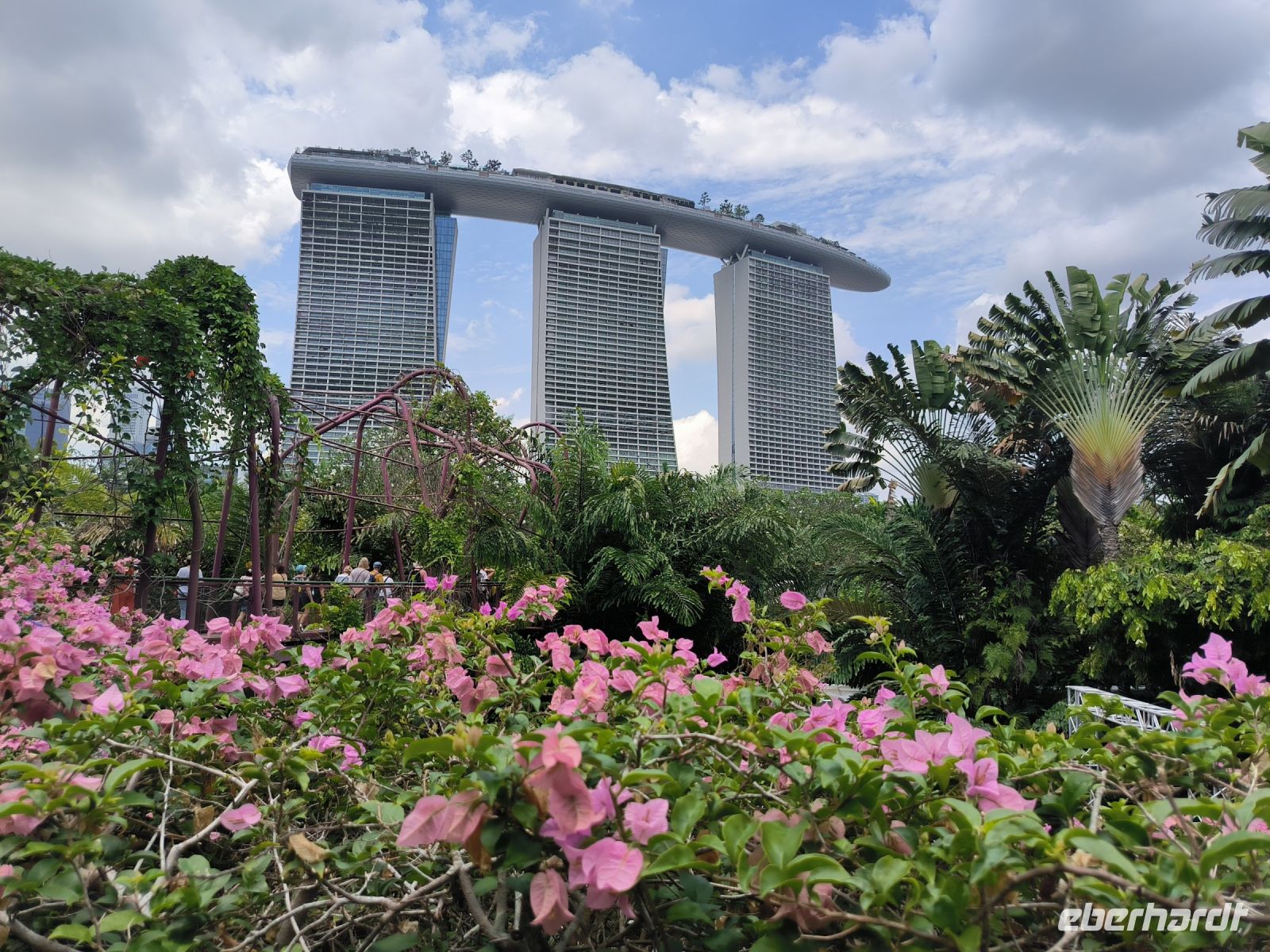Natürlich darf auch ein Besuch der Gardens By the Bay nicht fehlen. Die sogenannten Supertrees wirken wie gigantische Pilze von einem anderen Stern und sehen nicht nur schön aus. Die 25 bis 50 Meter hohen vertikalen Gärten sammeln Regenwasser, gewinnen Sonnenenergie und fungieren als Belüftungskanäle für die Gewächshäuser des Parks, die wir als nächstes auch besichtigen. Im Flower Dome (Blumen-Treibhaus) können wir kühles, trockenes Klima erleben und mehr als 32.000 Pflanzen aus 160 verschiedenen Arten, Kulturformen und Varianten bestaunen. Im ebenfalls kühlen Nebelwald (Cloud Forest Dome) steigen wir auf den 35 Meter hohen Nebelberg, der mit Orchideen, Farnen und Bromelien übersät ist und einen spektakulären Innenwasserfall beherbergt.