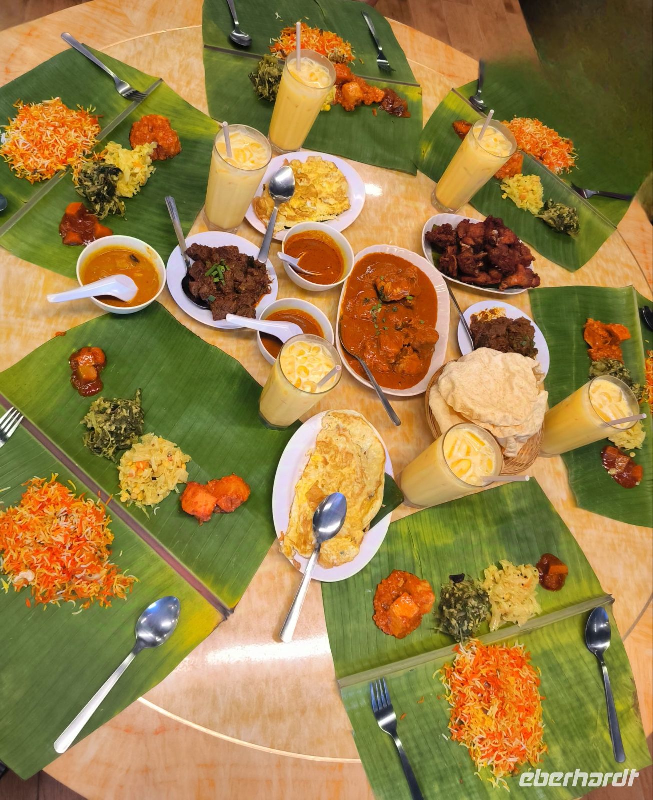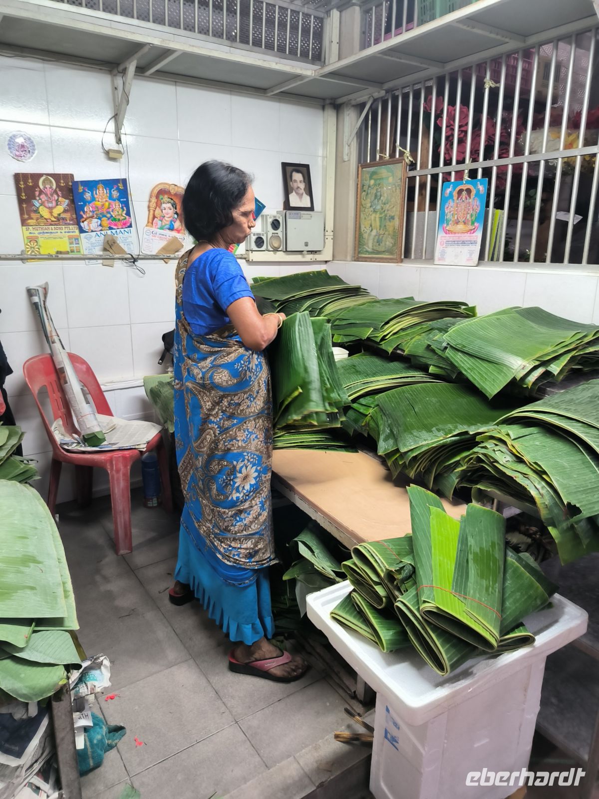 Das Mittagessen wird uns heute traditionell malaysisch-indisch auf einem Bananenblatt serviert. Das war sehr üppig und sehr gut. Am Ende klappen alle ihre Bananenblätter nach innen zum Zeichen, dass es ihnen geschmeckt hat.