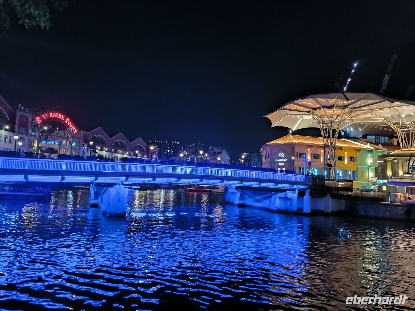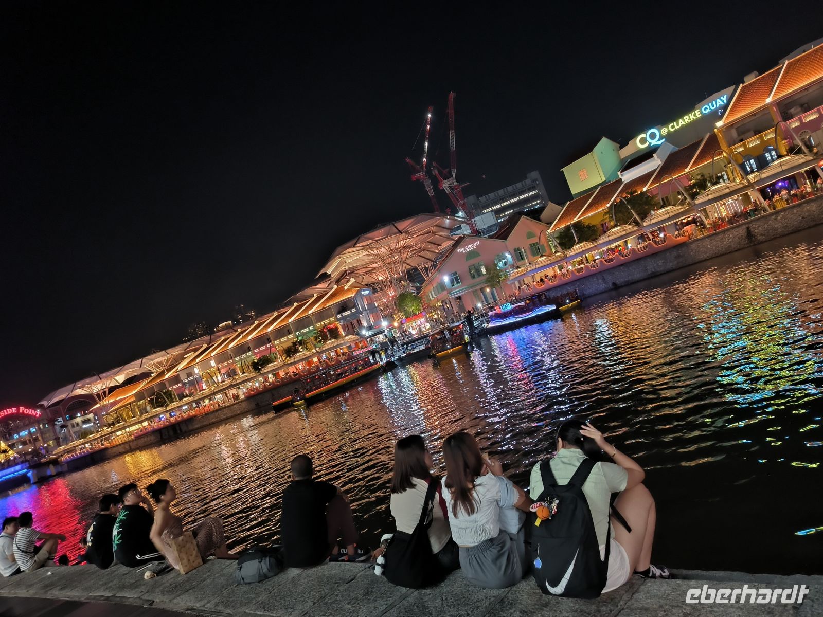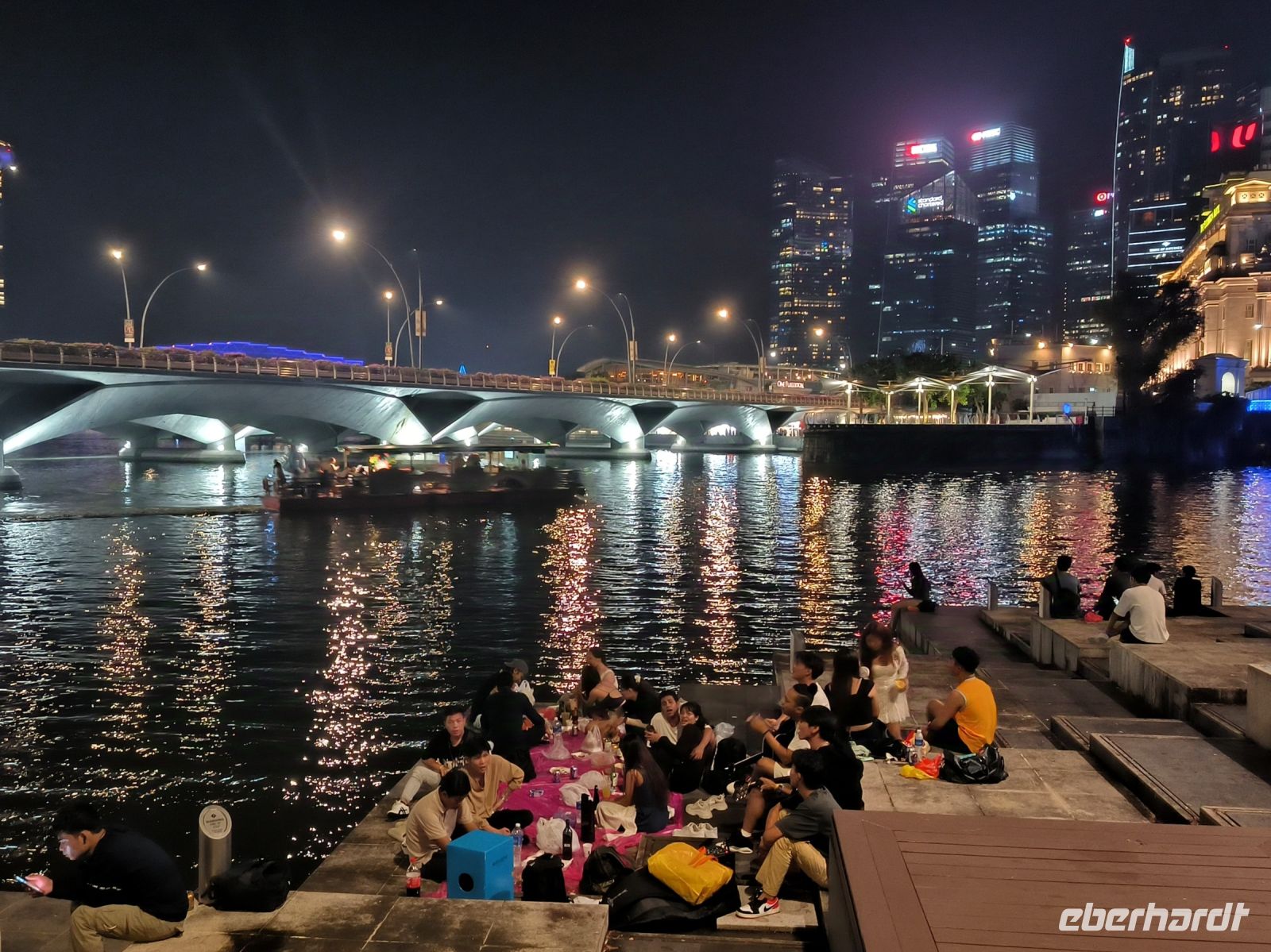 Nach der Show machen wir die Runde um Marina Bay komplett, über die Helix Bridge und an der Esplanade (dem Durian-förmigen Eventcenter) vorbei bis zum Clarke Quay, wo noch einige gemütlich auf den Stufen sitzen bleiben, um den Abend ausklingen zu lassen.
