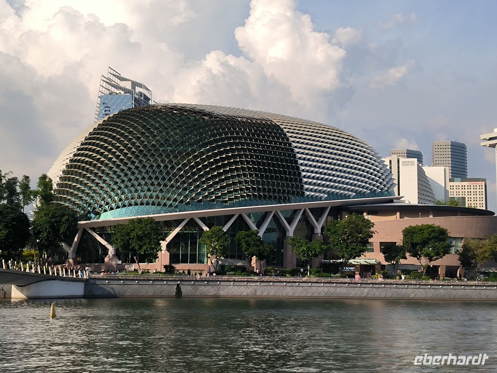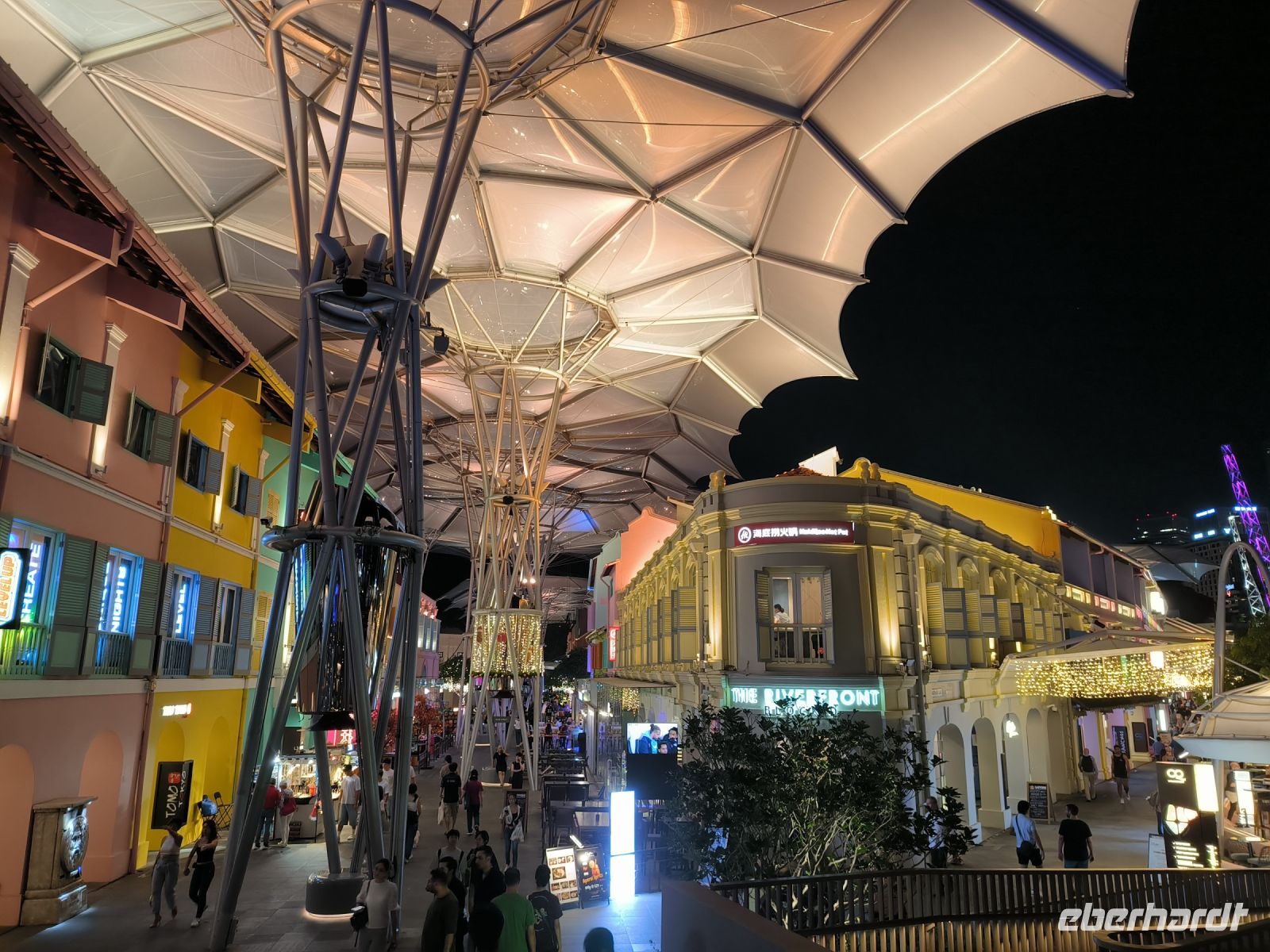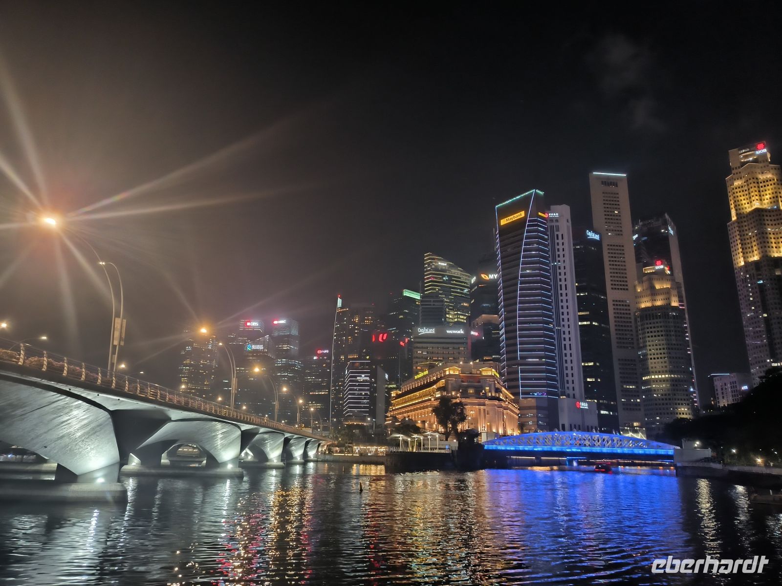 Nach der Show machen wir die Runde um Marina Bay komplett, über die Helix Bridge und an der Esplanade (dem Durian-förmigen Eventcenter) vorbei bis zum Clarke Quay, wo noch einige gemütlich auf den Stufen sitzen bleiben, um den Abend ausklingen zu lassen.