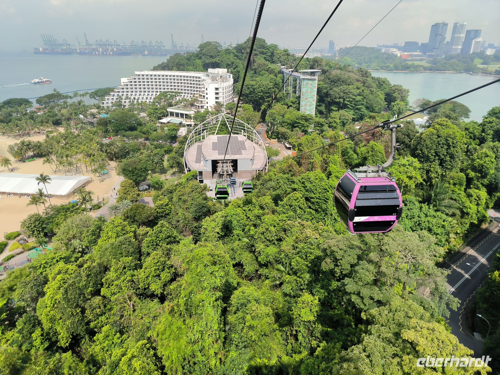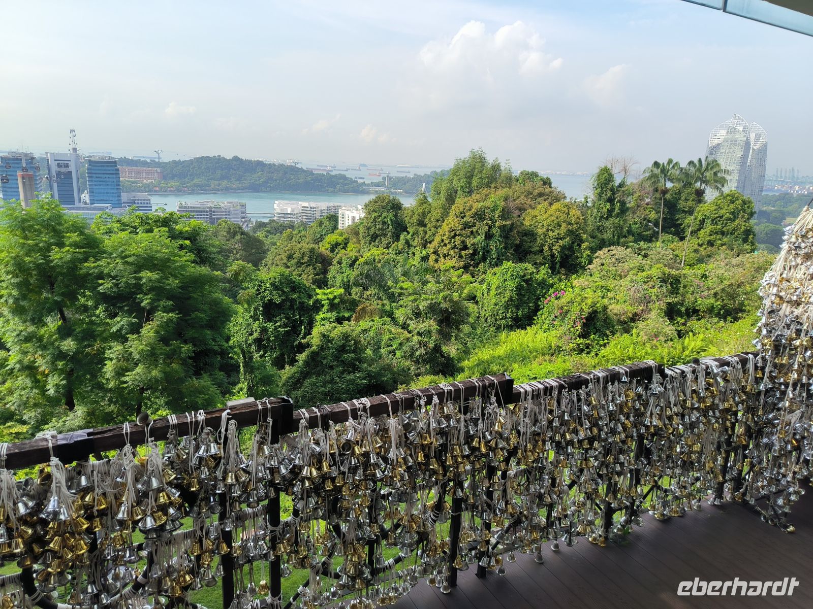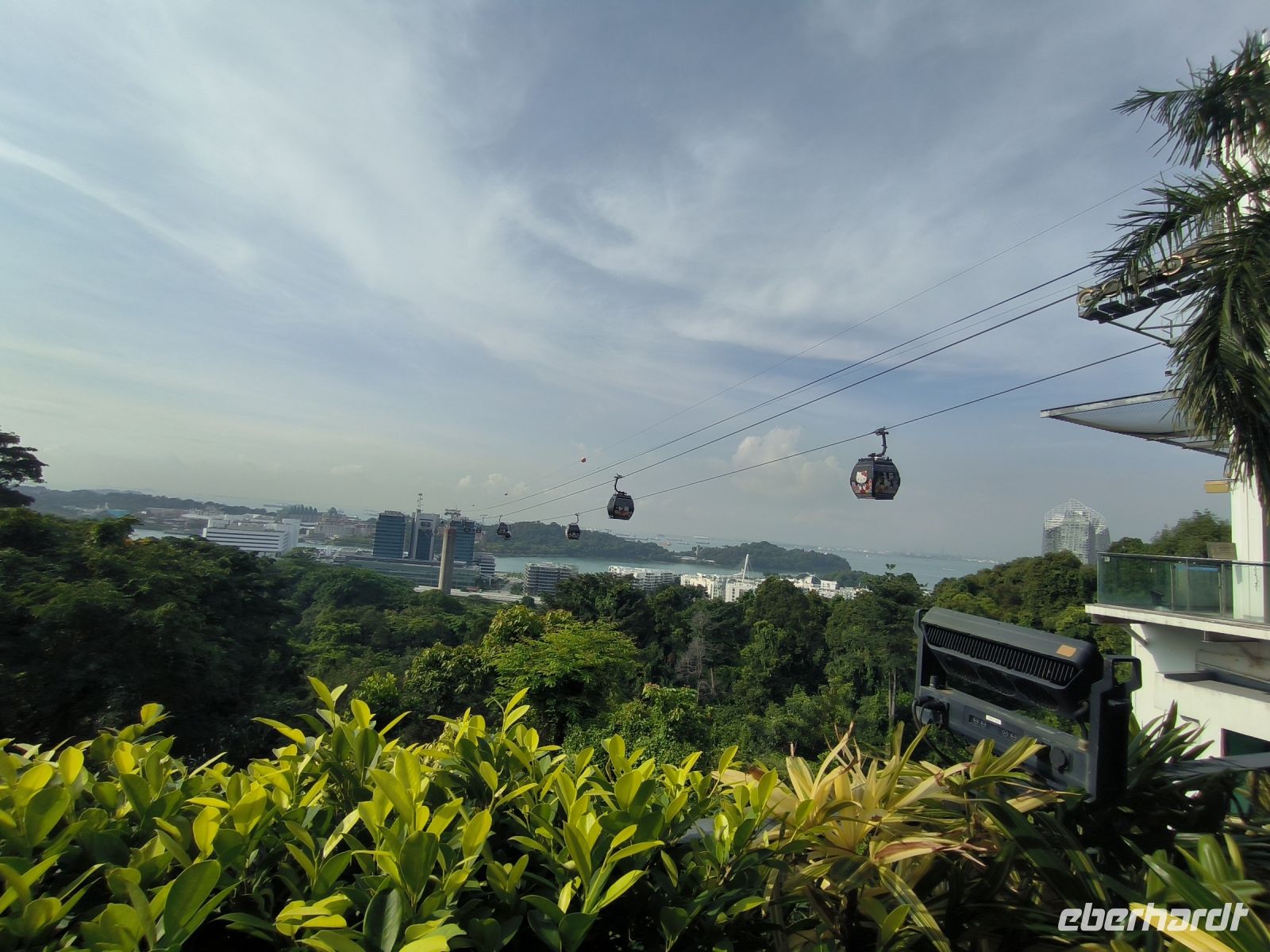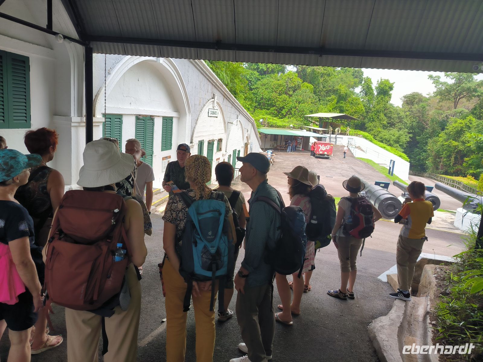 Das Frühstücksbuffet im Hotel ist wirklich üppig und teilweise mit für uns ungewohnten Speisen gefüllt. Bus, futuristische Seilbahn, Minitram und Monotrail werden heute unsere Fortbewegungsmittel sein. Pünktlich 9 Uhr steht unsere Bibi vor dem Hotel und wir fahren zum 105 Meter hohen Mount Faber, wo uns eine spannende Seilbahnfahrt zum 5 km² kleinen Sentosa Island erwartet. Wir fliegen über den Hafen und die Attraktionen der Insel. Über einen Baumwipfelpfad wandern wir zum Fort Seloso, dem ehemaligen britischen Marinestützpunkt, der von der bewegten jüngeren Vergangenheit erzählt.