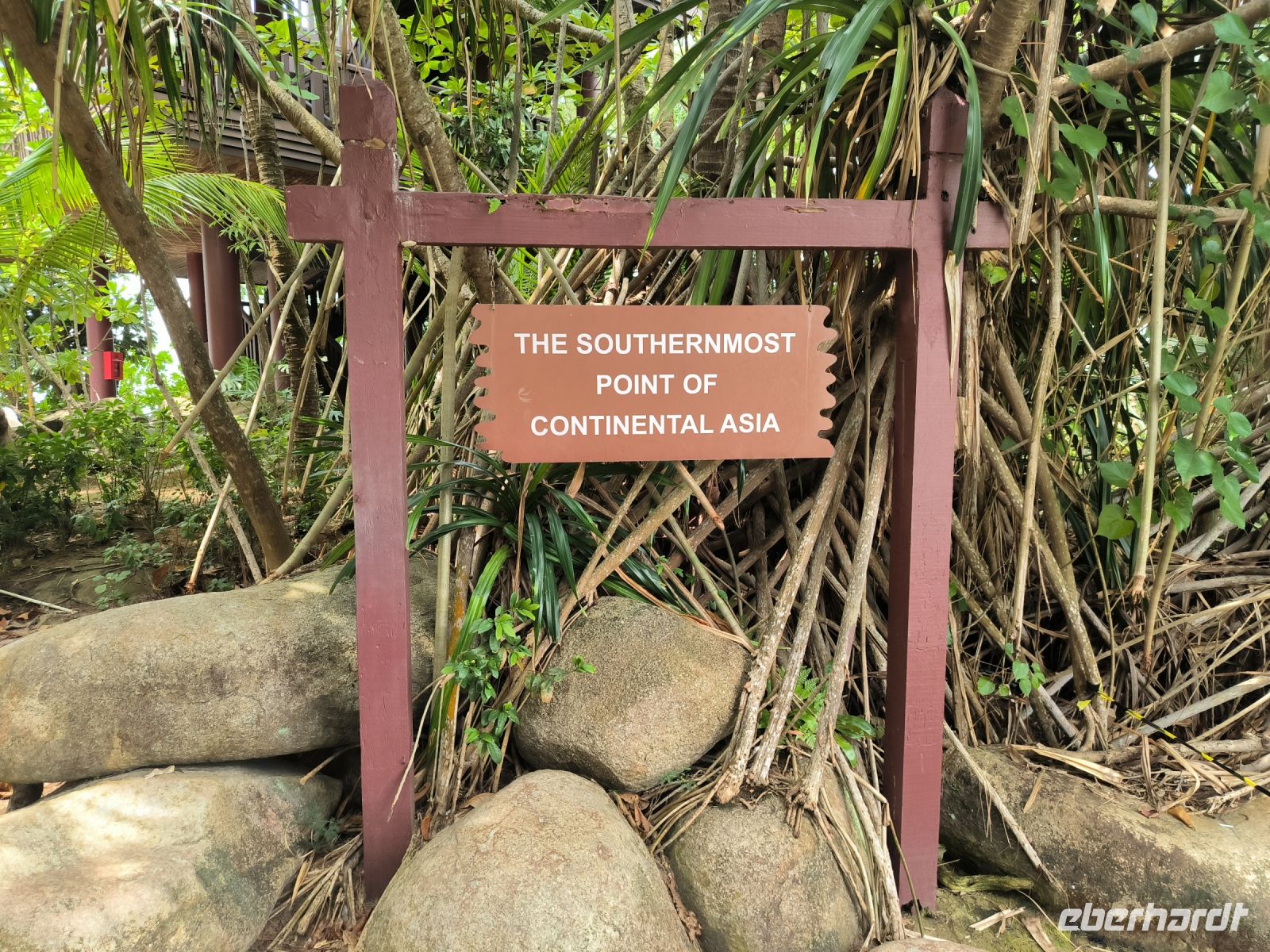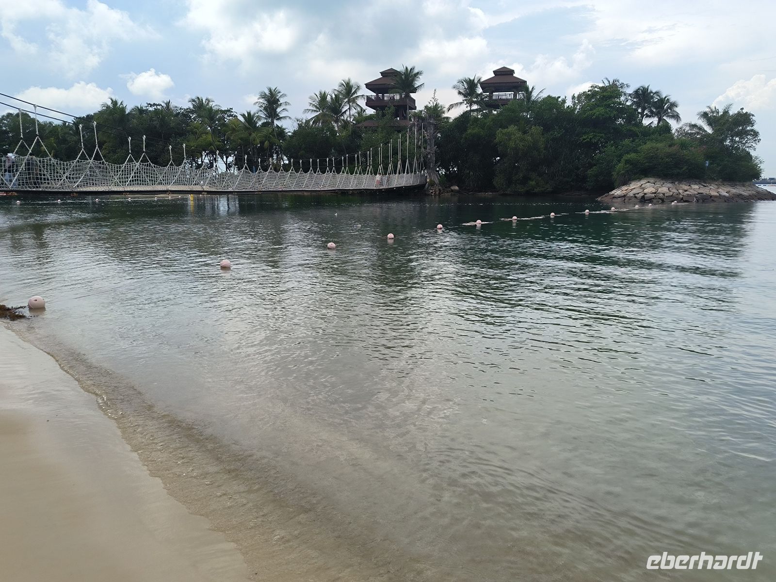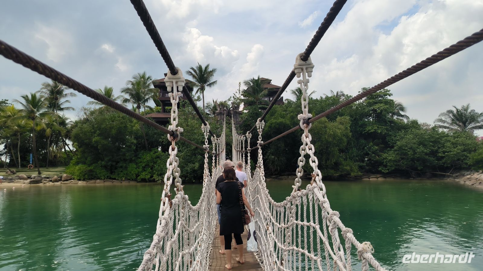 Mit der kleinen Sentosa-Bahn fahren wir zu einer Hängebrücke, die uns schwankend zum südlichsten Punkt Südostasiens bringt. Dann ist es Zeit für einen entspannten Strandspaziergang oder ein Bad im Meer oder eine Kaffeepause.