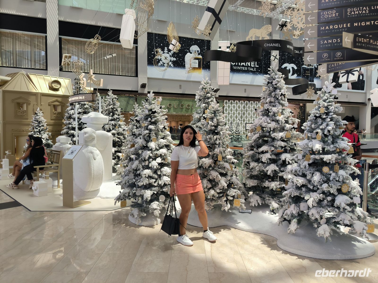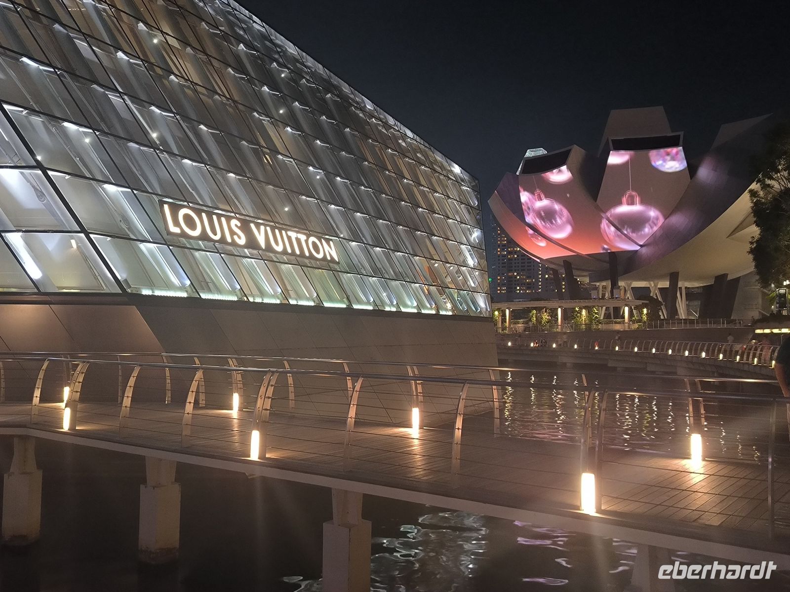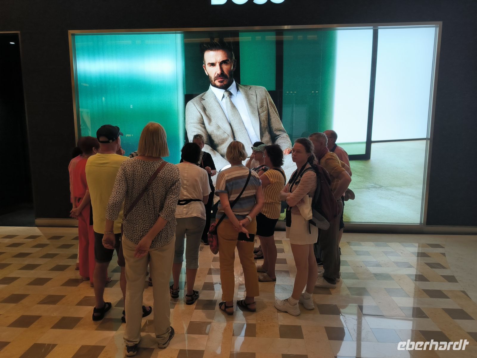 Nun geht es hinauf zum Skypark von Marina Bay Sands, einer futuristischen Plattform, die in 200 m Höhe errichtet wurde. Wir haben einen grandiosen 360-Grad-Blick auf die Skyline von Singapur bis nach Malaysia. Anschließend geht es wieder hinab in die Shopping Mall, wo fast alle internationalen, hochpreisigen Uhren-, Lederwaren-, Schmuck- und Bekleidungsmarken vertreten sind und wir ein kleines Intermezzo mit David Beckham haben.
