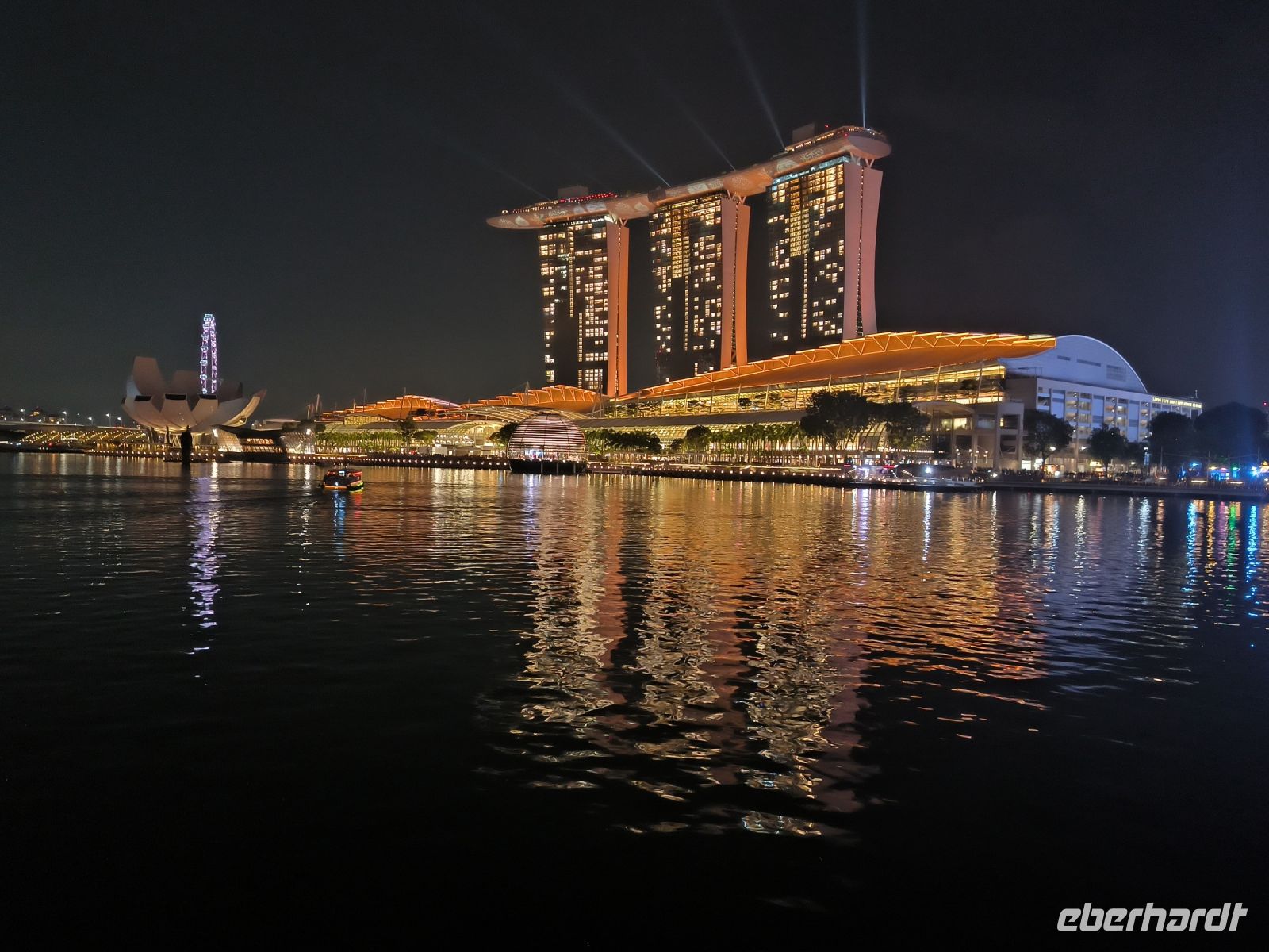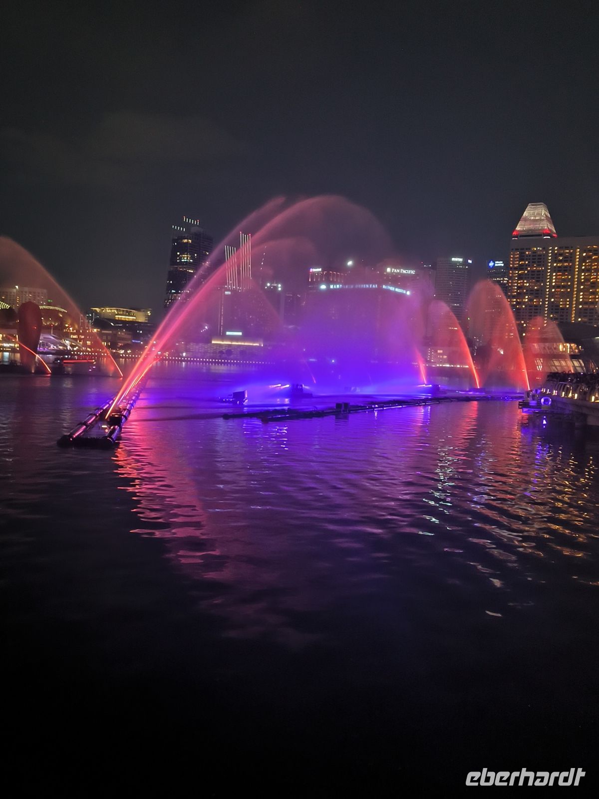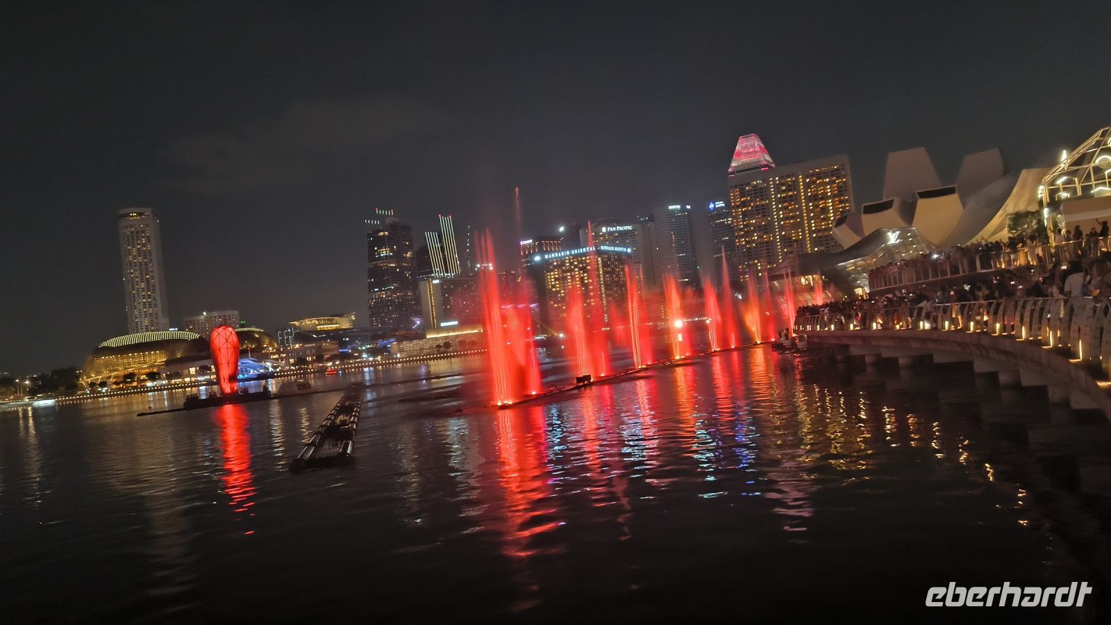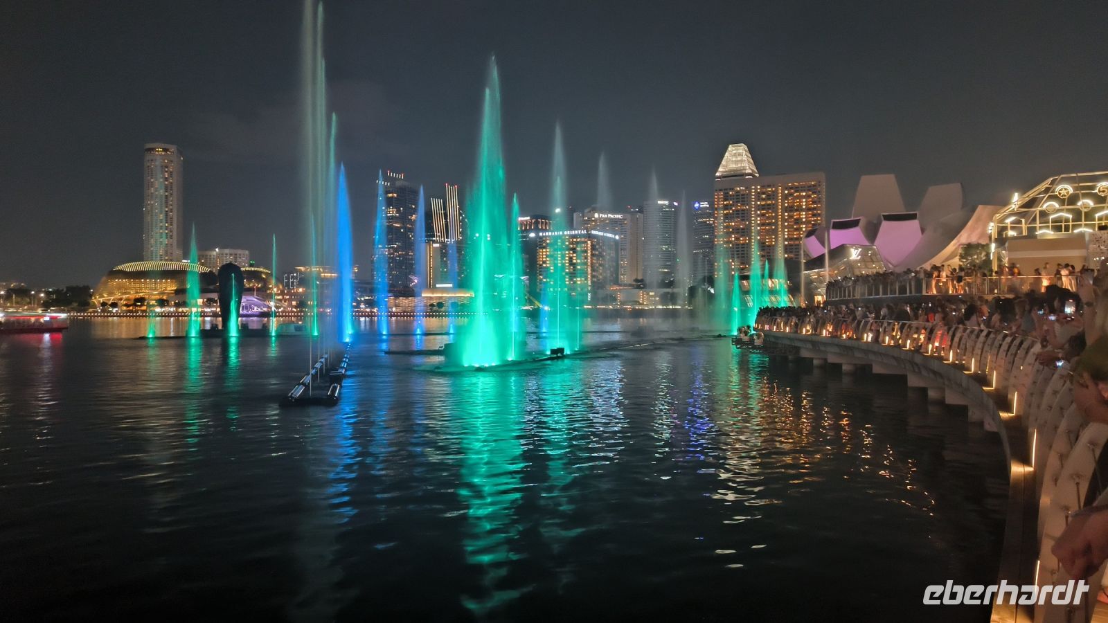 Unser Abendessen haben wir an diesem Tag extra früh bestellt, damit wir es rechtzeitig zur Lichtershow am Marina Bay Sands schaffen. Gemeinsam gehen wir vom Hotel los und müssen doch einen schnellen Schritt auflegen, um auf die andere Seite direkt vor das Geschehen zu kommen. Es ist wirklich beeindruckend, wie hier mit Licht und Wasser tolle Effekte erzeugt werden. Die ganze Stadt entwickelt am Abend noch einmal eine ganz besondere Atmosphäre.