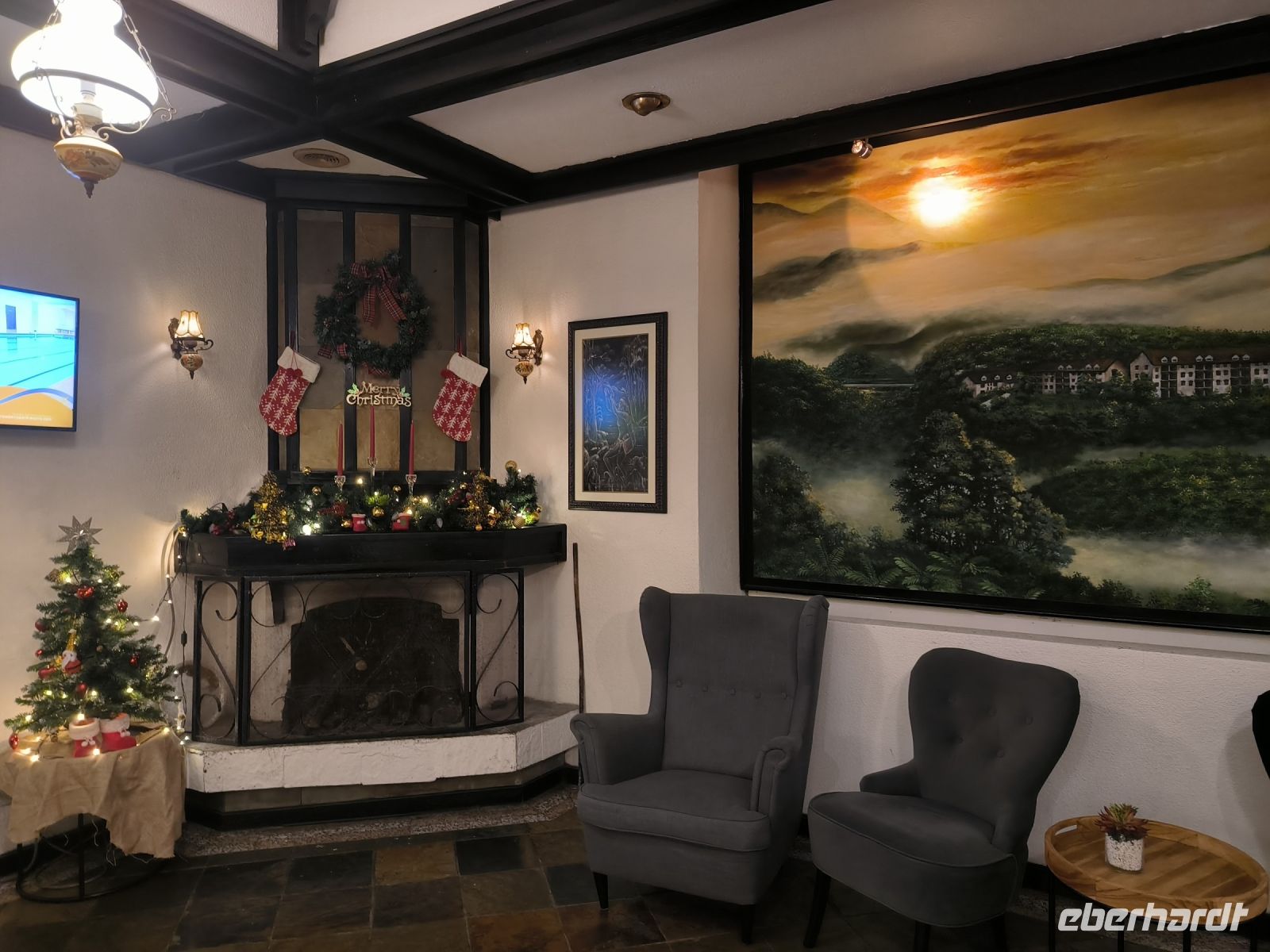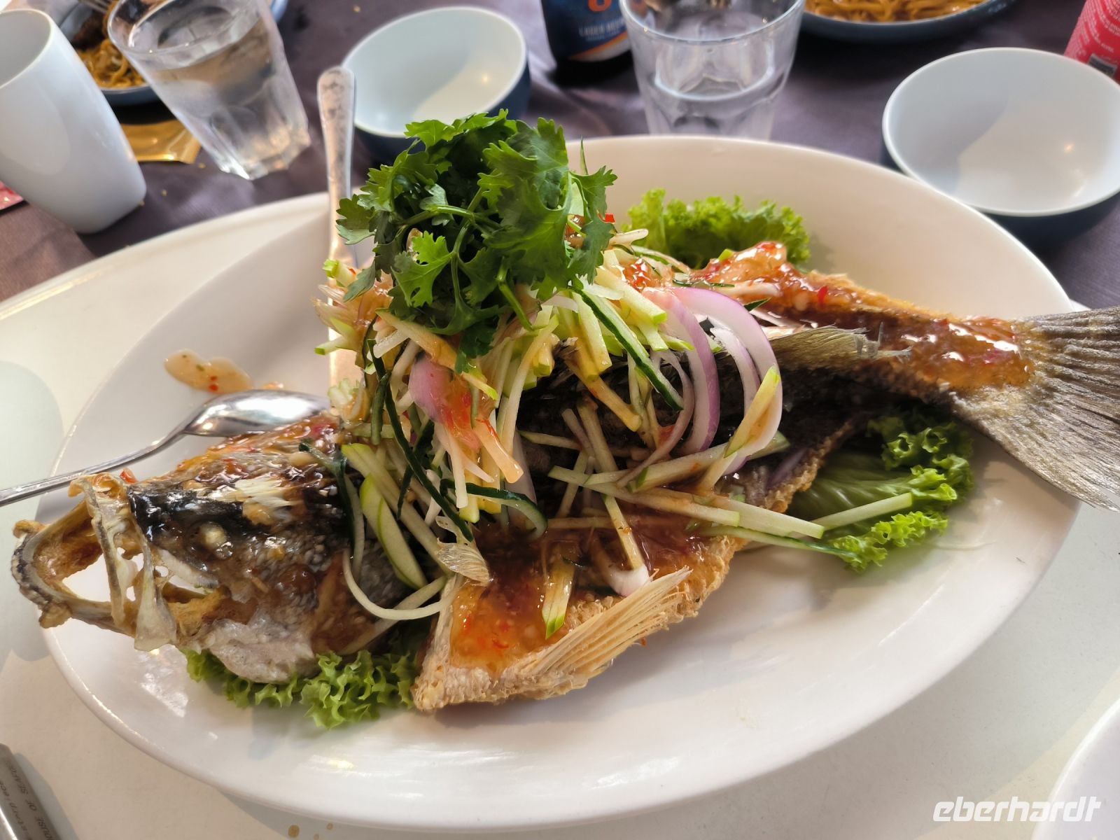 Nach kurzer Weiterfahrt kommen wir in Ipoh an, wo unser Mittagessen in einem lokalen Restaurant auf uns wartet. Perfektes Timing, denn genau als wir vor dem Restaurant ankommen, schüttet es wie aus Eimern. Das Essen im freundlichen „Miners Arms est. 1978“ schmeckt uns dafür umso besser.