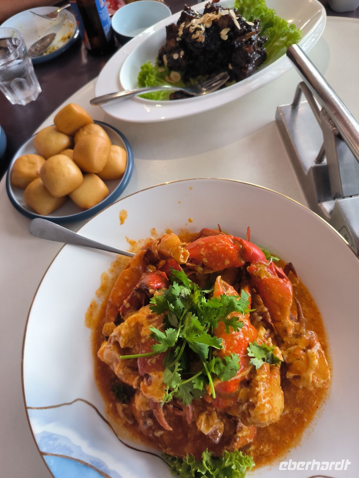 Danach führt uns ein kurzer Spaziergang zum Quayside Dining Singapore Seafood Restaurant. Hier gibt es Versionen von Singapurs inoffiziellen Nationalgerichten, wie die berühmte Chili Crab. Wir sind nun nicht die Meister im Krabben knacken, aber wir lassen es uns trotzdem schmecken, besonders die Coffee Ribs.