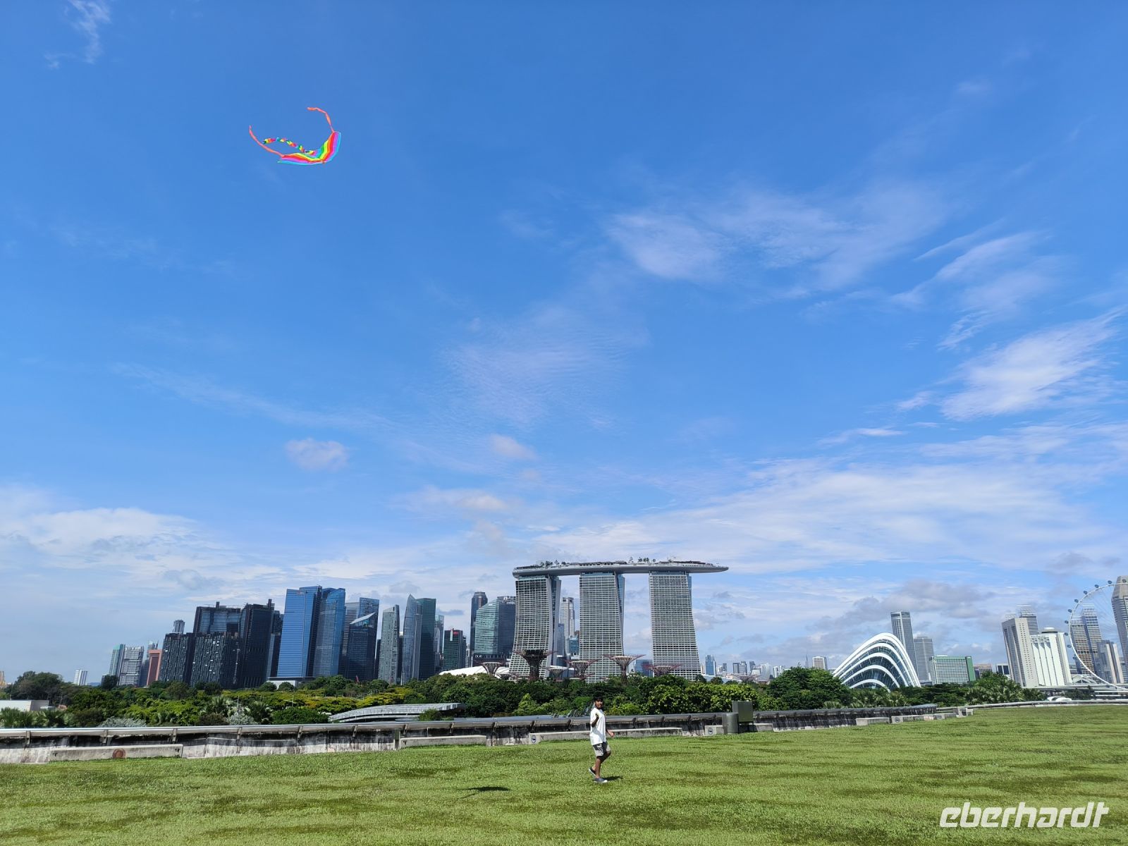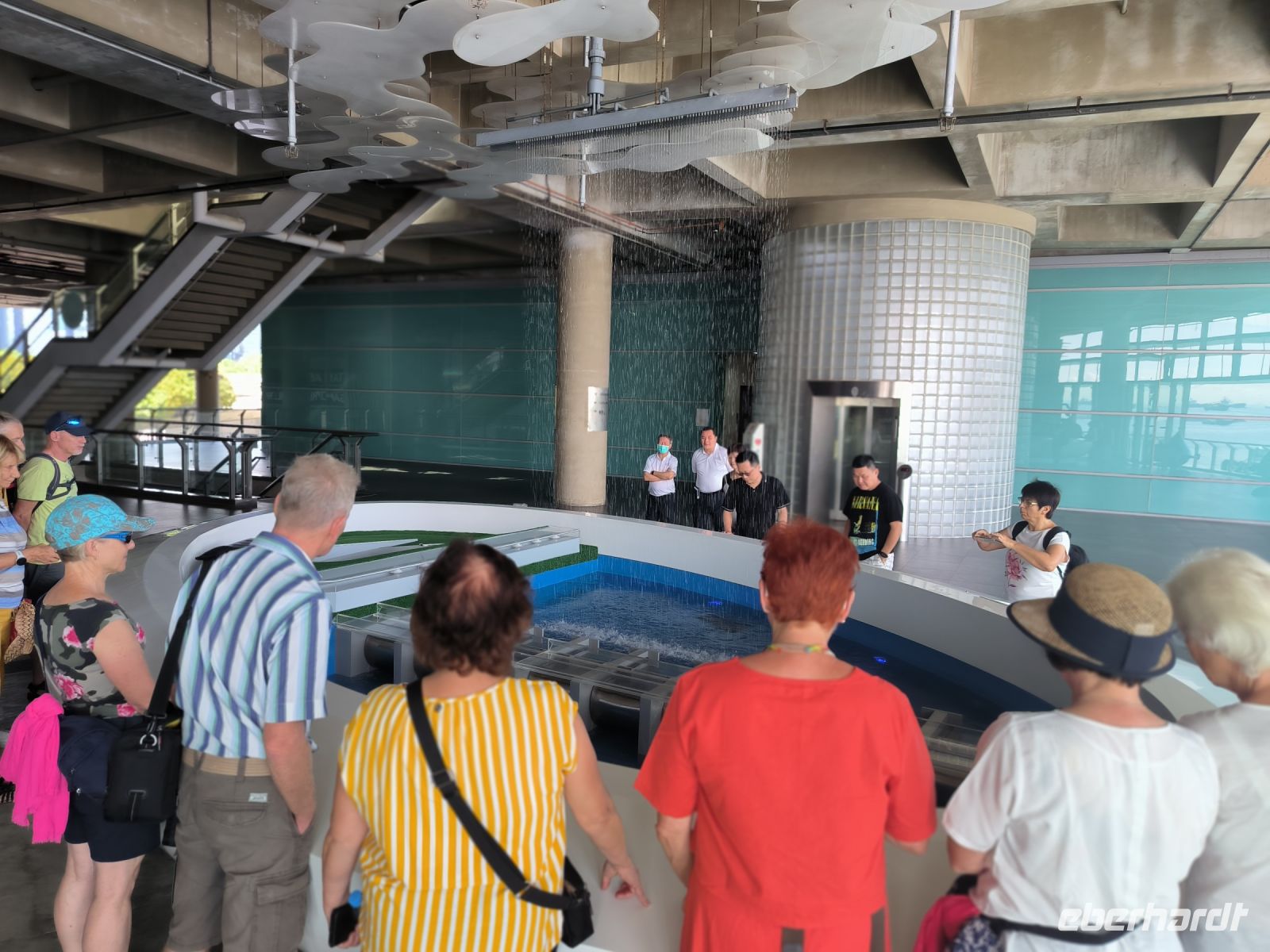 Unser erstes Ziel an diesem Tag ist Marina Barrage, die über die Mündung des 350 m breiten Marina Channel gebaut wurde. Sie dient nicht nur als Wasserquelle, sondern spielt auch eine wichtige Rolle beim Hochwasserschutz und verfügt über neun Stahltore, die als Gezeitensperre fungieren, um hohe Gezeiten abzuhalten und überschüssiges Regenwasser bei starkem Regen aus dem Stausee abzulassen. Sie dient auch als Erholungsort, man kann Drachen steigen lassen und den tollen Ausblick bewundern. Weil Trinkwasser in Singapur eine knappe und kostbare Ressource ist, hat das Land eine Wassermanagement-Strategie entwickelt: jeden Tropfen Wasser sammeln, Wasser endlos wiederverwenden und Meerwasser entsalzen. Wir erfahren, wie das gelingen kann.