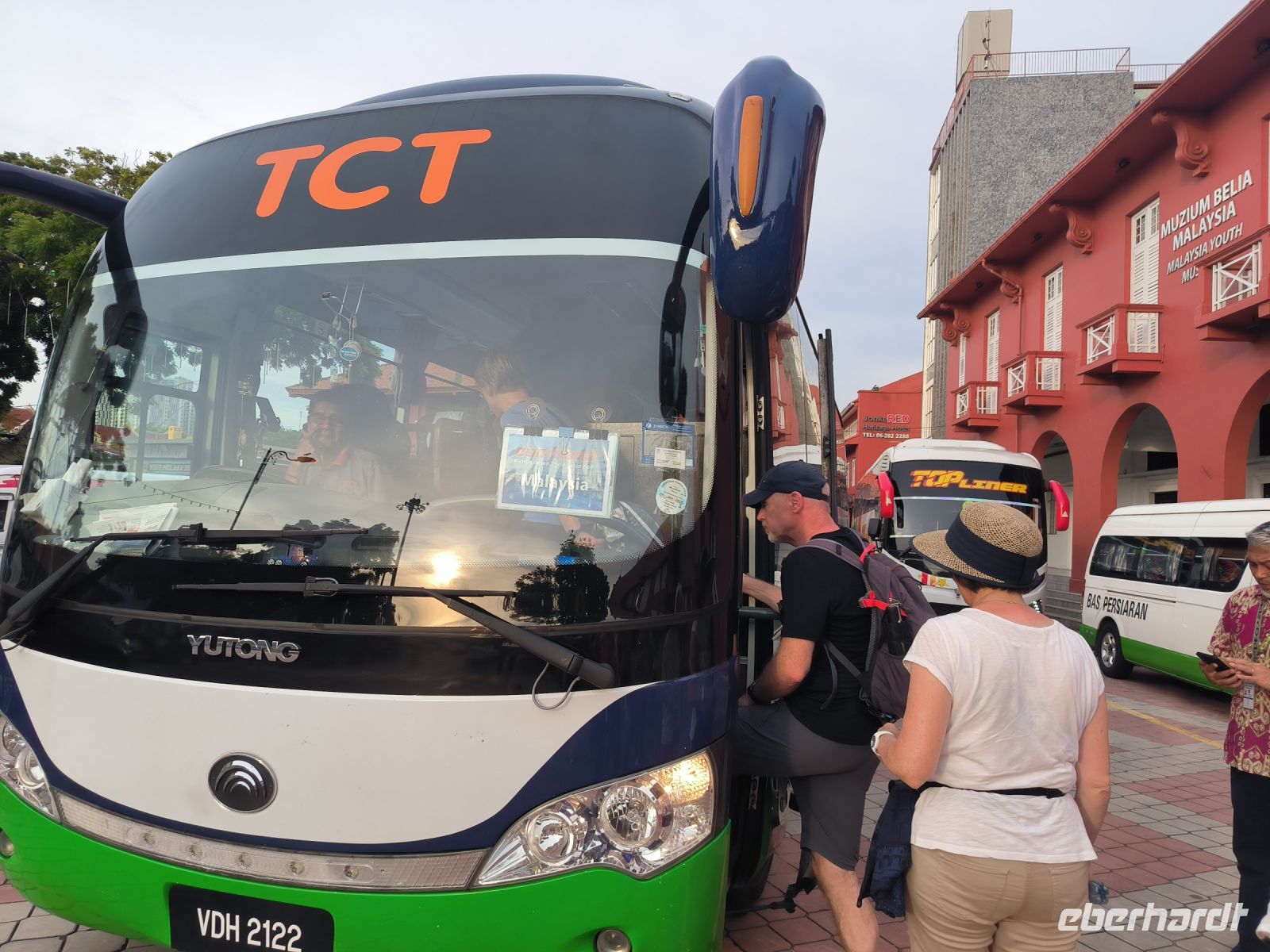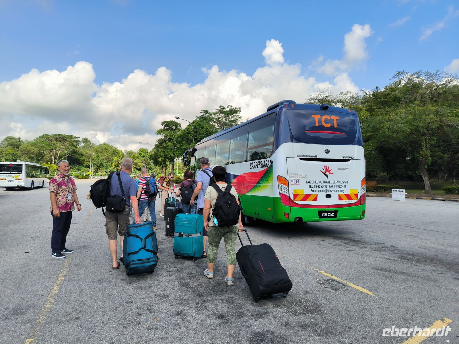 Zusammen mit Bibi fahren wir in Richtung Malaysia, nach etwa einer Stunde Fahrt kommen wir an der Grenze an. Zuerst erfolgt die Ausreise aus Singapur, das geht schnell. Wir steigen wieder in den Bus und fahren auf die andere Seite, wo wir mit unserem Gepäck aussteigen und uns von Bibi verabschieden müssen. Nun wird es spannend. Bei der Einreise hat es problemlos bei den meisten am Automaten geklappt, bei anderen nicht, sie müssen an die Schalter gehen. Einer blieb ganz zurück, er wurde nicht weiter gelassen. Wir finden ihn an einem PC, wo er die Einreiseanmeldung (lag natürlich wie bei allen anderen vor) nochmals ausfüllen muss, was wir gemeinsam getan haben und dann kann auch er endlich durch. Da kommt man gleich ein wenig ins Schwitzen. Wir begrüßen voller Freude unseren neuen malaysischen Guide Mr. Zul und auch ein neuer Bus wartet auf der anderen Seite. Nach kurzer Fahrt machen wir eine Pause, wo wir Geld tauschen können. Nun müssen wir uns an malaysische Ringgit gewöhnen.