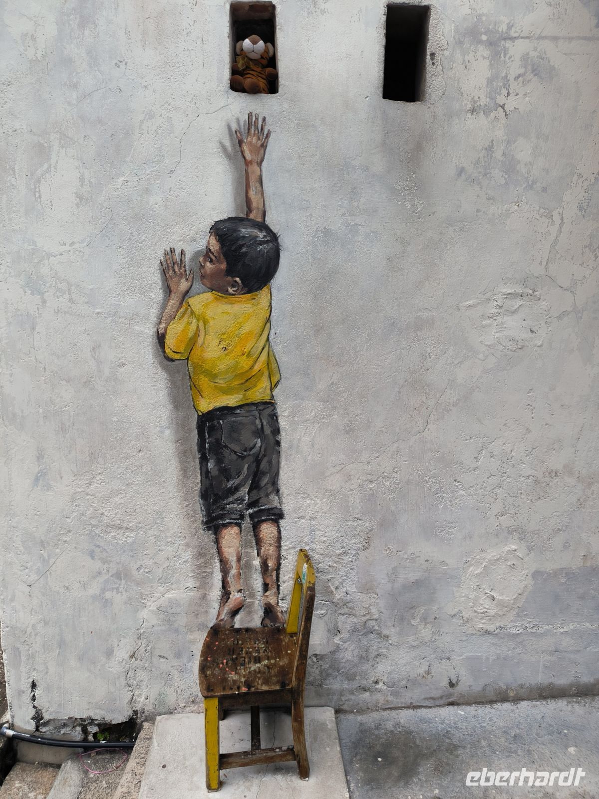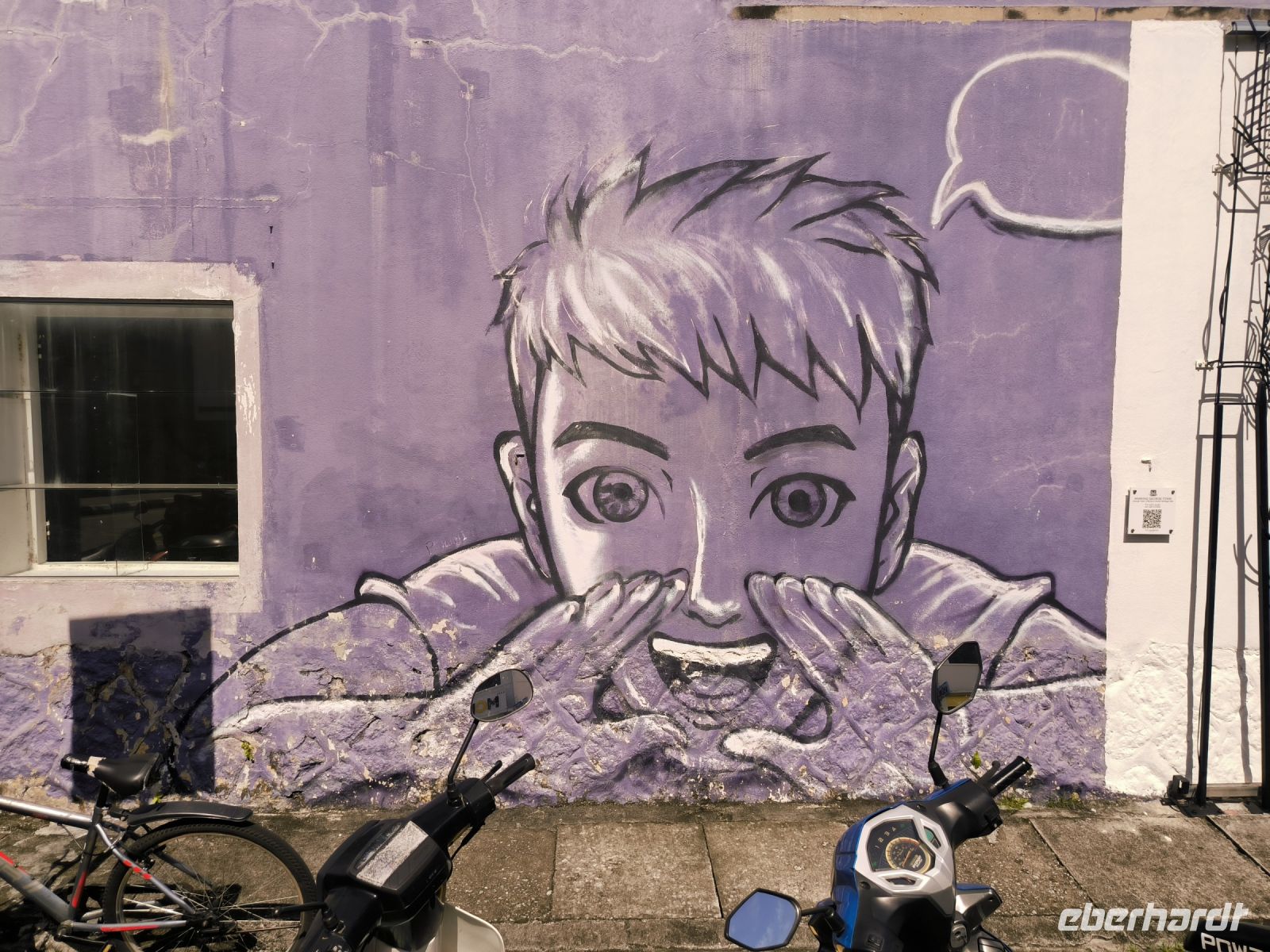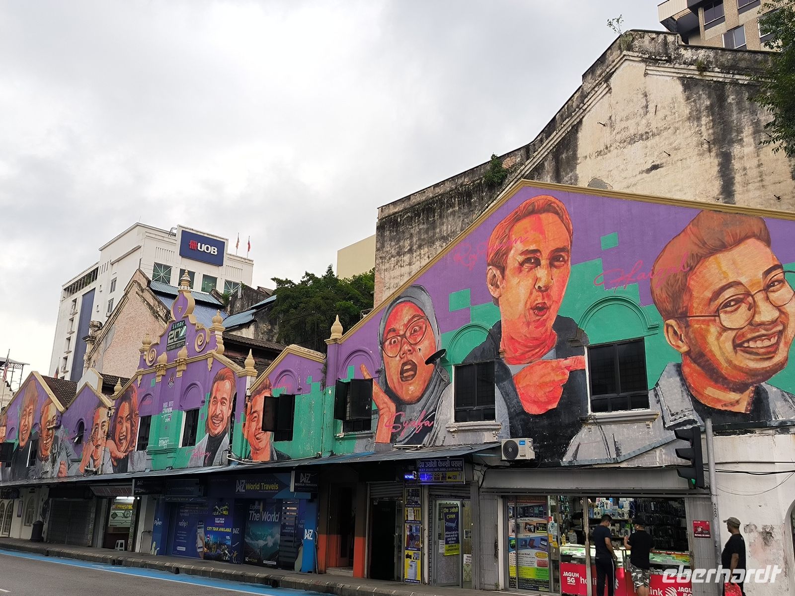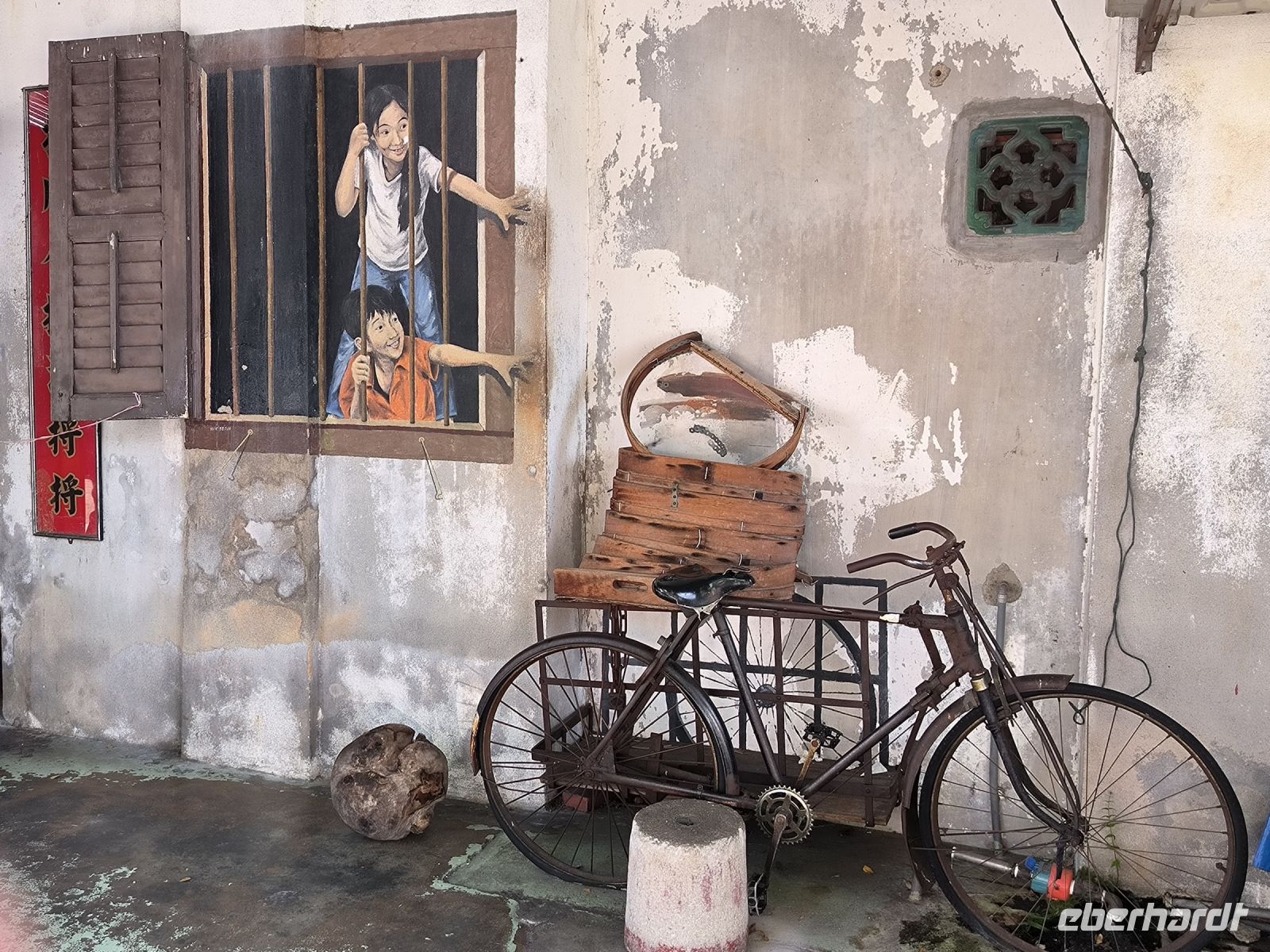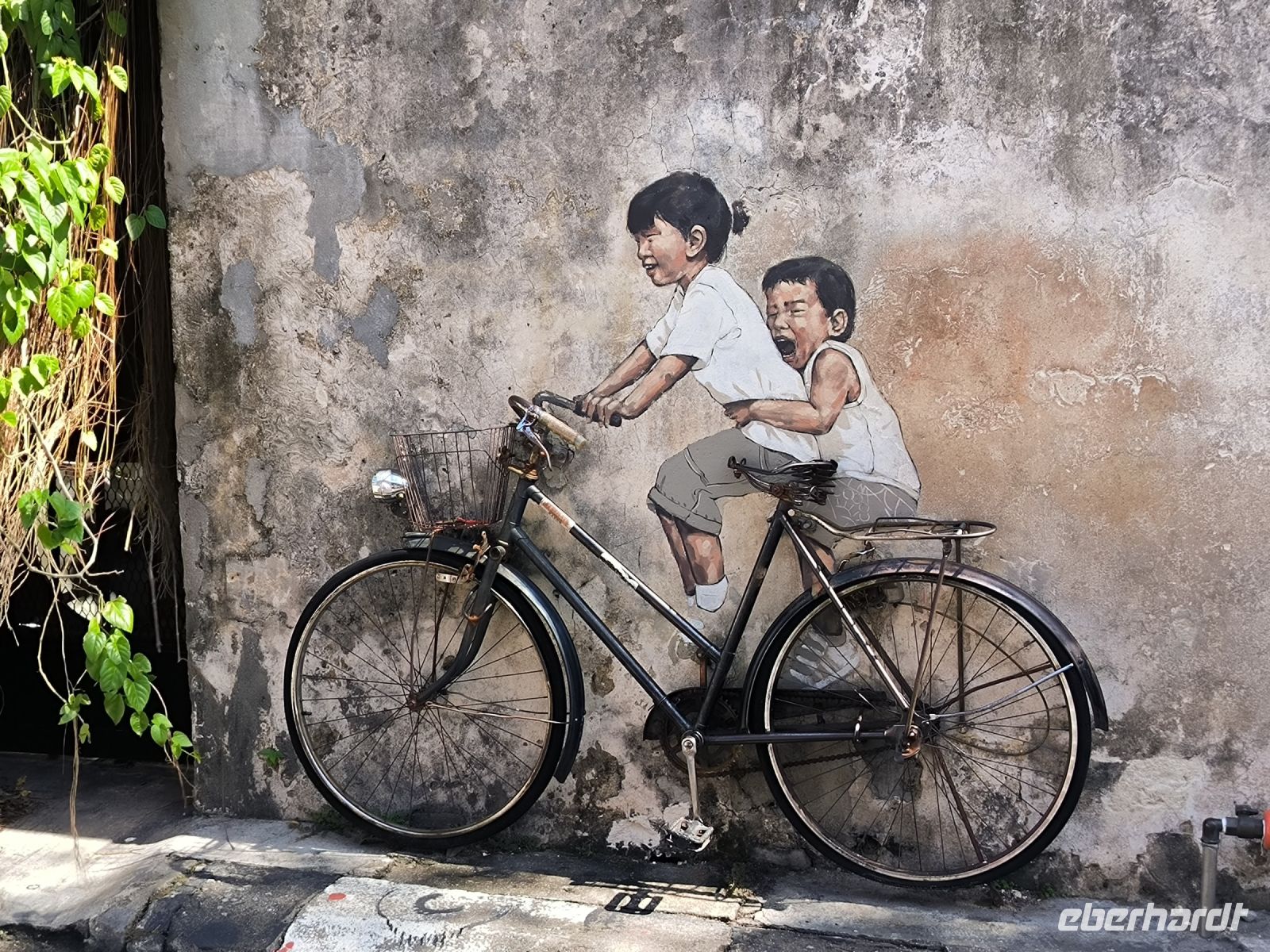 Auch in Penang gibt es jede Menge Streetart zu entdecken. Am berühmtesten Motiv mit den beiden Kindern auf dem Fahrrad vom litauischen Künstler Ernest Zacharevic müssen wir uns anstellen, um einmal einen freien Blick darauf zu erhaschen. Ob wohl auch Banksy hier schon ein Kunstwerk hinterlassen hat?