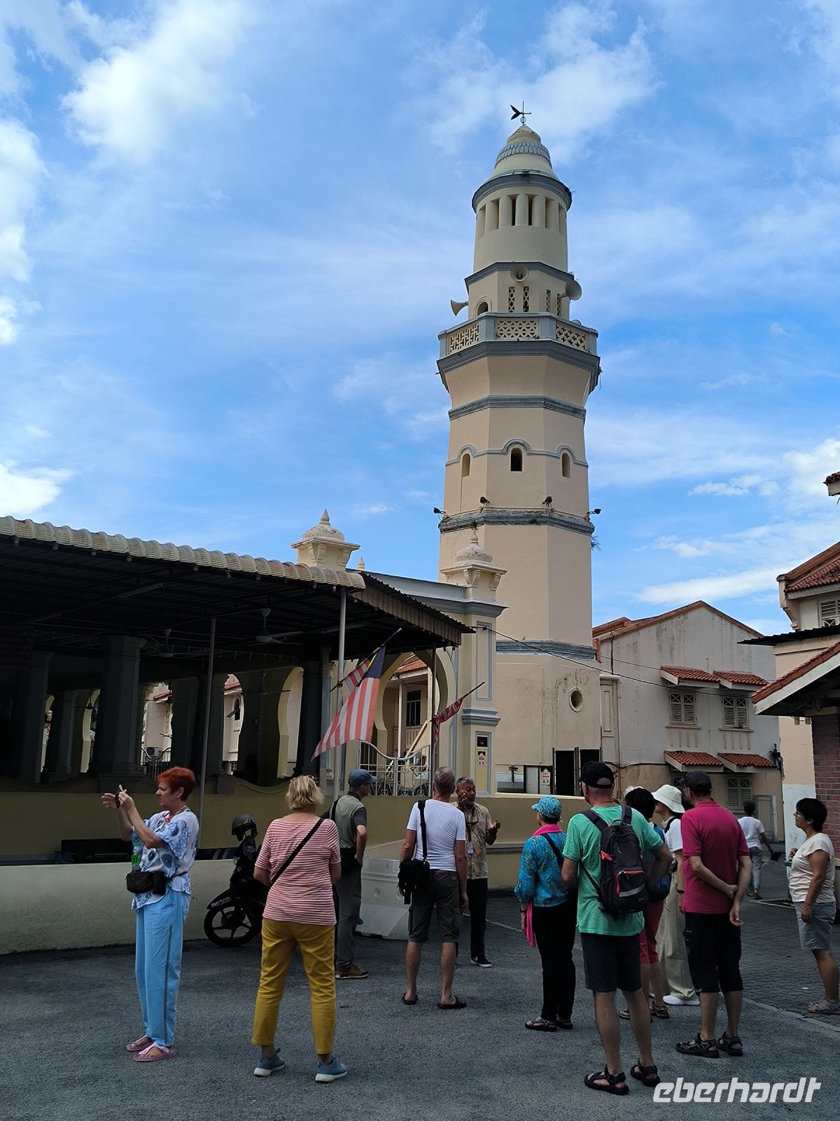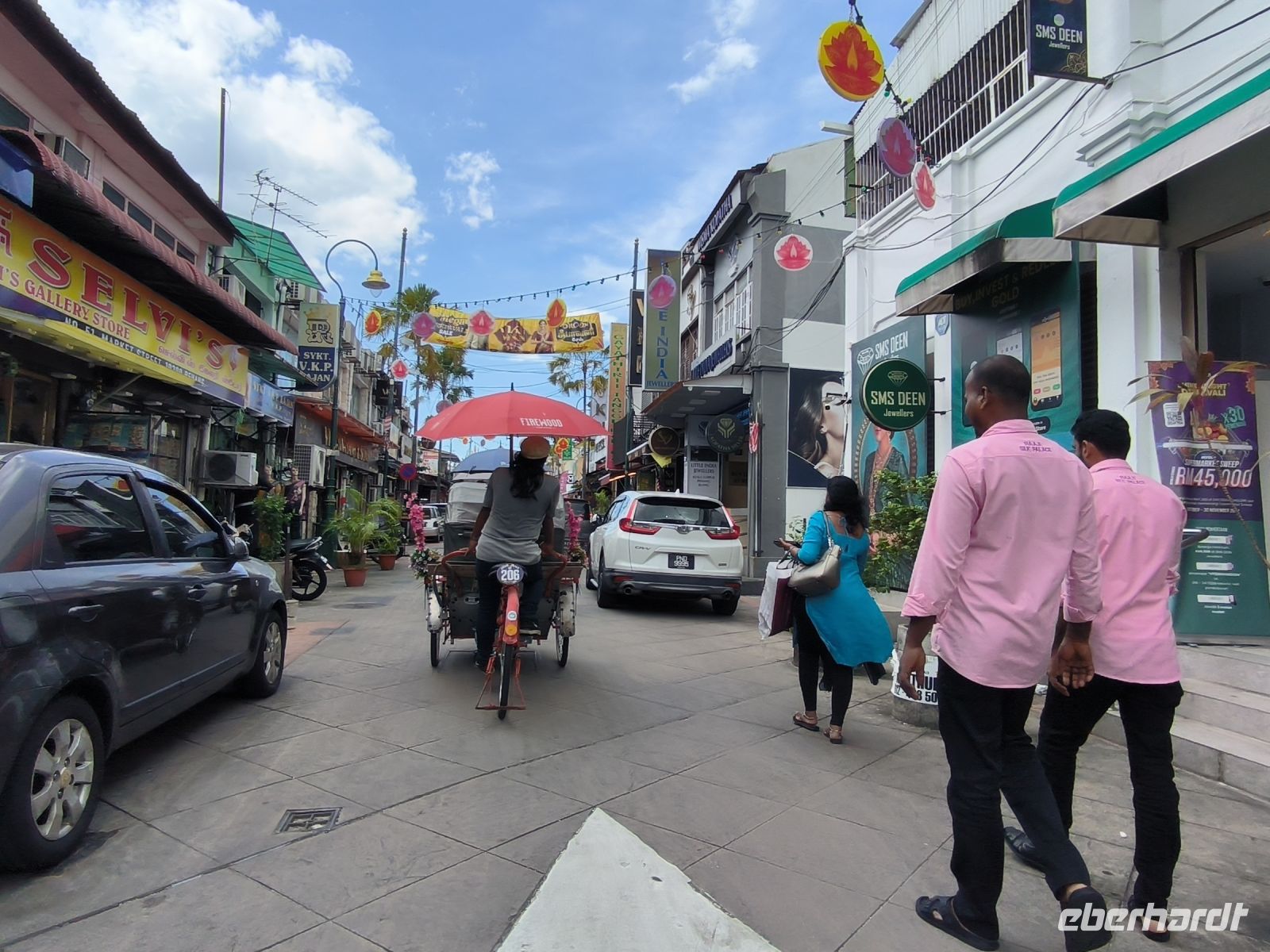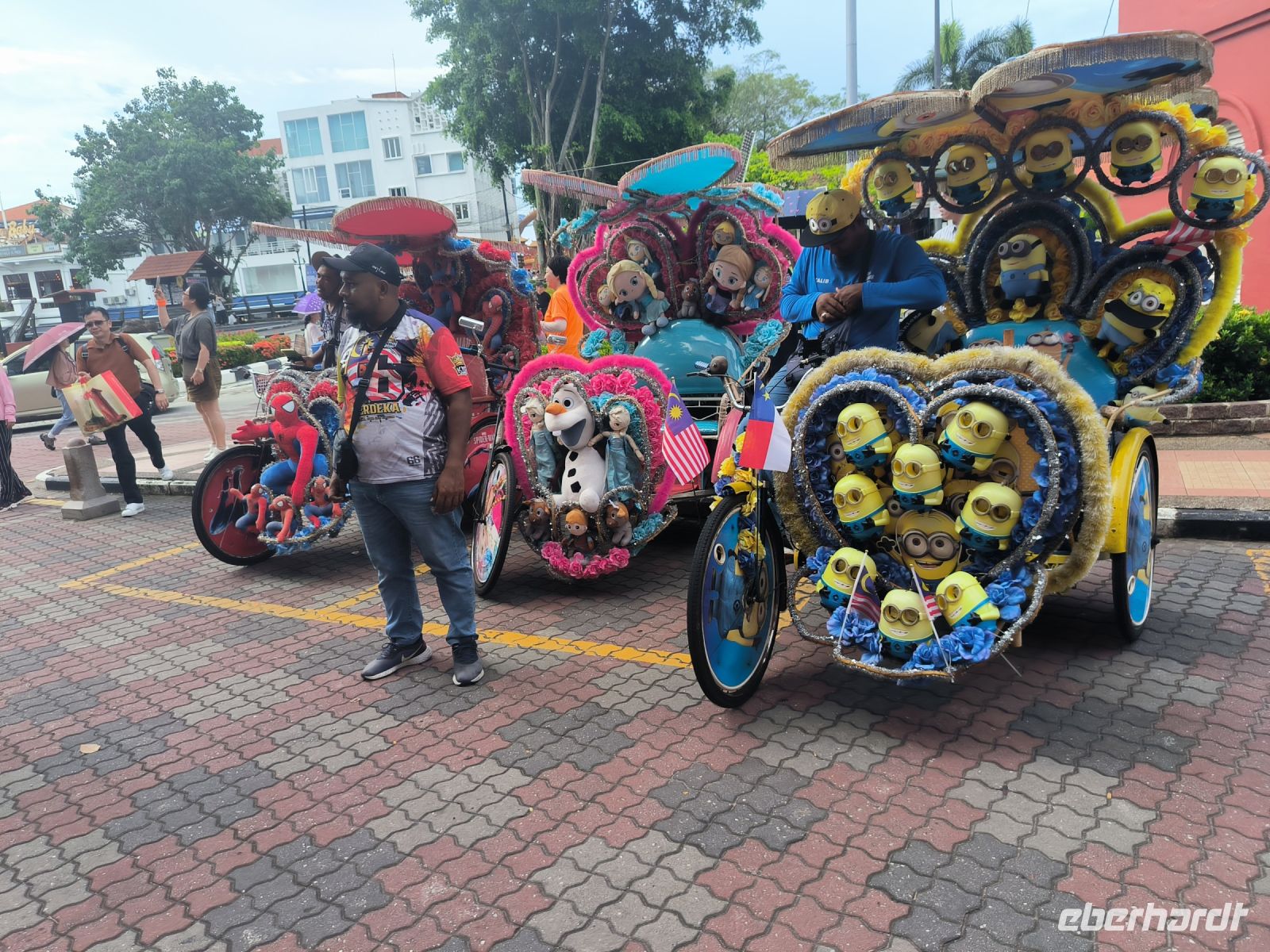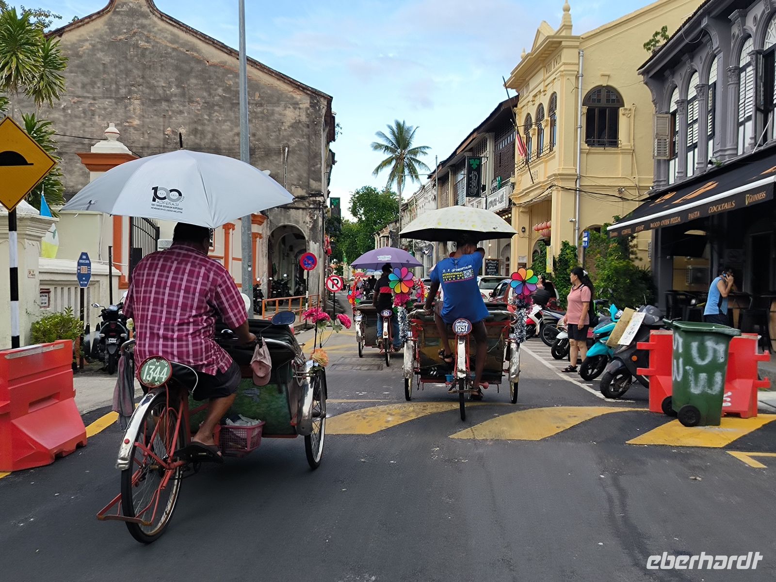 Kurze Entspannungspause im Hotel und dann startet unsere aufregende Rikschafahrt durch Georgetown. Jeder von uns bekommt eine eigene Rikscha mit persönlichem Fahrer, der sich ganz schön abstrampeln muss. Nach dem Motto „Mittendrin ist auch dabei“ schlängelt sich die Rikschakolonne durch den Straßenverkehr. Wir fahren am Fort Cornwallis vorbei, durchqueren noch einmal die Altstadt und bewundern die verschiedenen Bauwerke der Religionen an der Straße der Harmonie. Kurze Stopps am Meer, an der Moschee, dem chinesischen Clanhaus der Khoo Kongsi und in Little India geben Zul die Möglichkeit für Erklärungen. Dann kommen wir alle wieder am Hotel an. Alle? Nein, einer fehlt, wir werden doch nicht auf den letzten Metern noch Verluste haben? Natürlich nicht, auch S. fährt nun in seiner Rikscha vor.