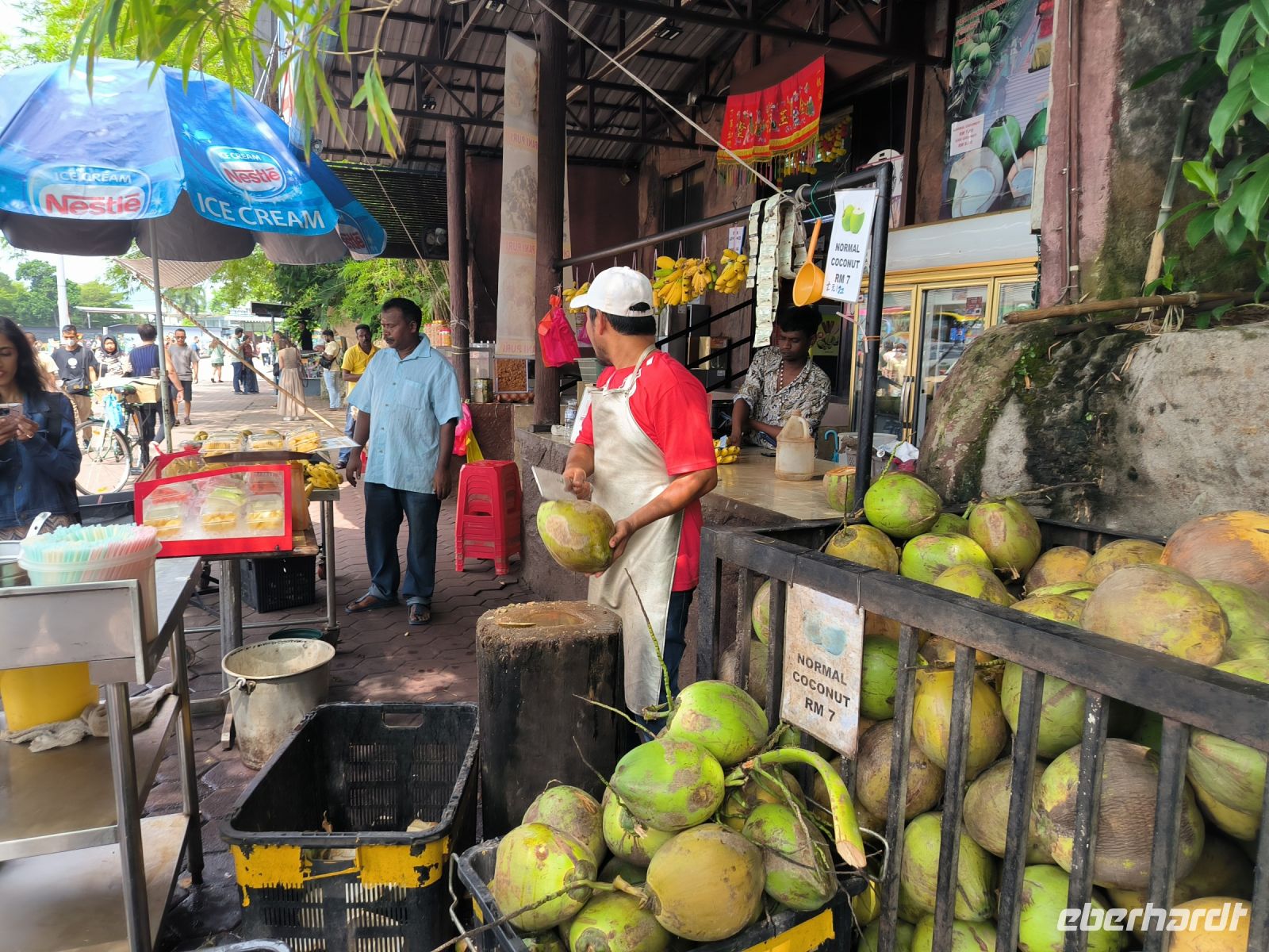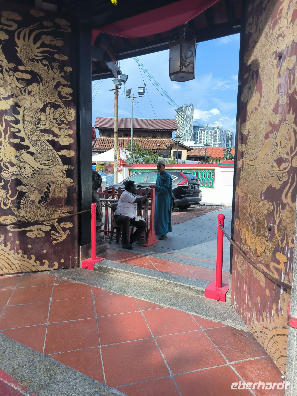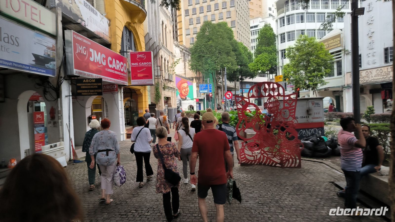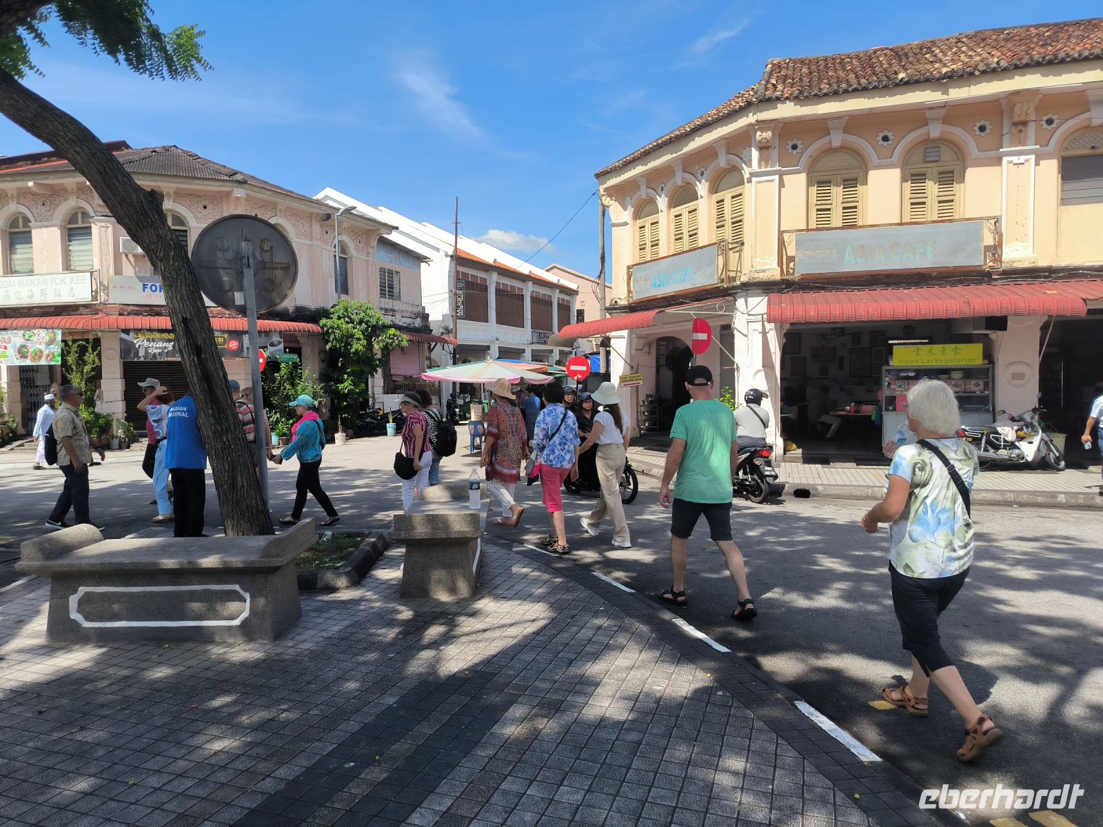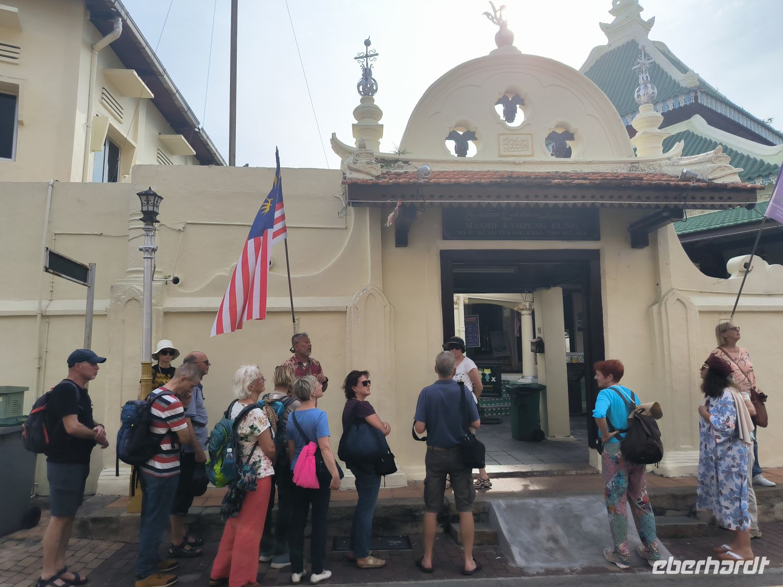 Kurze Entspannungspause im Hotel und dann startet unsere aufregende Rikschafahrt durch Georgetown. Jeder von uns bekommt eine eigene Rikscha mit persönlichem Fahrer, der sich ganz schön abstrampeln muss. Nach dem Motto „Mittendrin ist auch dabei“ schlängelt sich die Rikschakolonne durch den Straßenverkehr. Wir fahren am Fort Cornwallis vorbei, durchqueren noch einmal die Altstadt und bewundern die verschiedenen Bauwerke der Religionen an der Straße der Harmonie. Kurze Stopps am Meer, an der Moschee, dem chinesischen Clanhaus der Khoo Kongsi und in Little India geben Zul die Möglichkeit für Erklärungen. Dann kommen wir alle wieder am Hotel an. Alle? Nein, einer fehlt, wir werden doch nicht auf den letzten Metern noch Verluste haben? Natürlich nicht, auch S. fährt nun in seiner Rikscha vor.