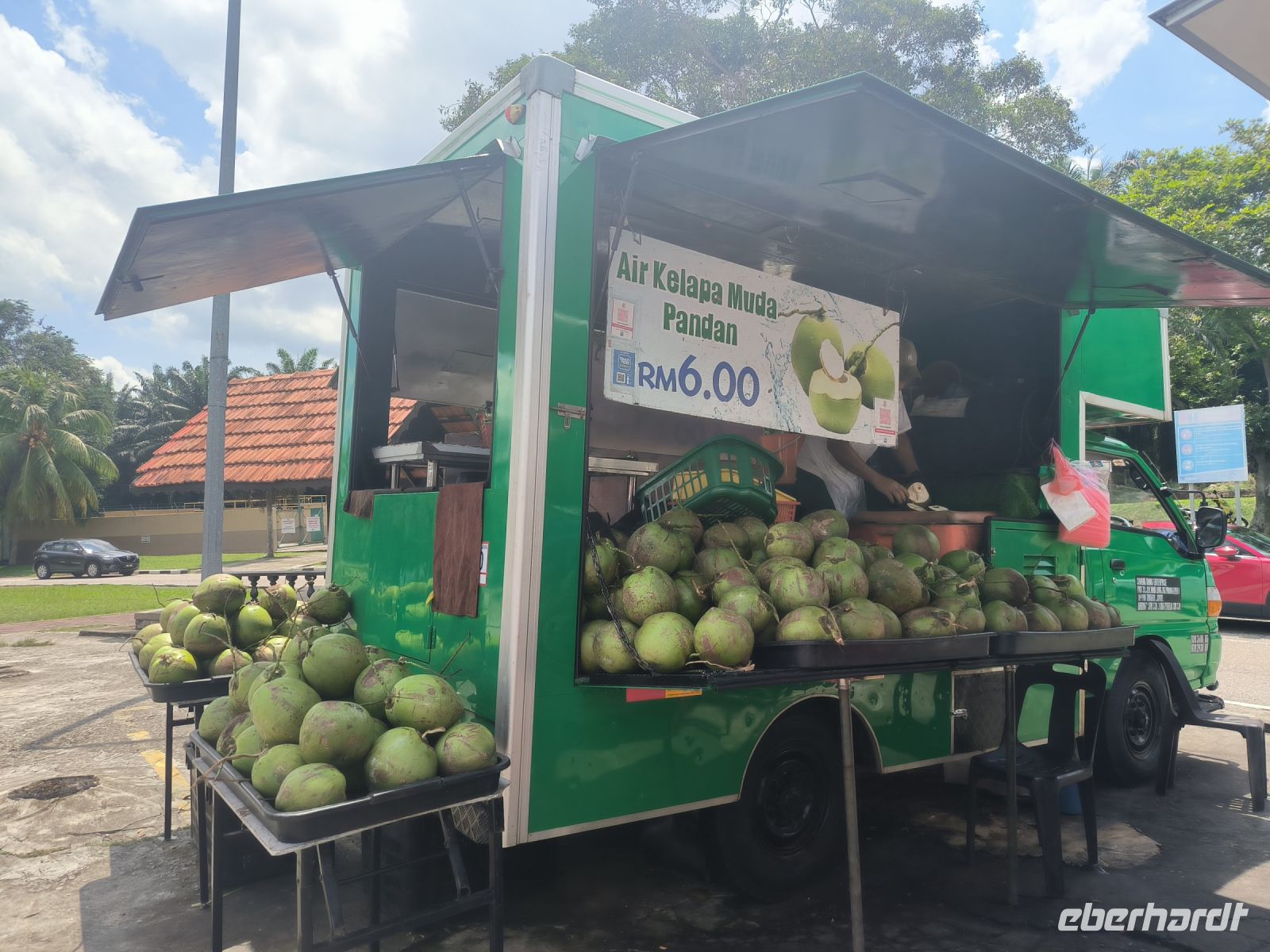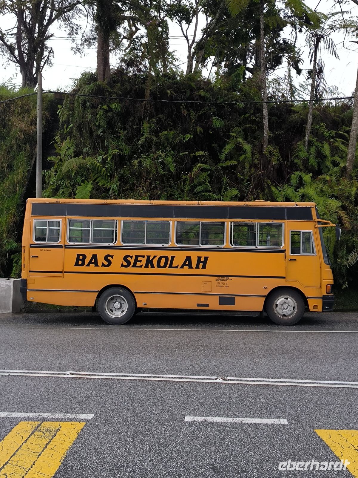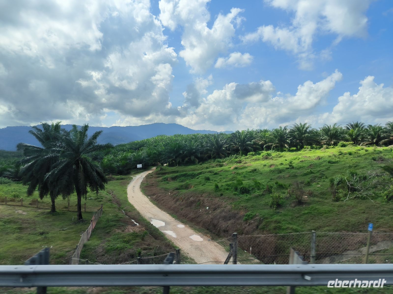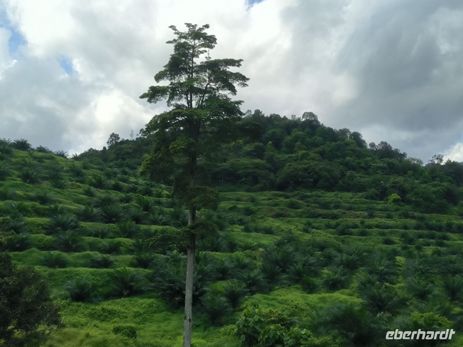 Mit dem Taxiboot geht es am Morgen schnell über den Fluss, unser Bus wartet auf der anderen Seite im Dorf. Es ist eine lange, kurvenreiche Fahrt durch die malaysische Landschaft. Vorbei an riesigen Ölpalmen – Plantagen. Die Ölpalme ist die ertragreichste Ölpflanze der Welt und stammt ursprünglich aus dem tropischen Westafrika. Zu Zeiten der Kolonialisierung gelangte die Pflanze nach Malaysia, das heute weltweit wichtigste Anbauland von Ölpalmen. Der Anbau ist umstritten, da immer mehr tropische Regenwälder den Plantagen weichen müssen. Wir haben selbst gerade erlebt, welch großer Verlust das ist.