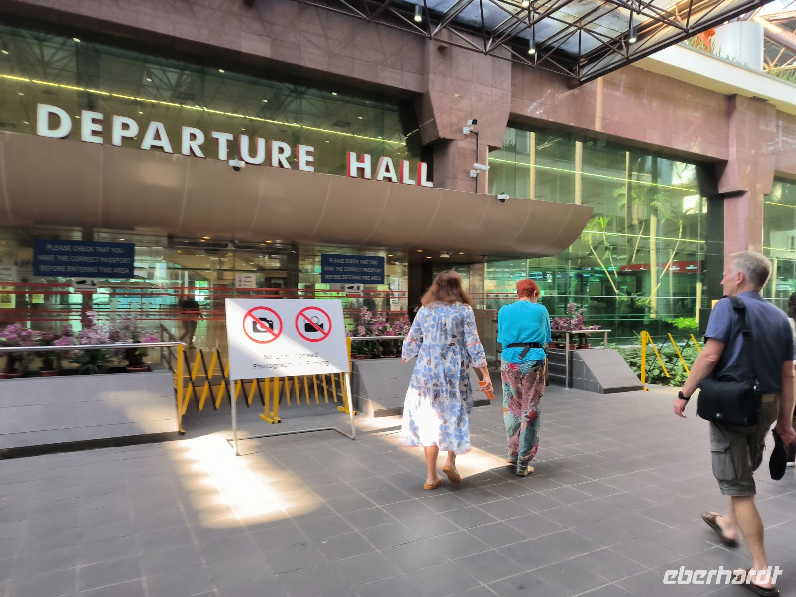 Ein mit Teppichen ausgelegter, eleganter Flughafen, der Changi Airport, erwartet uns ebenso wie unsere sympathische örtliche Reiseleiterin Bibi. Die Einreiseformalitäten laufen überraschend komplikationslos, das hatten wir uns schwieriger vorgestellt. Wir nutzen die Gelegenheit, uns frisch zu machen und ein paar Singapur - Dollar für die kommenden Tage umzutauschen. Auch unsere beiden Mitreisenden, die bereits einen Tag früher angekommen sind, gesellen sich zu unserer Reisegruppe. Nun kann es losgehen.