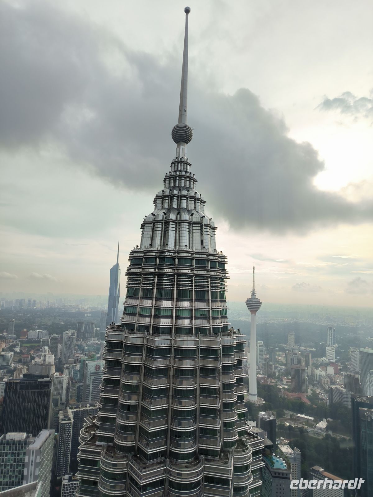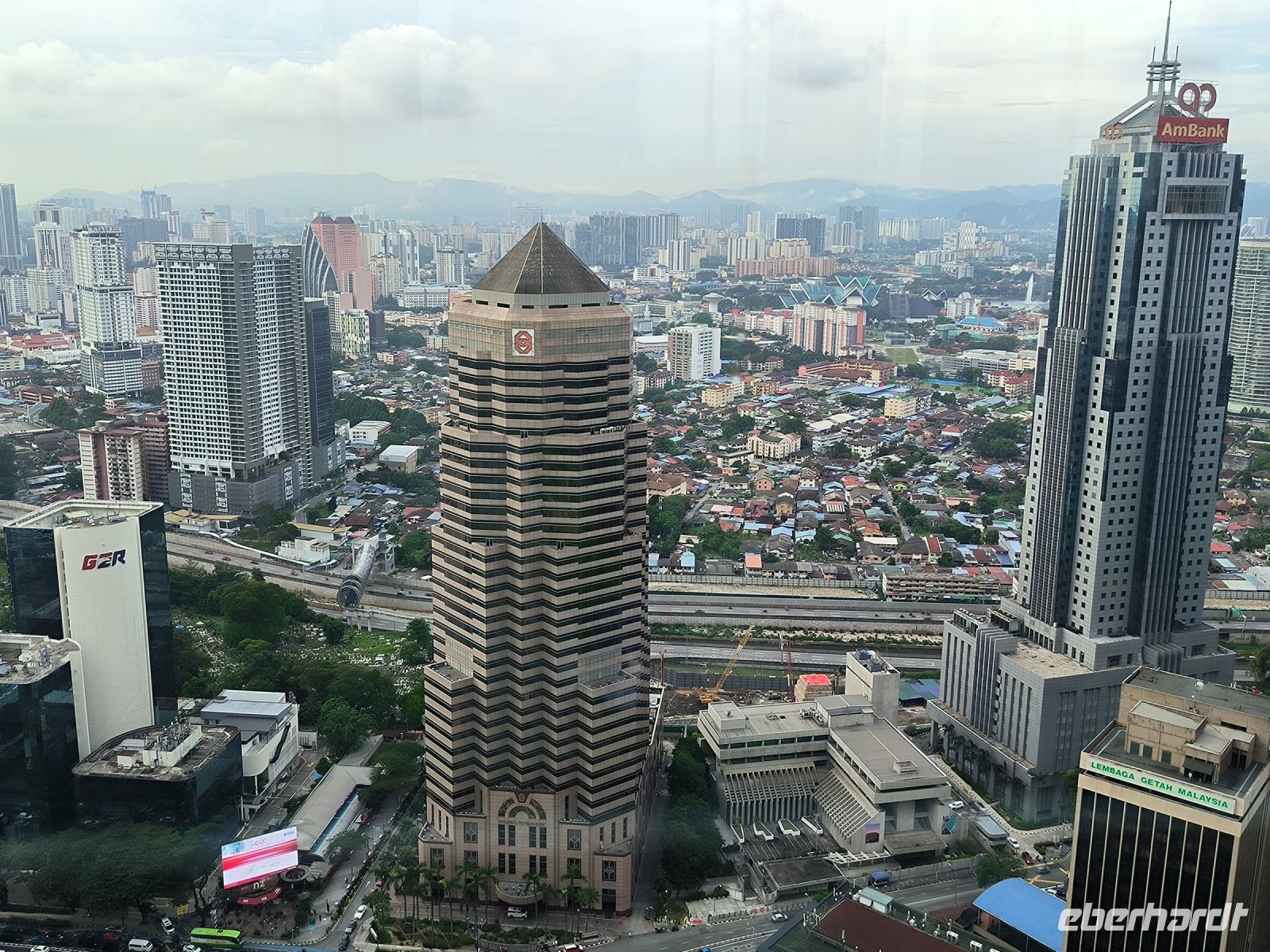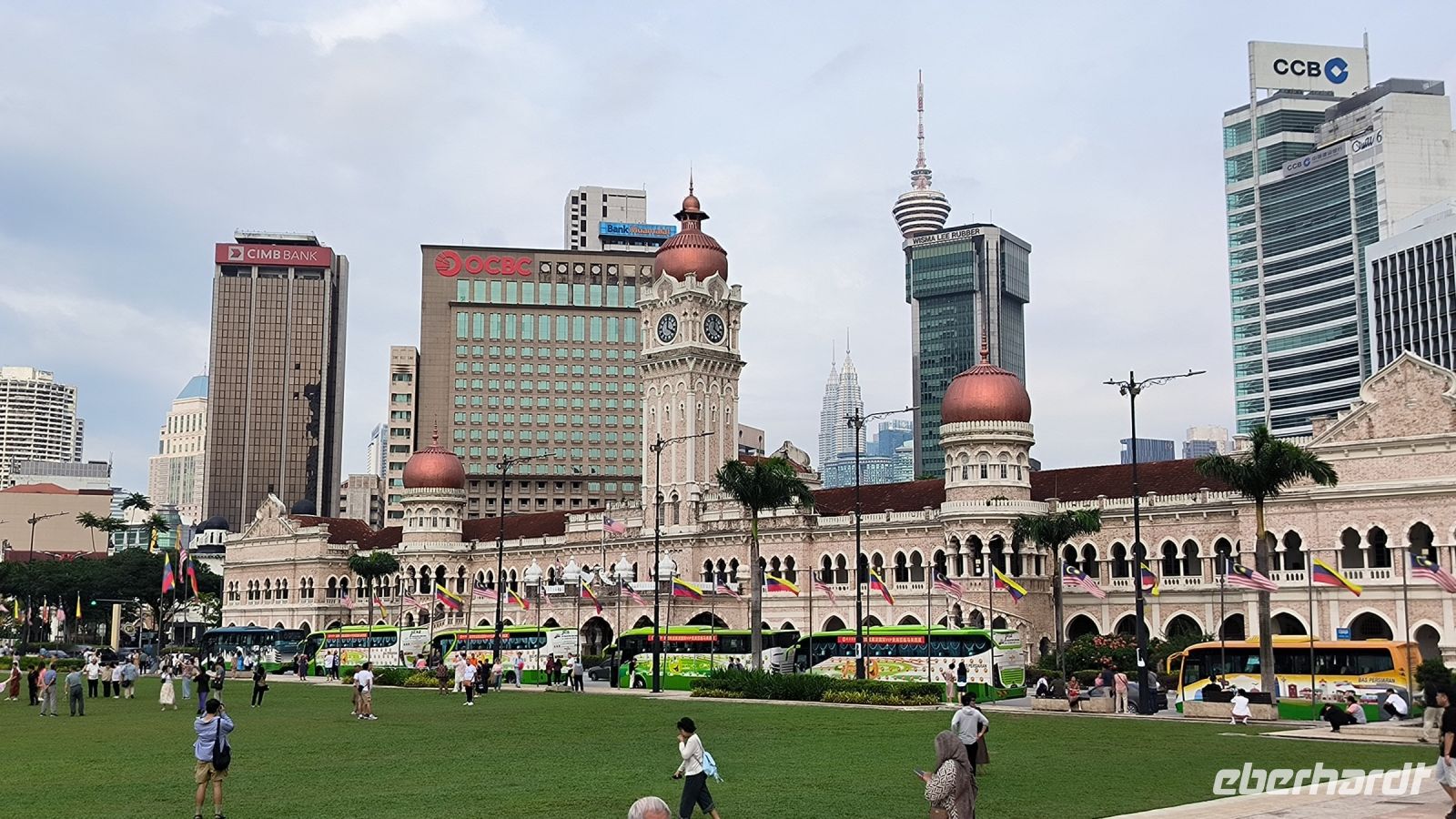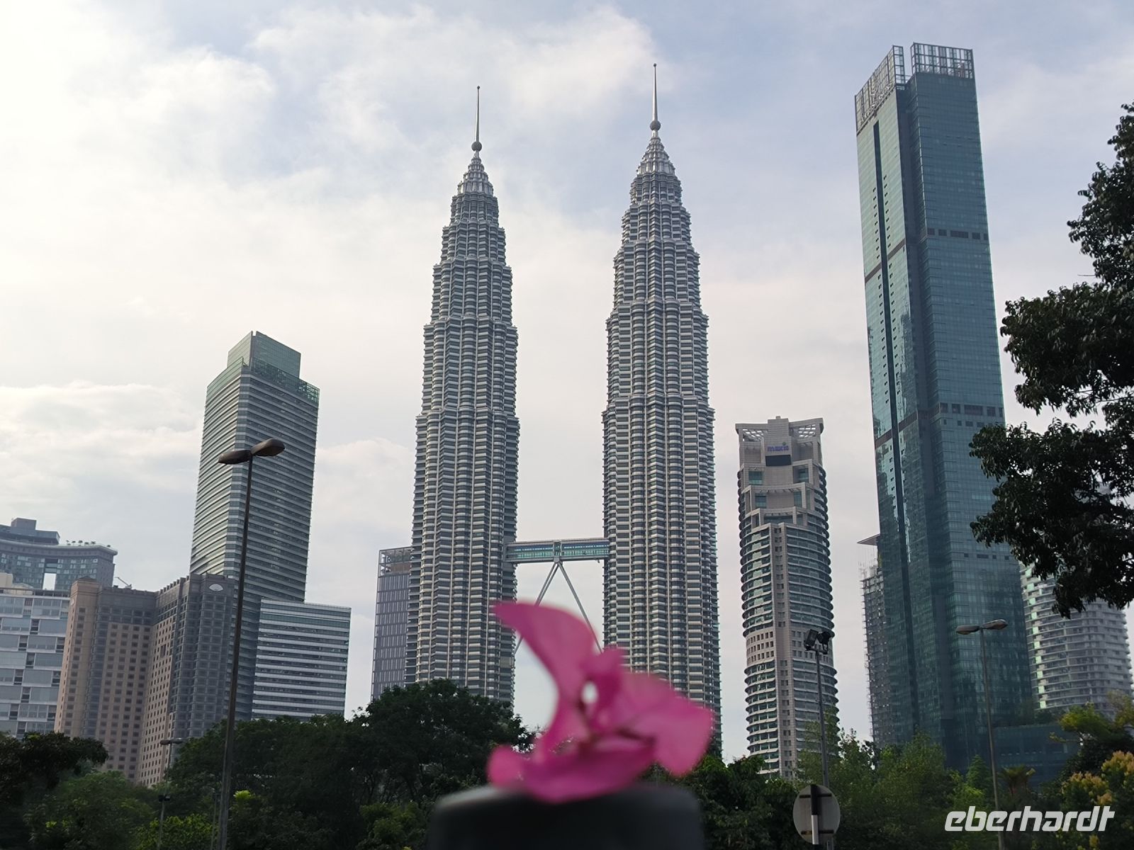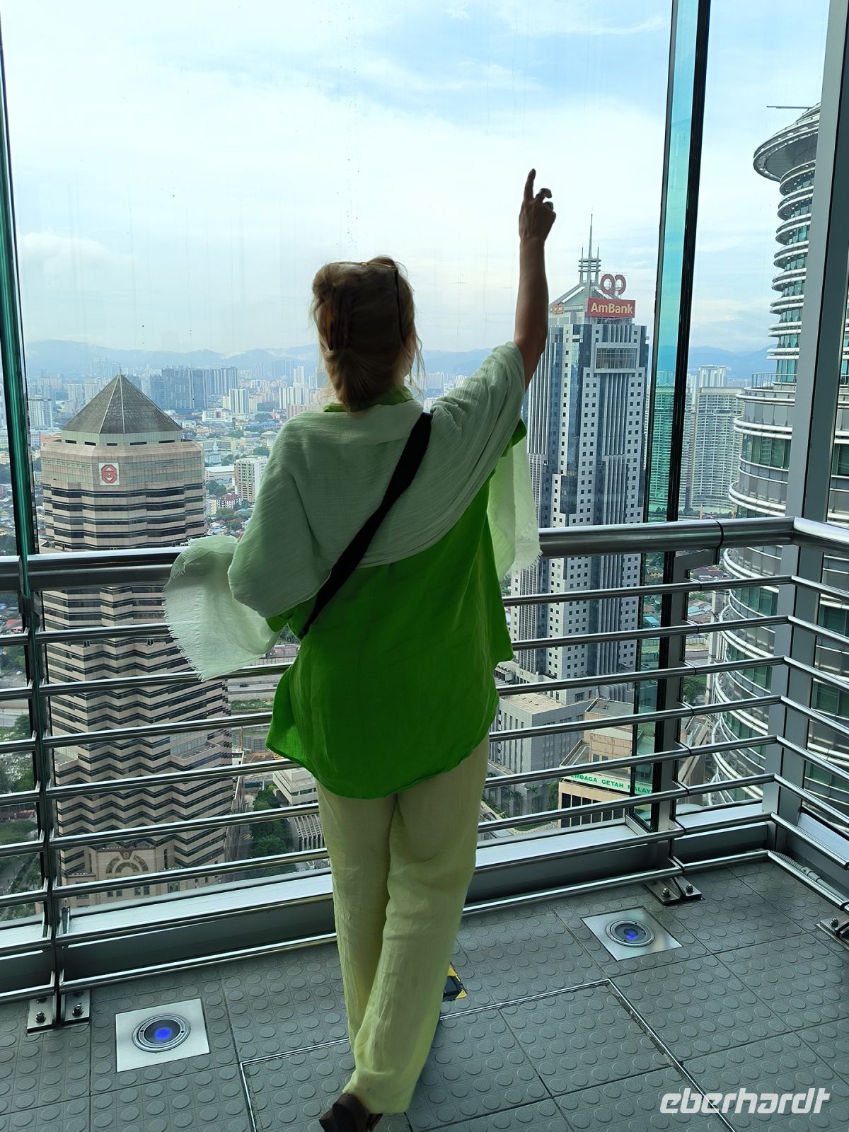 Unser Stadtrundgang bringt uns dann durch die Innenstadt und einen der zahlreichen chinesischen Tempel zum River Confluence, dem Geburtsort von KL. Wir laufen am märchenhaften Sultan Abdul Samad Palast vorbei und über den Independence Square, bevor unser Bus uns zu den mit Spannung erwarteten Petronas Towers bringt. Nach einer Sicherheitskontrolle in den auf dem Grund der ehemaligen Pferderennbahn erbauten Zwillingstürmen fahren wir zur Skybridge und auf das Observation Deck bis auf eine Höhe von 451.9 Metern in den 88. Stock. Viele junge Guides weisen unserer „blauen Gruppe“ den richtigen Weg. Was für ein gigantischer Ausblick! Die Hauptstadt Malaysias liegt zu unseren Füßen. Wie Ameisen wimmeln die Menschen und wir beobachten aus sicherer Entfernung den gewöhnungsbedürftigen Linksverkehr auf den Straßen.