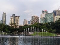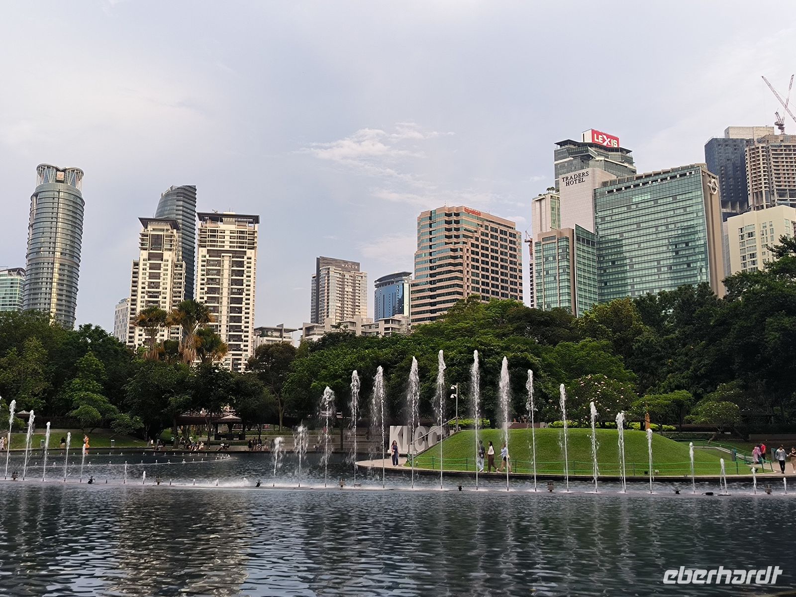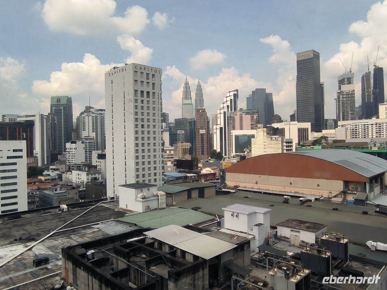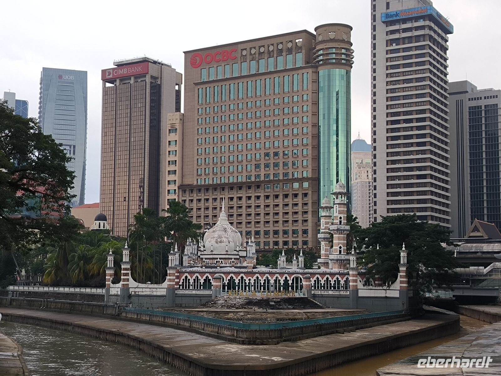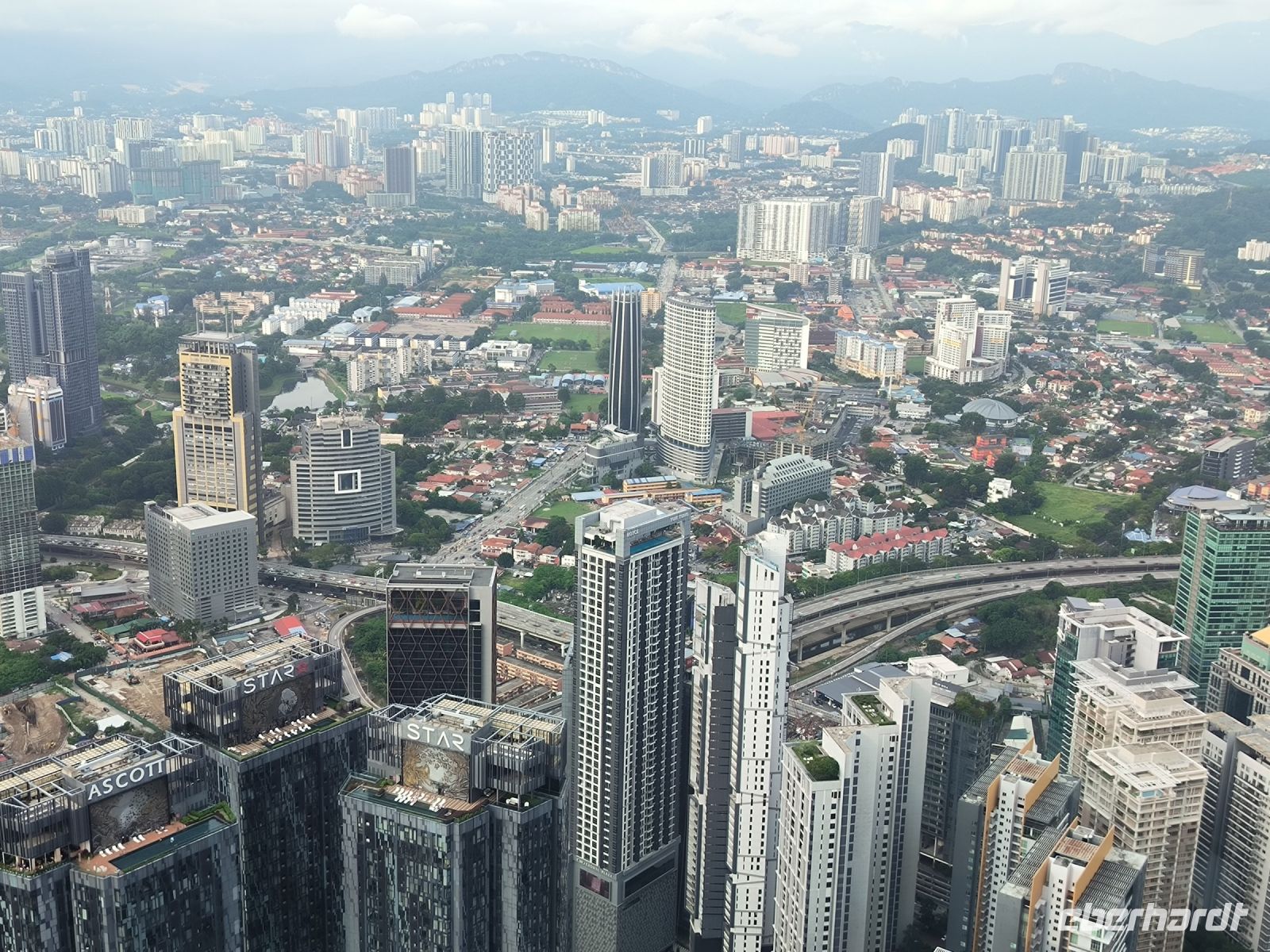 Unser Stadtrundgang bringt uns dann durch die Innenstadt und einen der zahlreichen chinesischen Tempel zum River Confluence, dem Geburtsort von KL. Wir laufen am märchenhaften Sultan Abdul Samad Palast vorbei und über den Independence Square, bevor unser Bus uns zu den mit Spannung erwarteten Petronas Towers bringt. Nach einer Sicherheitskontrolle in den auf dem Grund der ehemaligen Pferderennbahn erbauten Zwillingstürmen fahren wir zur Skybridge und auf das Observation Deck bis auf eine Höhe von 451.9 Metern in den 88. Stock. Viele junge Guides weisen unserer „blauen Gruppe“ den richtigen Weg. Was für ein gigantischer Ausblick! Die Hauptstadt Malaysias liegt zu unseren Füßen. Wie Ameisen wimmeln die Menschen und wir beobachten aus sicherer Entfernung den gewöhnungsbedürftigen Linksverkehr auf den Straßen.