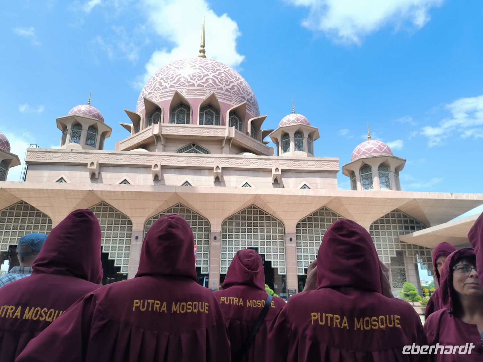 Nur eine Nacht verbringen wir hier in Malakka, denn weitere spannende Reiseziele erwarten uns. Unsere Fahrt geht nach Putrajaya, auch die "Intelligente Stadt“ oder „Planstadt“ genannt. Tatsächlich hat man diesen Ort am Reißbrett geplant, um mit einem zweiten Regierungssitz die Hauptstadt Kuala Lumpur zu entlasten. Aus praktischen oder architektonischen Erwägungen scheint dies gelungen, aber eine Seele hat die Stadt nicht. Beeindruckend ist es allemal für uns, die gewaltige Putra Mosque zu besuchen. Hier in der Moschee muss jede(r) von uns einen Umhang anziehen, um die strenge Kleiderordnung zu erfüllen. Da Zul selbst Moslem ist, kann er uns sehr authentisch über diese Religion und deren Sitten und Gebräuche erzählen.