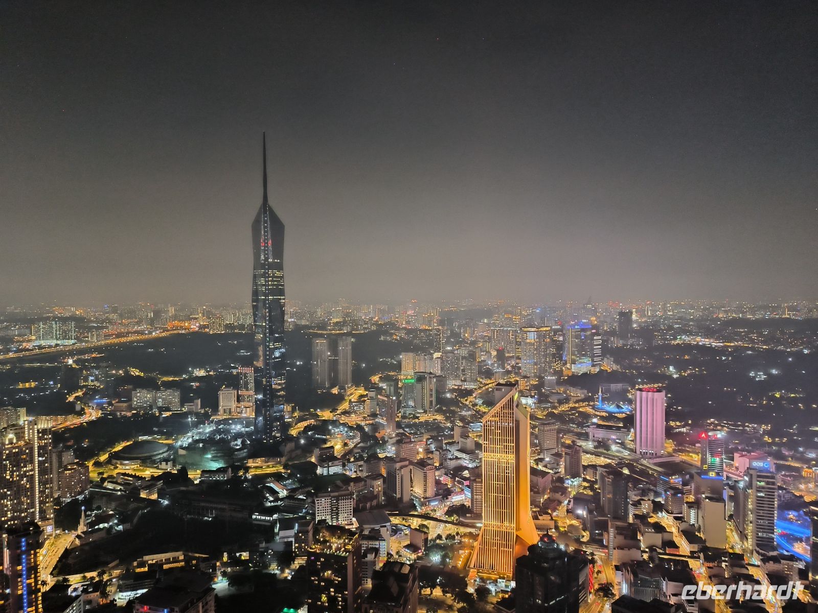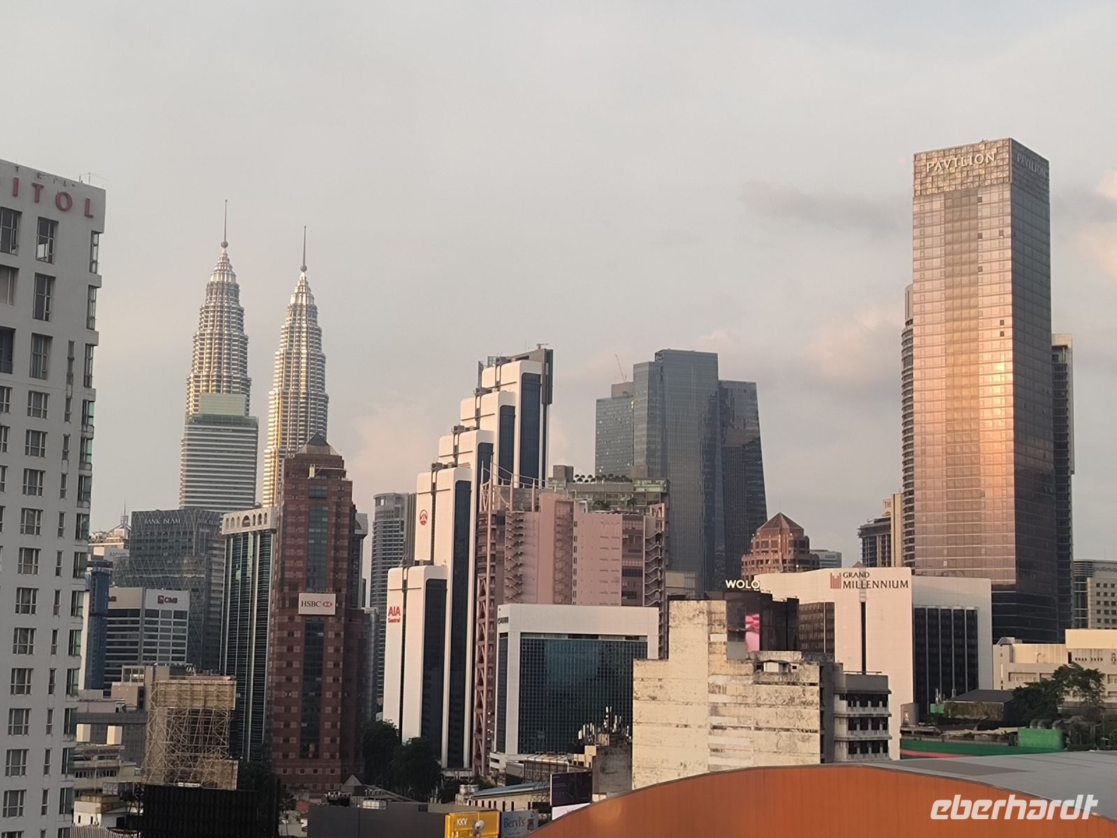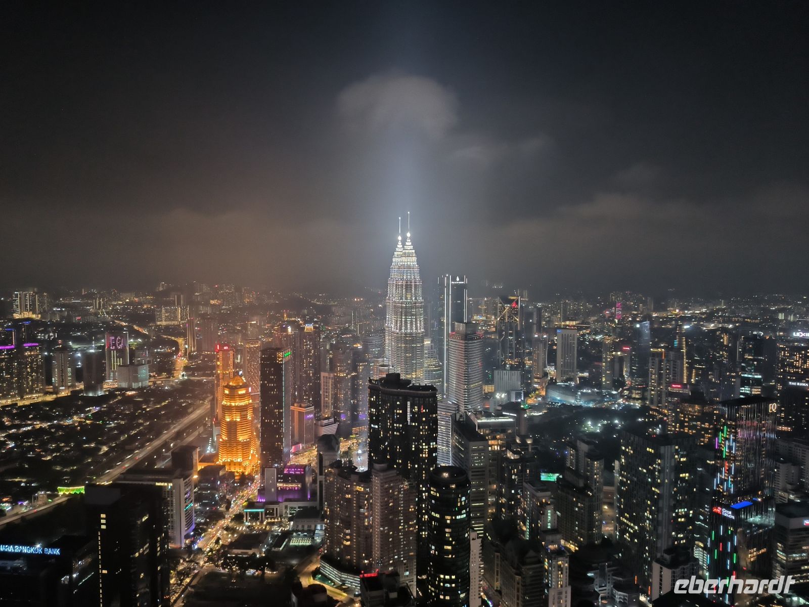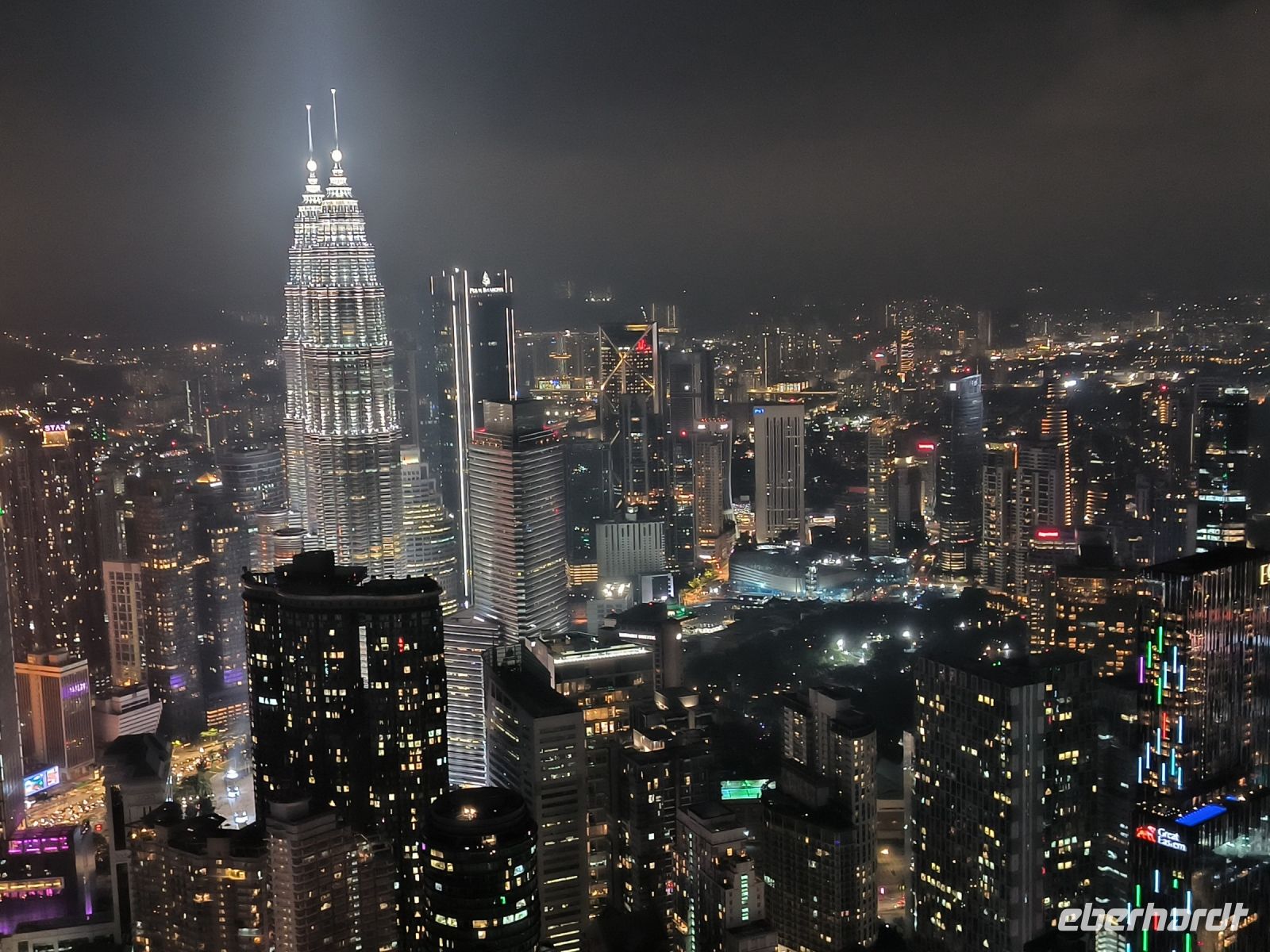 Unser gemeinsames Abendessen wird im Hotel in einem separaten Raum serviert, das Buffet ist üppig, aber leider nicht für alle zufriedenstellend. Danach machen sich einige mit dem Grab Taxi auf den Weg zum Fernsehturm oder KL – Tower. Er ist 421 Meter hoch und neben den Petronas Towers, den mit 452 Metern höchsten Zwillingstürmen, und dem neuen Merdeka 118 mit 679 Metern einer von vielen Highlights hier. Vom Sky Deck auf 300 Metern haben wir eine spektakuläre Sicht über die beleuchtete Stadt und zu den anderen Türmen. Auch für den Rückweg nehmen wir das preiswerte Grab Taxi, eine sehr empfehlenswerte App. Ein Drink an der Hotelbar beschließt diesen interessanten Reisetag.