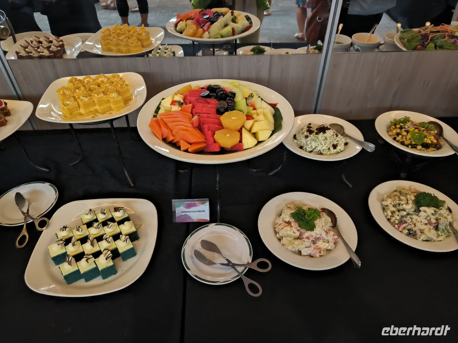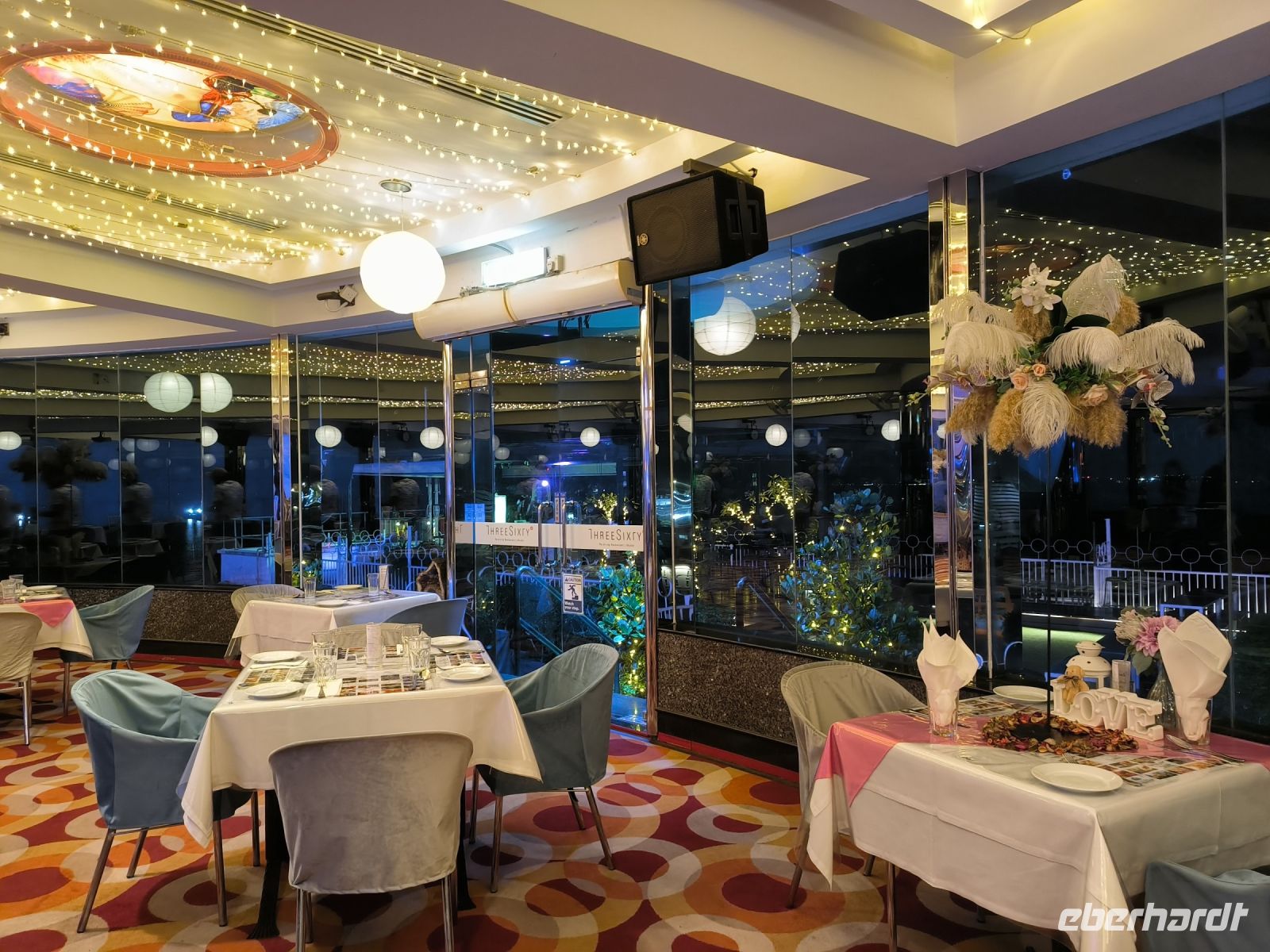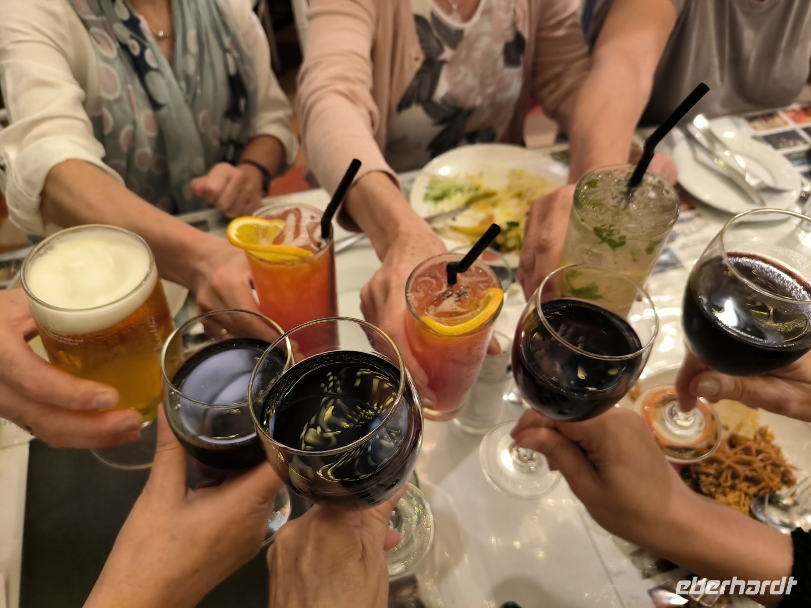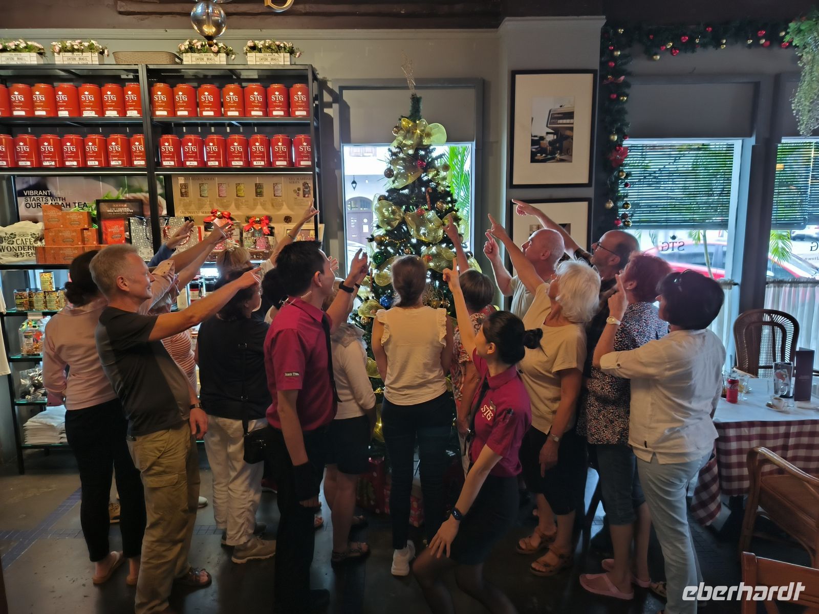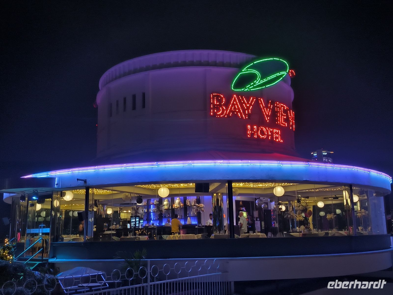 Viel zu schnell ist nun unser letzter gemeinsamer Abend gekommen. Für das Abschiedsabendessen habe ich im Bayview 360° Restaurant auf dem Dach unseres Hotels Plätze reserviert. Eigentlich haben wir ja nicht mehr so viel Hunger, wollen aber diesen Abend sehr gern auch zusammen verbringen. Die Gruppe ist während der Reise sehr harmonisch zusammengewachsen. Wie von den Malaysiern vorgelebt, wurden Harmonie, Respekt und Höflichkeit untereinander groß geschrieben. Darauf stoßen wir dank Eberhardt Travel mit einem wohlschmeckenden Getränk an. Nun können wir das reichhaltige Buffet genießen, auch wenn es uns scheinbar immer wieder davonfährt. Das drehende Restaurant ganz oben ist wirklich etwas Besonderes und auch den Blick von der Rooftop-Bar lassen wir uns nicht entgehen.