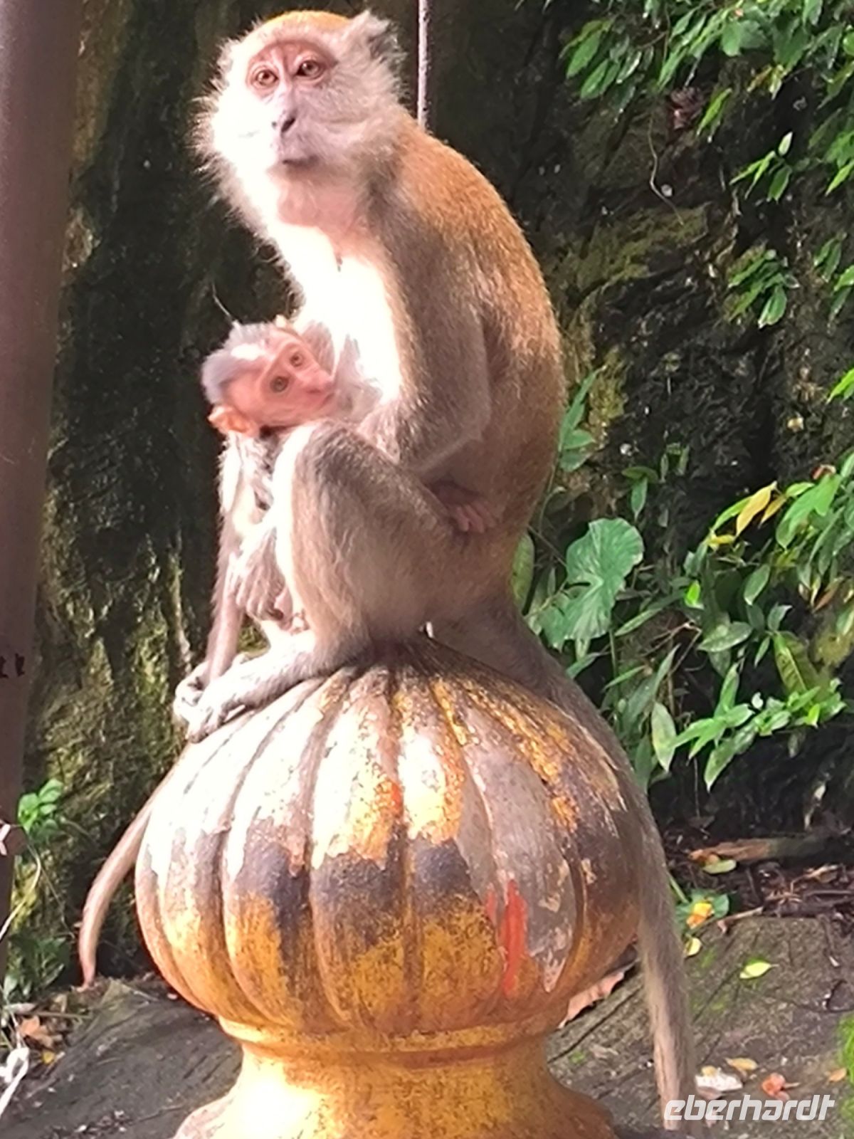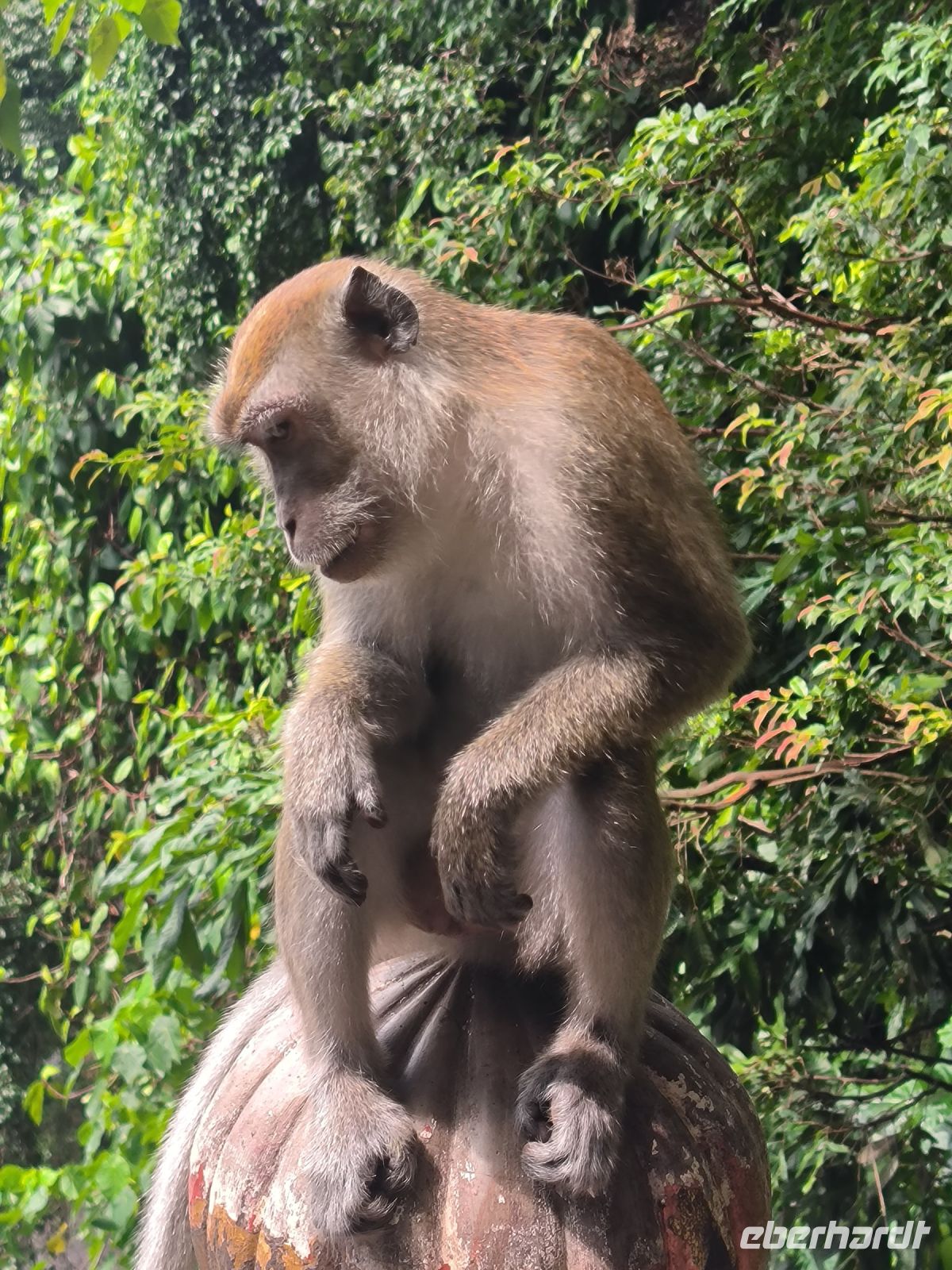 Auf dem Hügel und um die Höhlen leben zahlreiche Javaneraffen, die wir ebensowenig wie die vielen Tauben füttern, auch Lachen = Zähne fletschen sollten wir nicht, wie Zul uns einschärft. Die Kleiderordnung besagt, daß wir nur mit bedeckten Schultern und Knien in den Tempel hineindürfen. Wir sind gut vorbereitet, aber notfalls gäbe es auch Tücher zu kaufen.