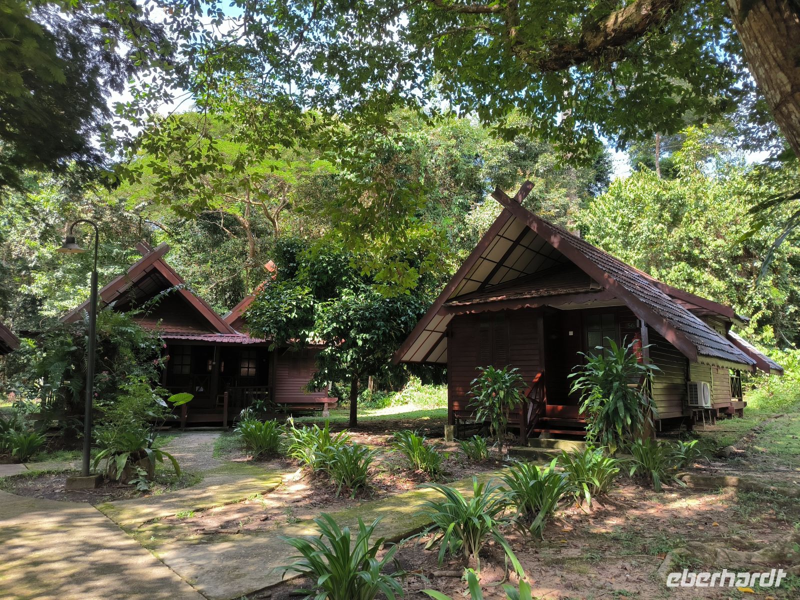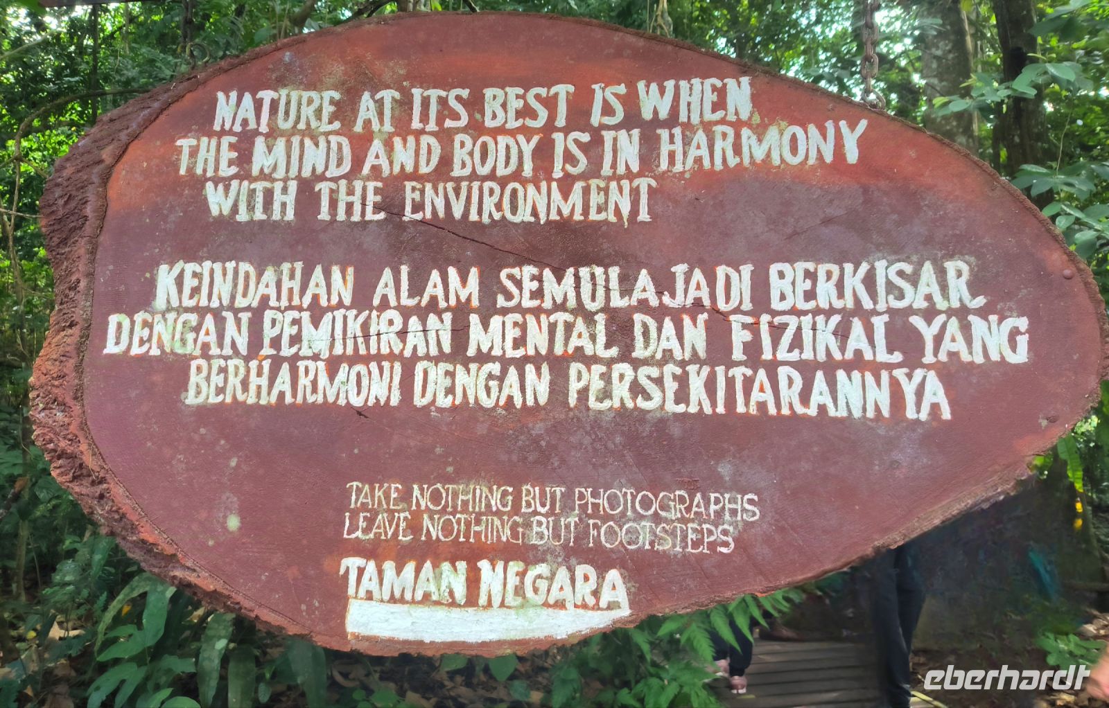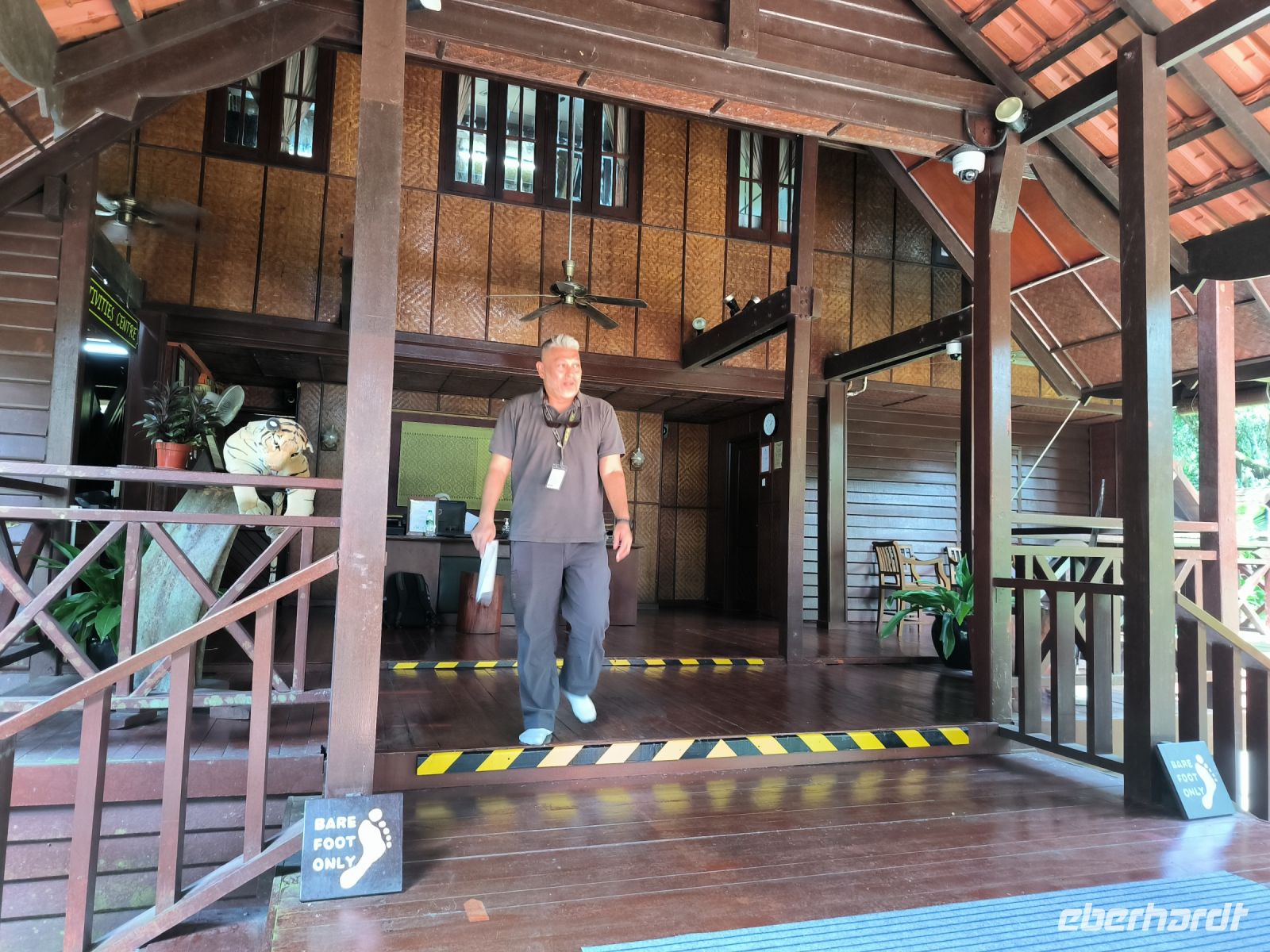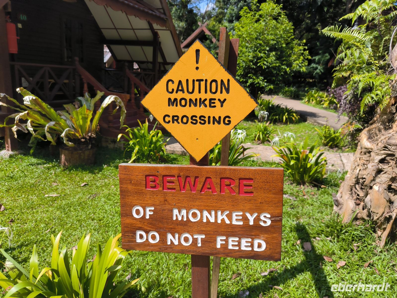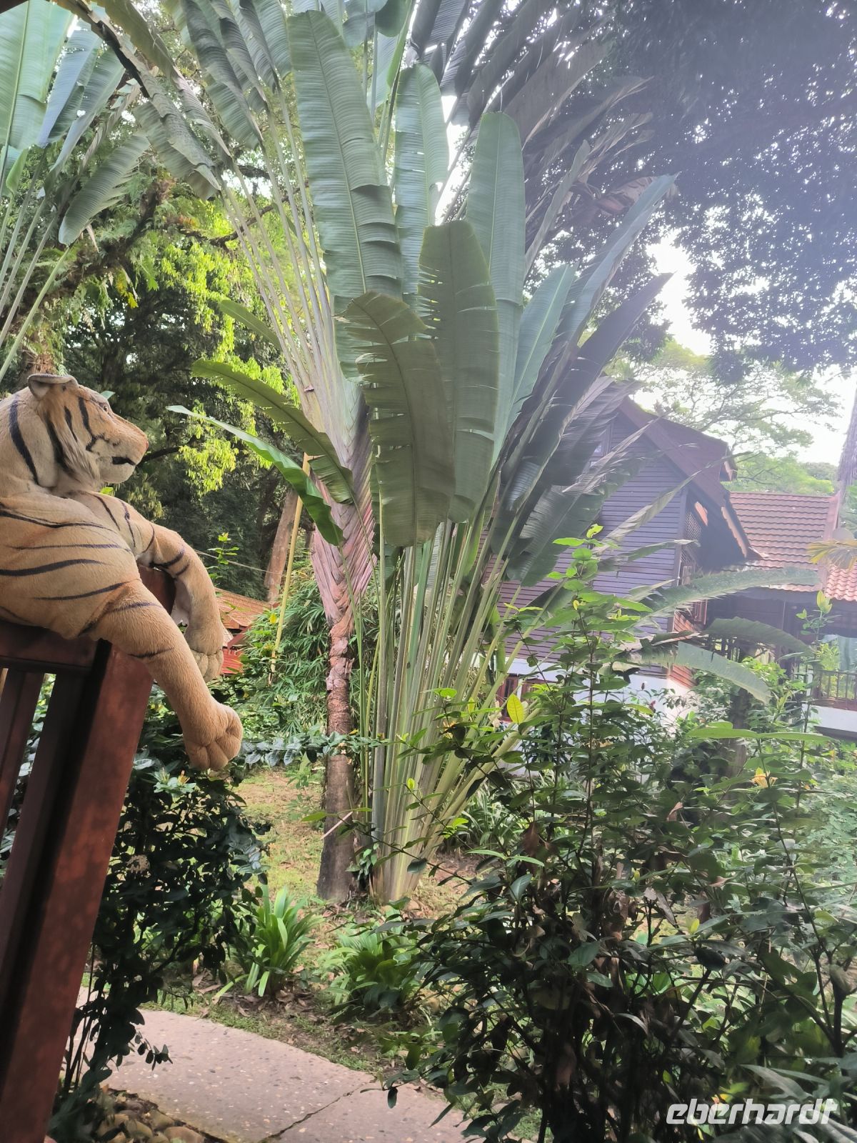 Gegen Mittag beziehen wir Quartier in unserem Resort Hotel Mutiara Taman Negara und warten bei einem leichten Mittagessen auf die Fertigstellung unserer Bungalows. Das Resort ist weitläufig und wird auch von herumspringenden Makaken bewohnt, vor denen uns Schilder eindringlich warnen. Viel gefährlicher scheinen wohl die überall lauernden Tiger, aber nein, die sind aus Plüsch und sollen wohl das Reinigungspersonal vor dem Diebstahl ihrer Arbeitsmittel bewahren.