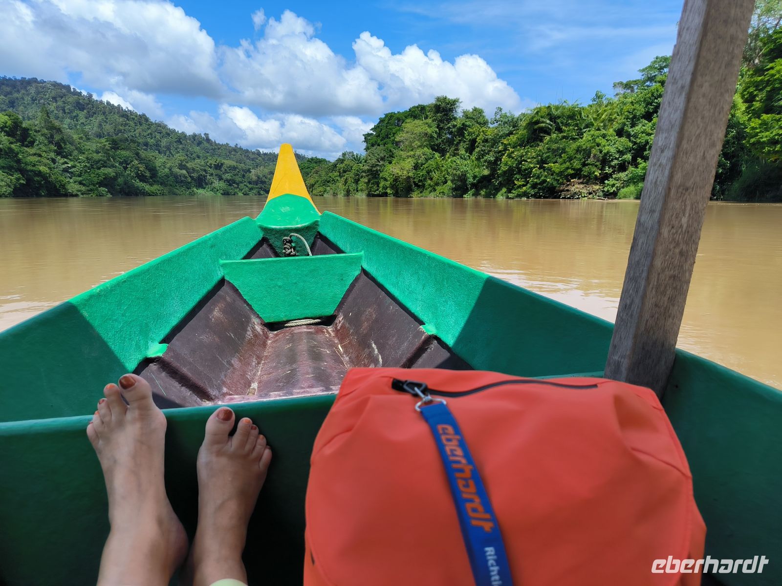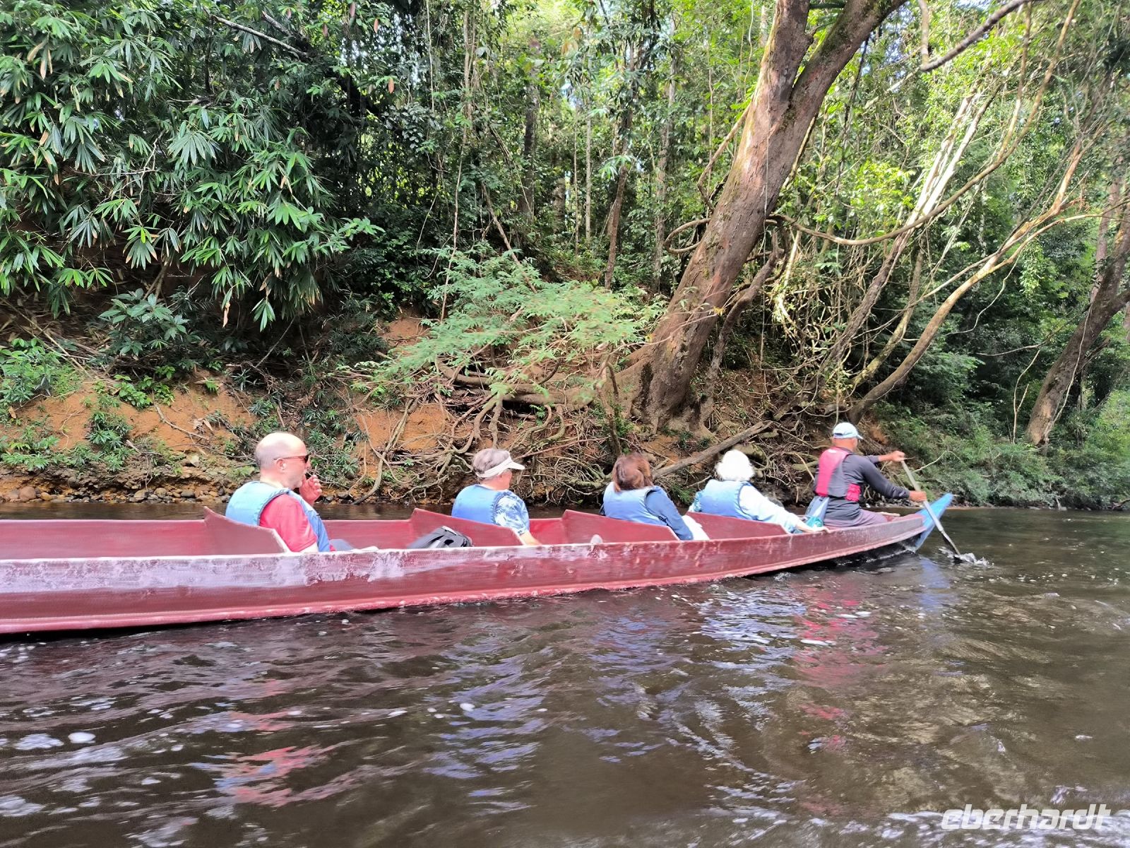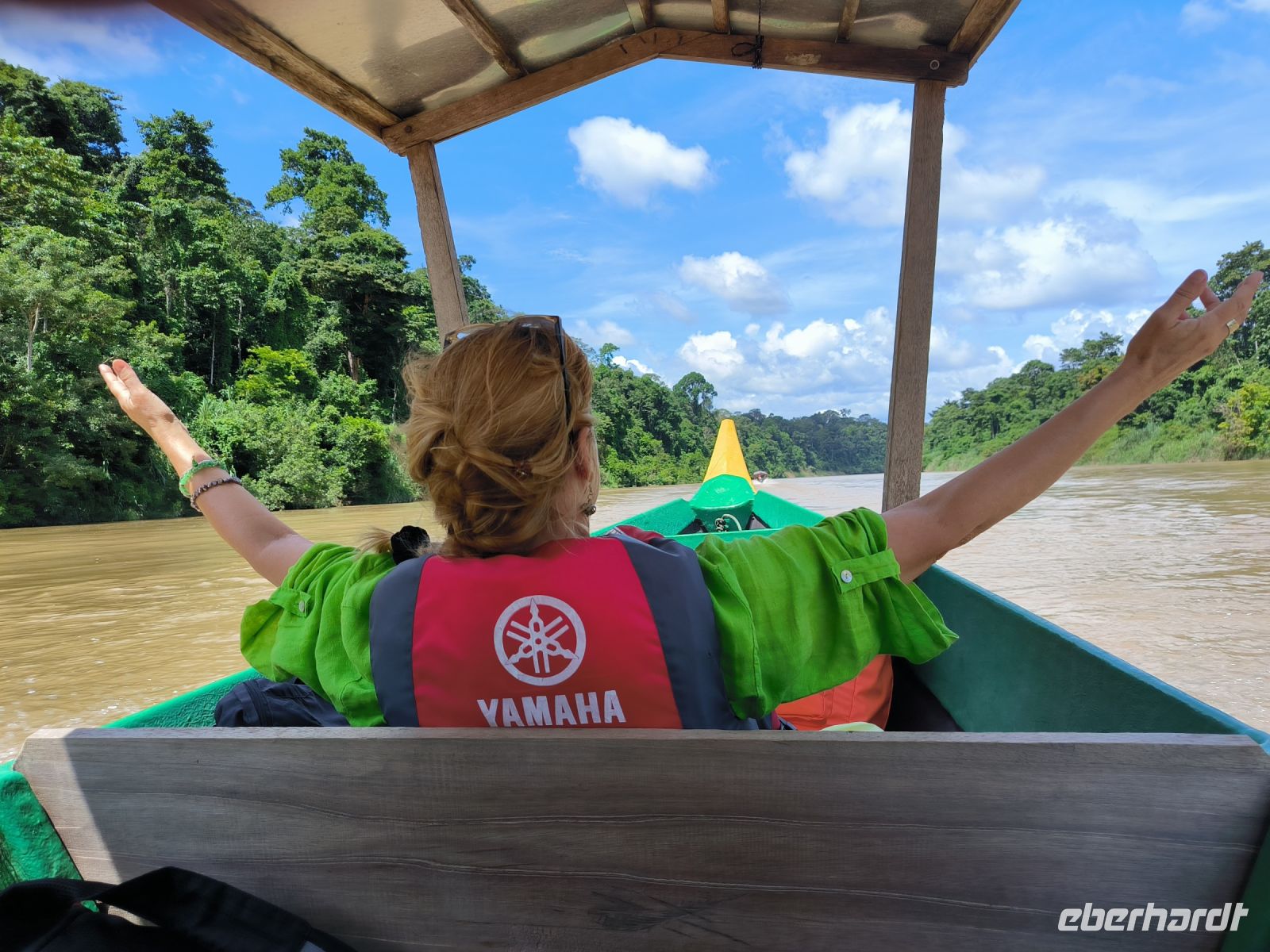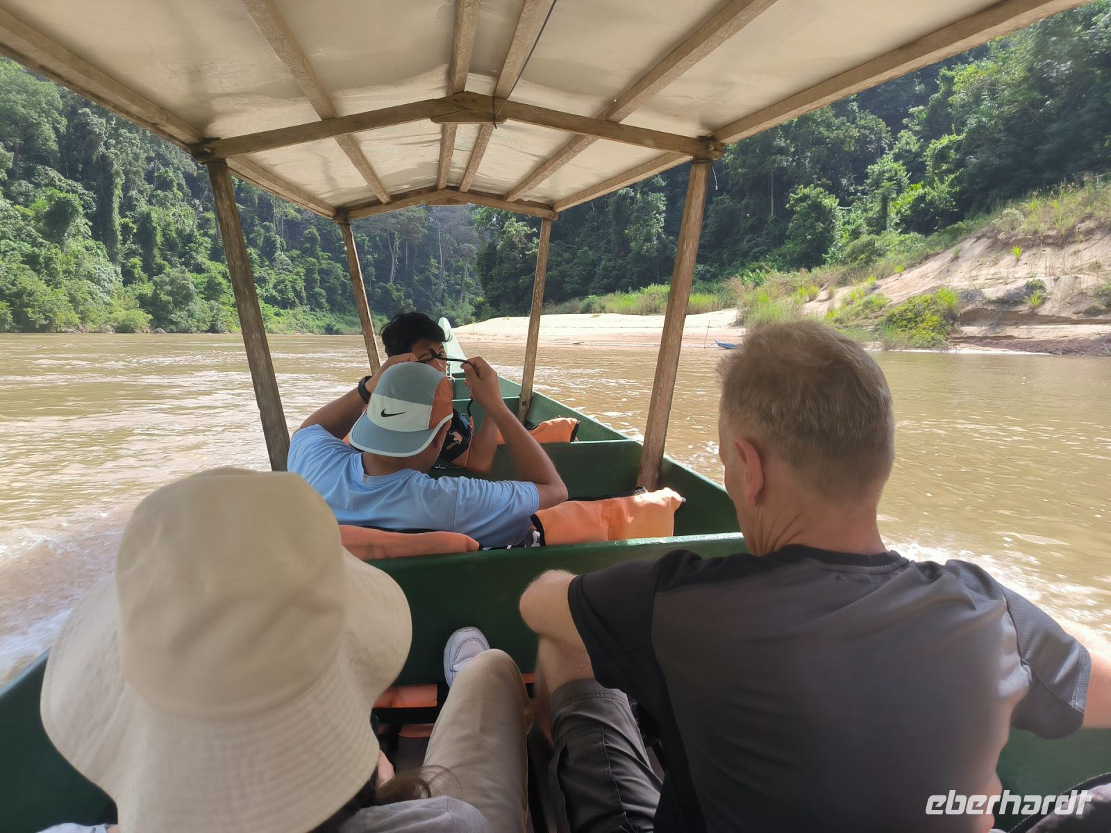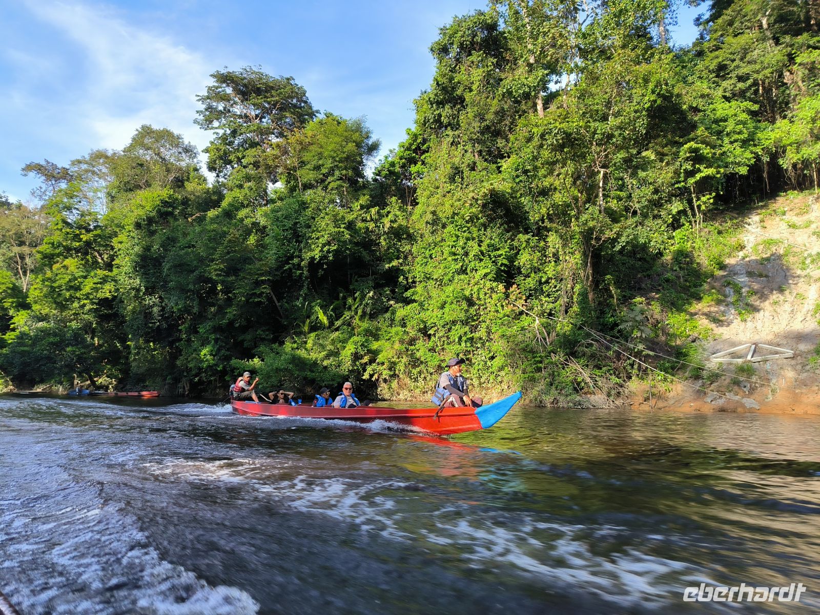 Nach dem Mittagessen im Resort besteigen wir dann wieder die offenen Langboote, um noch tiefer in den Dschungel zu fahren. Es ist eine herrliche Fahrt mit vielen Stromschnellen. Da werden wir auch mal schnell nassgespritzt. Aber das tut dem Genuss keinen Abbruch, es ist ja warm. Gekonnt schlängeln unsere Skipper die Boote durch die Gesteinsbrocken und Sandbänke. Blauer Himmel und Sonnenschein, hohe Bäume mit schlingenden Lianen und ein paar Affen machen diese Wildwasserfahrt zum Erlebnis.