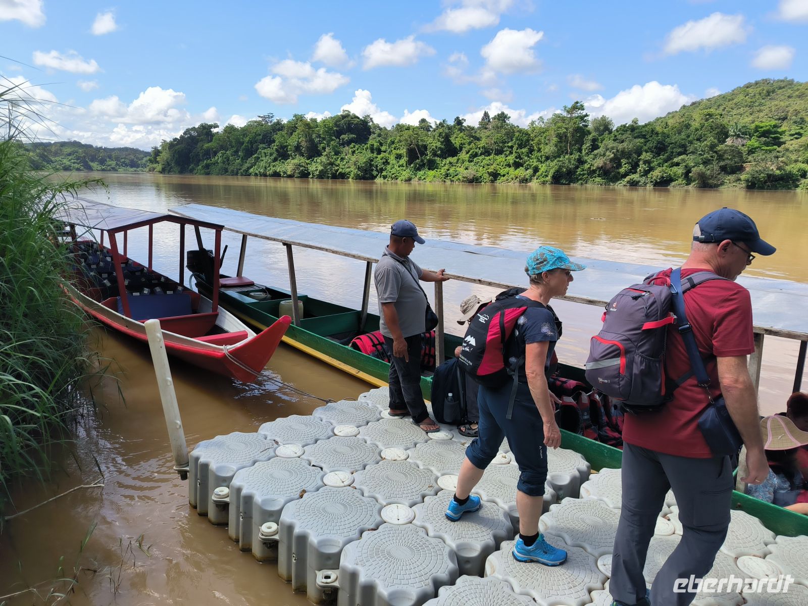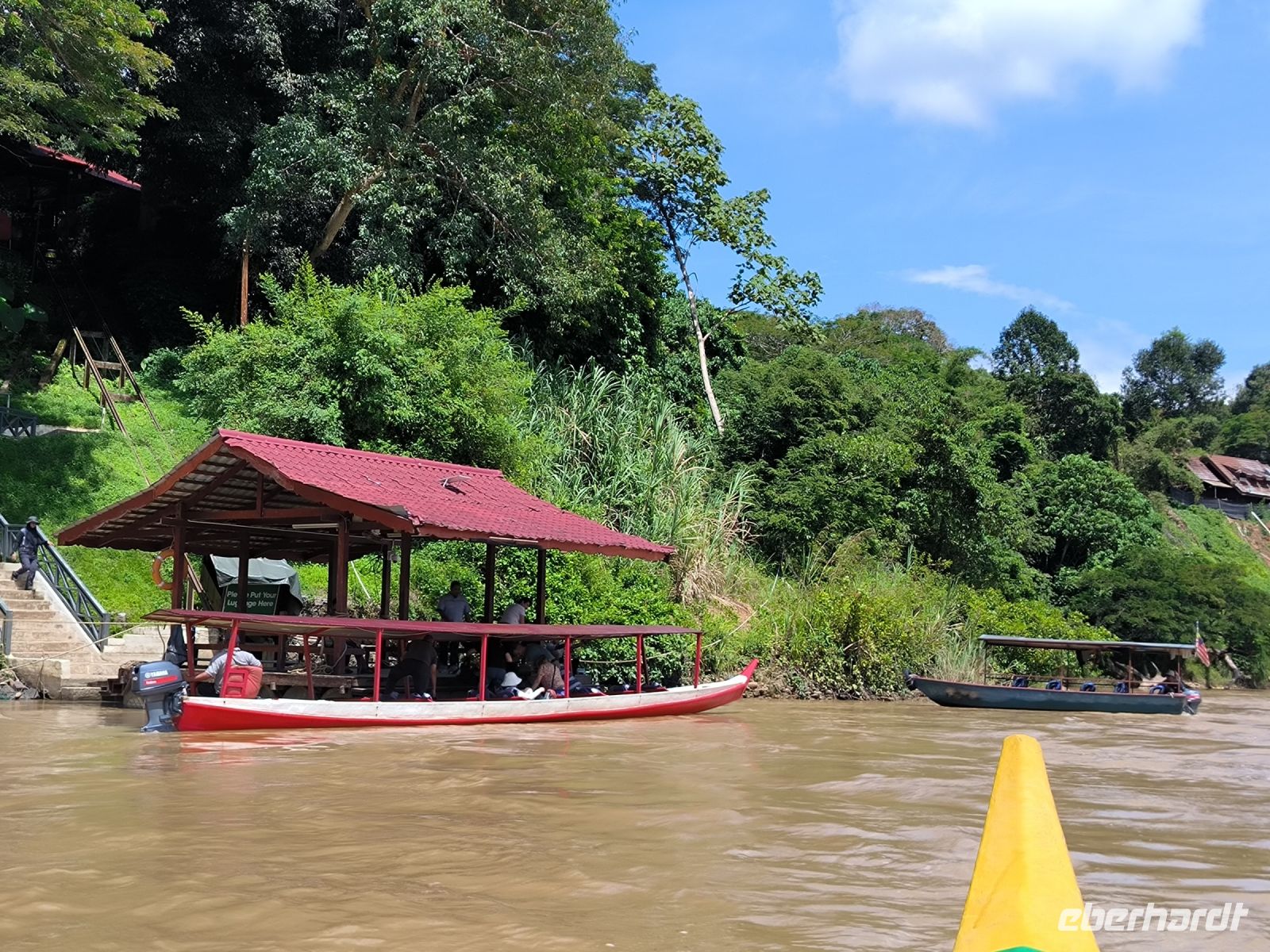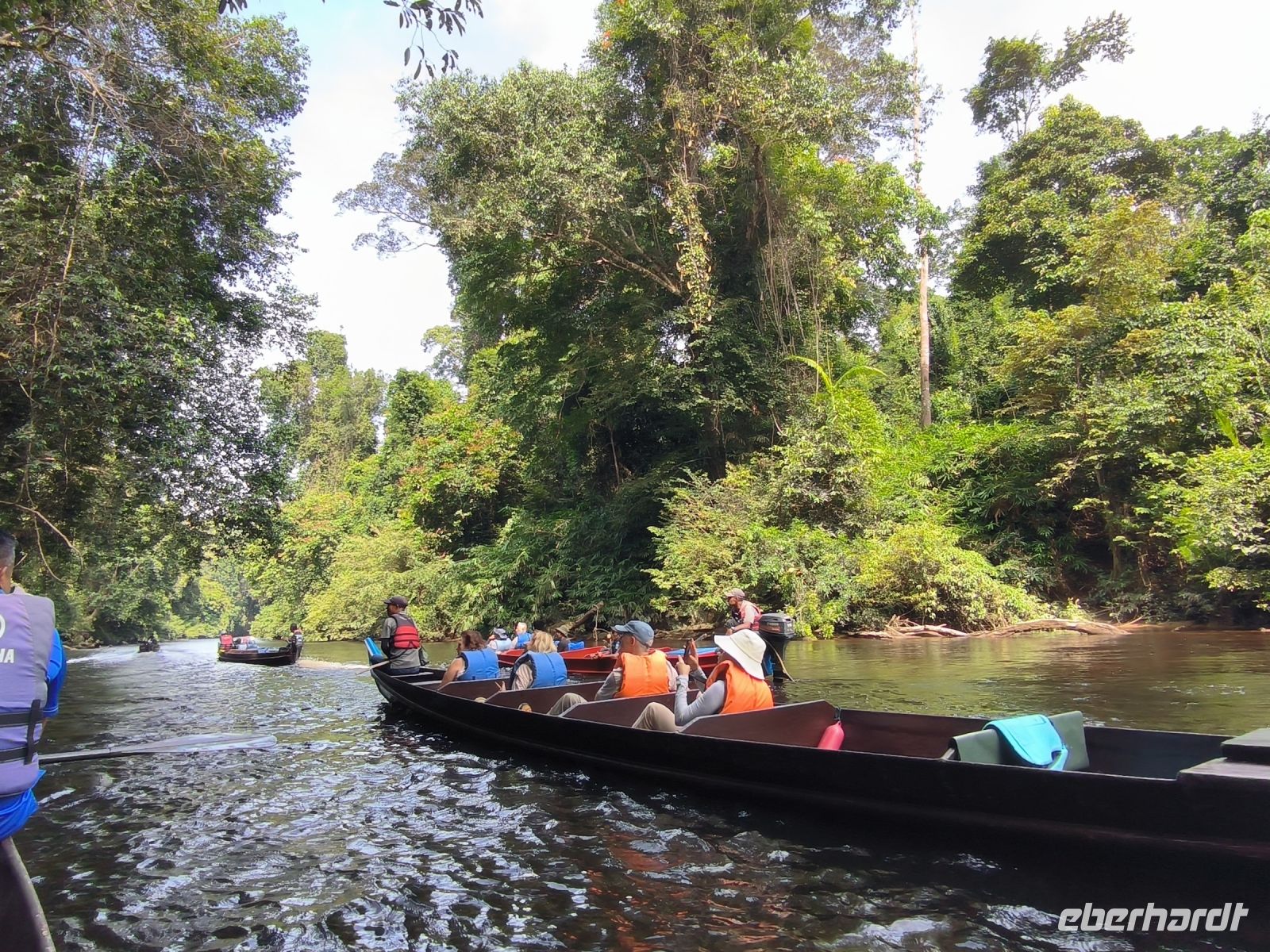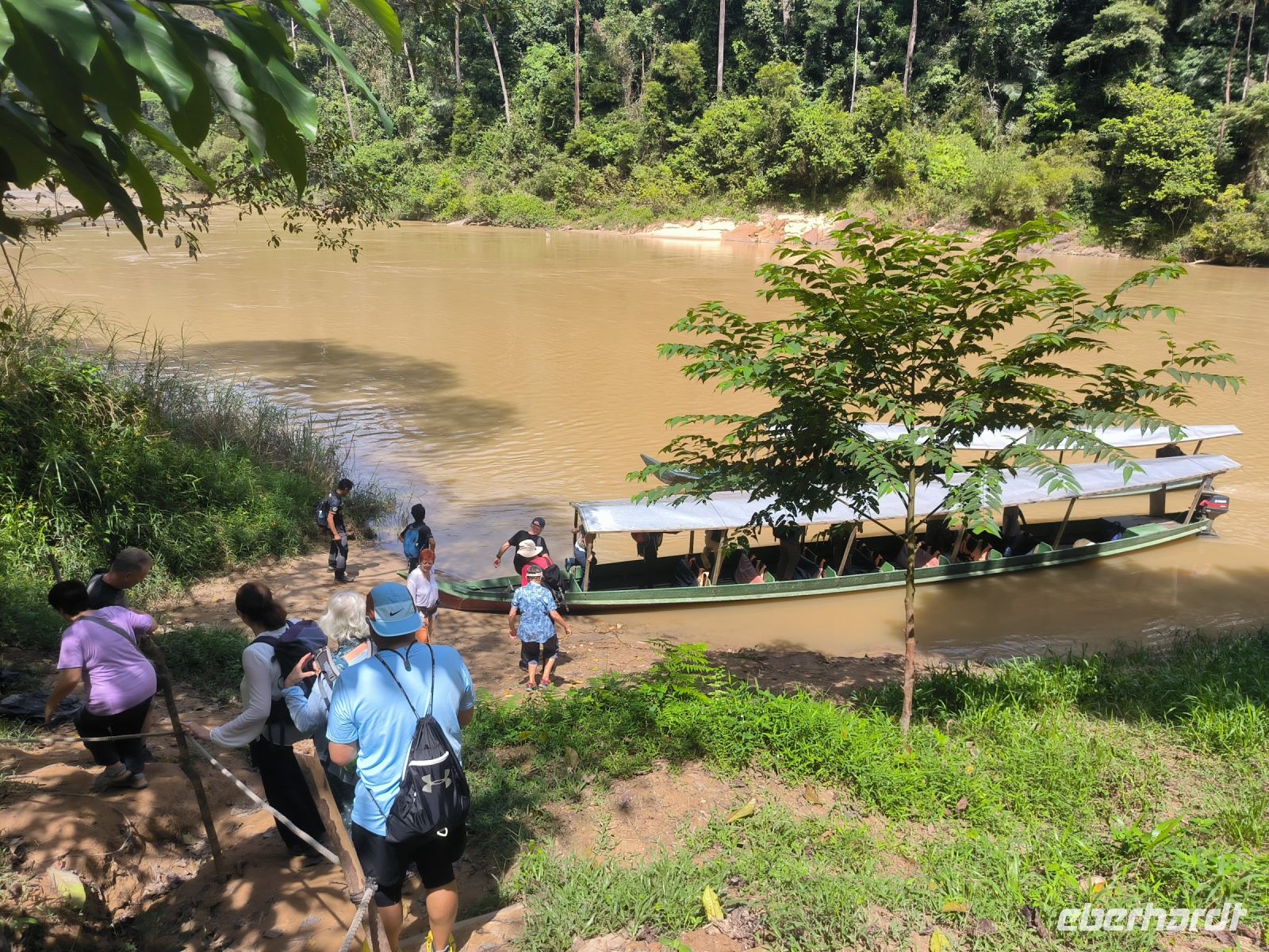 Nach dem Mittagessen im Resort besteigen wir dann wieder die offenen Langboote, um noch tiefer in den Dschungel zu fahren. Es ist eine herrliche Fahrt mit vielen Stromschnellen. Da werden wir auch mal schnell nassgespritzt. Aber das tut dem Genuss keinen Abbruch, es ist ja warm. Gekonnt schlängeln unsere Skipper die Boote durch die Gesteinsbrocken und Sandbänke. Blauer Himmel und Sonnenschein, hohe Bäume mit schlingenden Lianen und ein paar Affen machen diese Wildwasserfahrt zum Erlebnis.