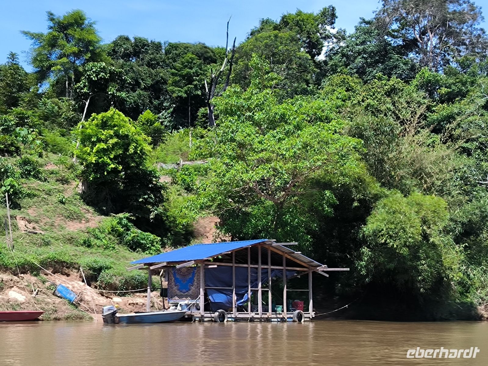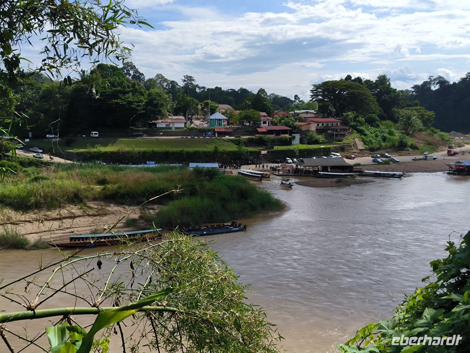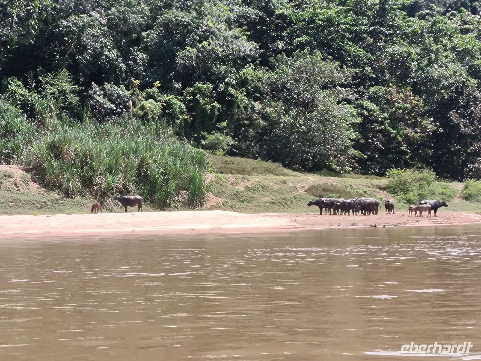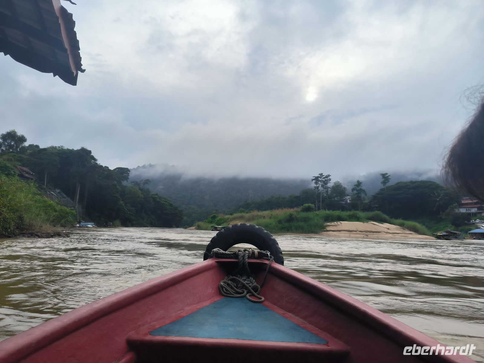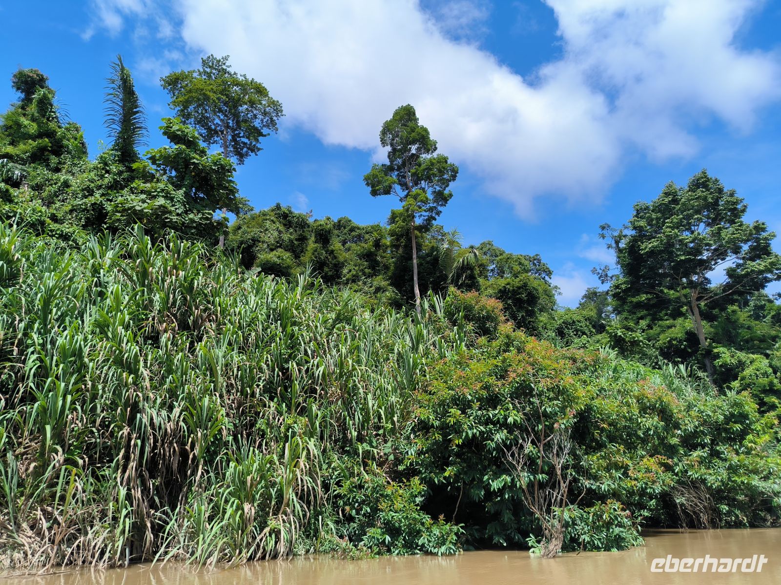 Nach dem Mittagessen im Resort besteigen wir dann wieder die offenen Langboote, um noch tiefer in den Dschungel zu fahren. Es ist eine herrliche Fahrt mit vielen Stromschnellen. Da werden wir auch mal schnell nassgespritzt. Aber das tut dem Genuss keinen Abbruch, es ist ja warm. Gekonnt schlängeln unsere Skipper die Boote durch die Gesteinsbrocken und Sandbänke. Blauer Himmel und Sonnenschein, hohe Bäume mit schlingenden Lianen und ein paar Affen machen diese Wildwasserfahrt zum Erlebnis.