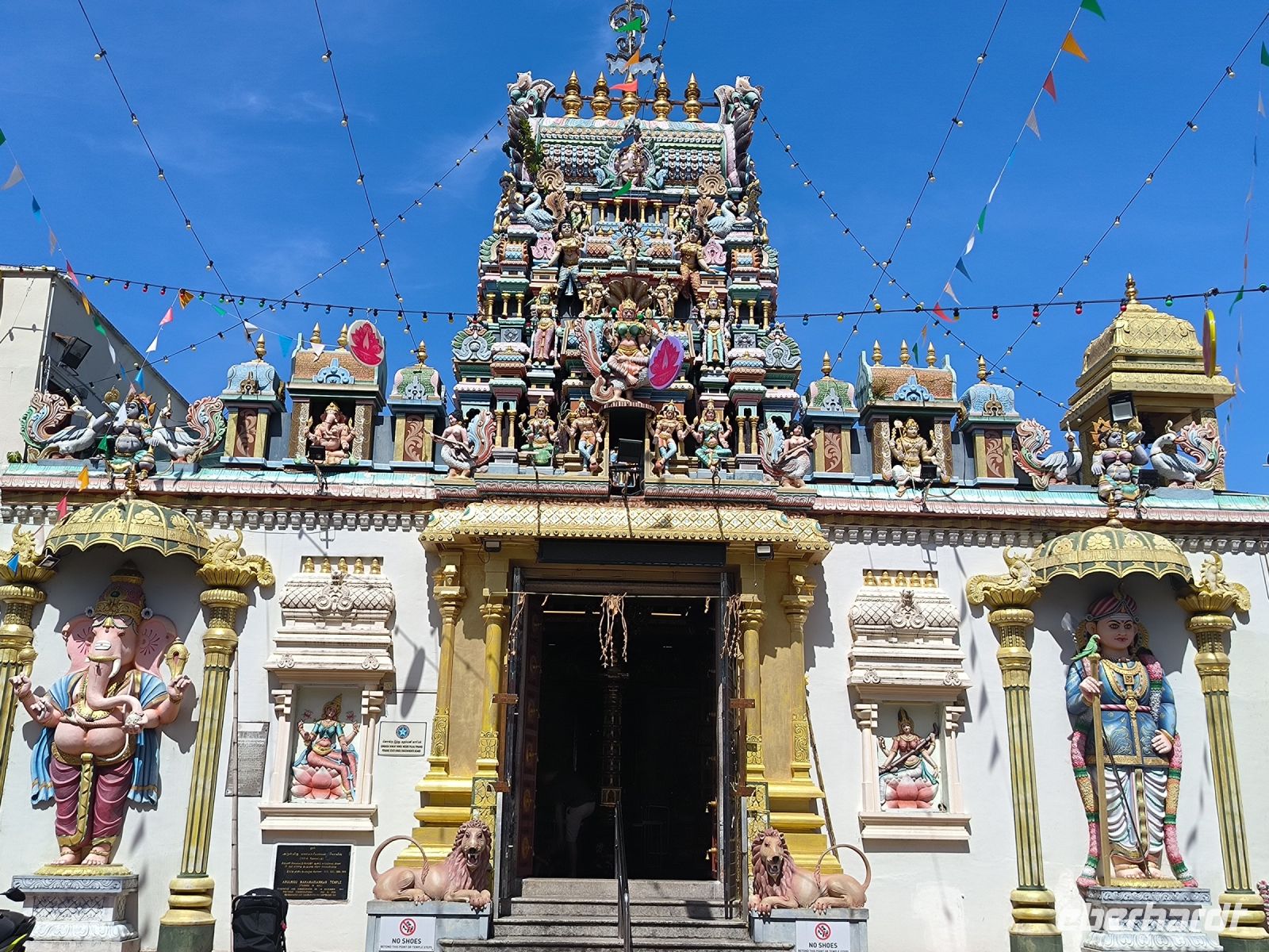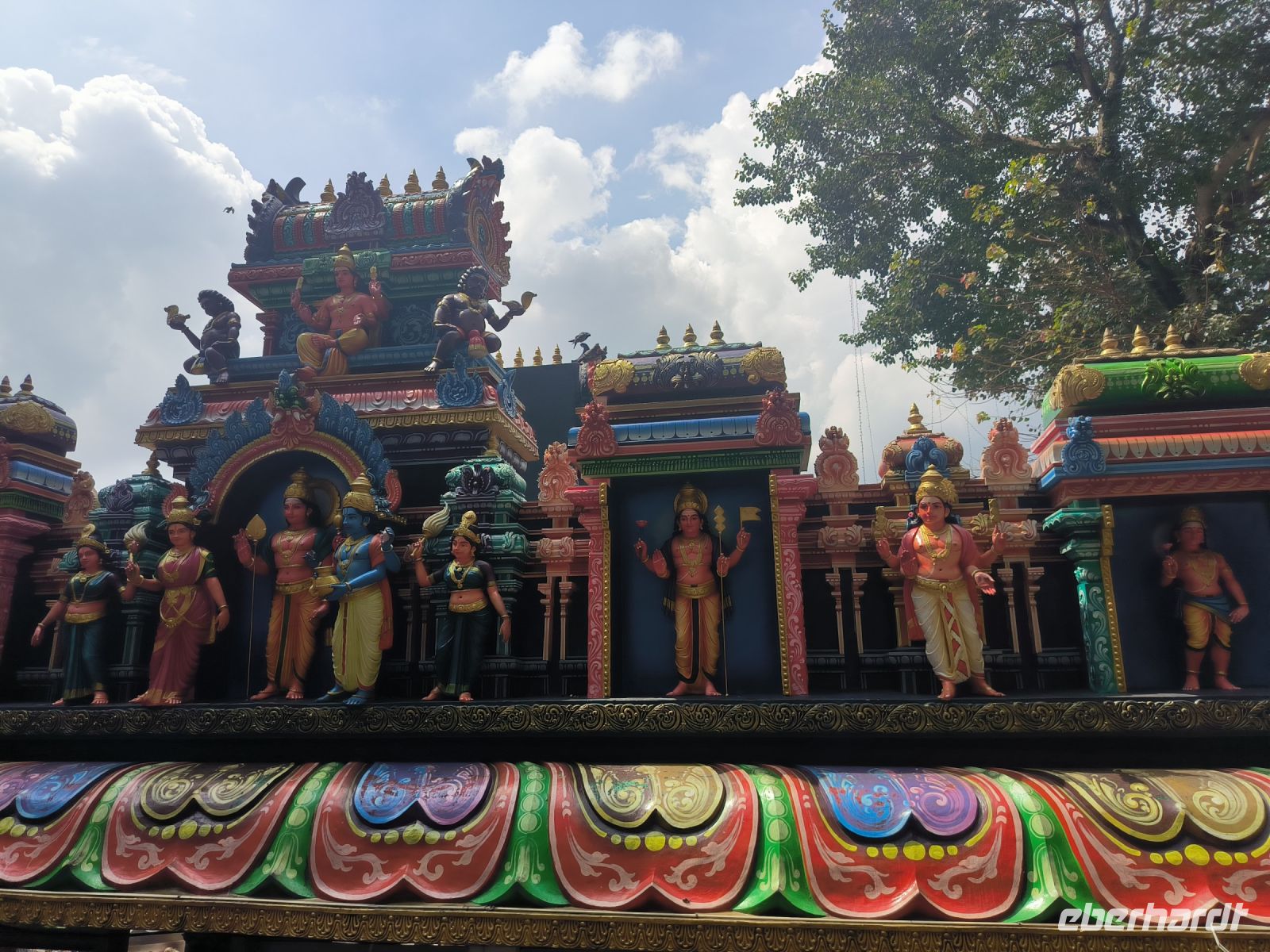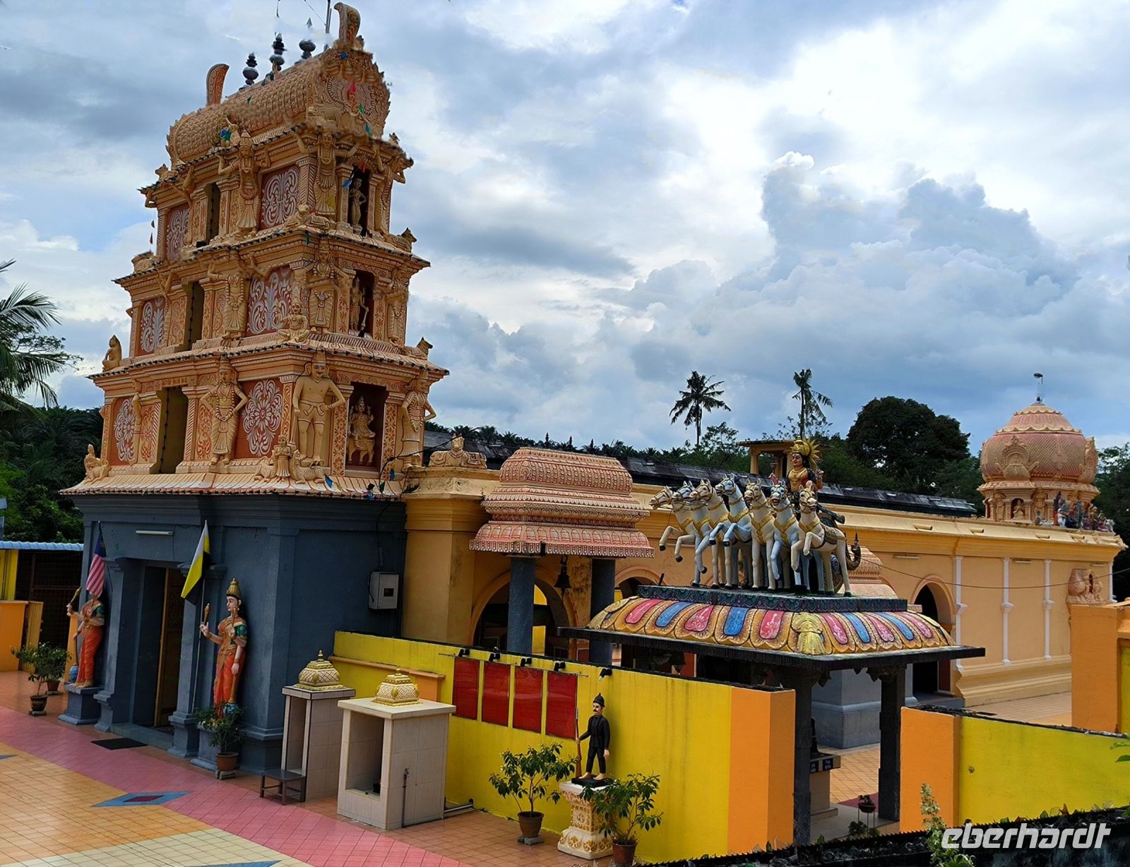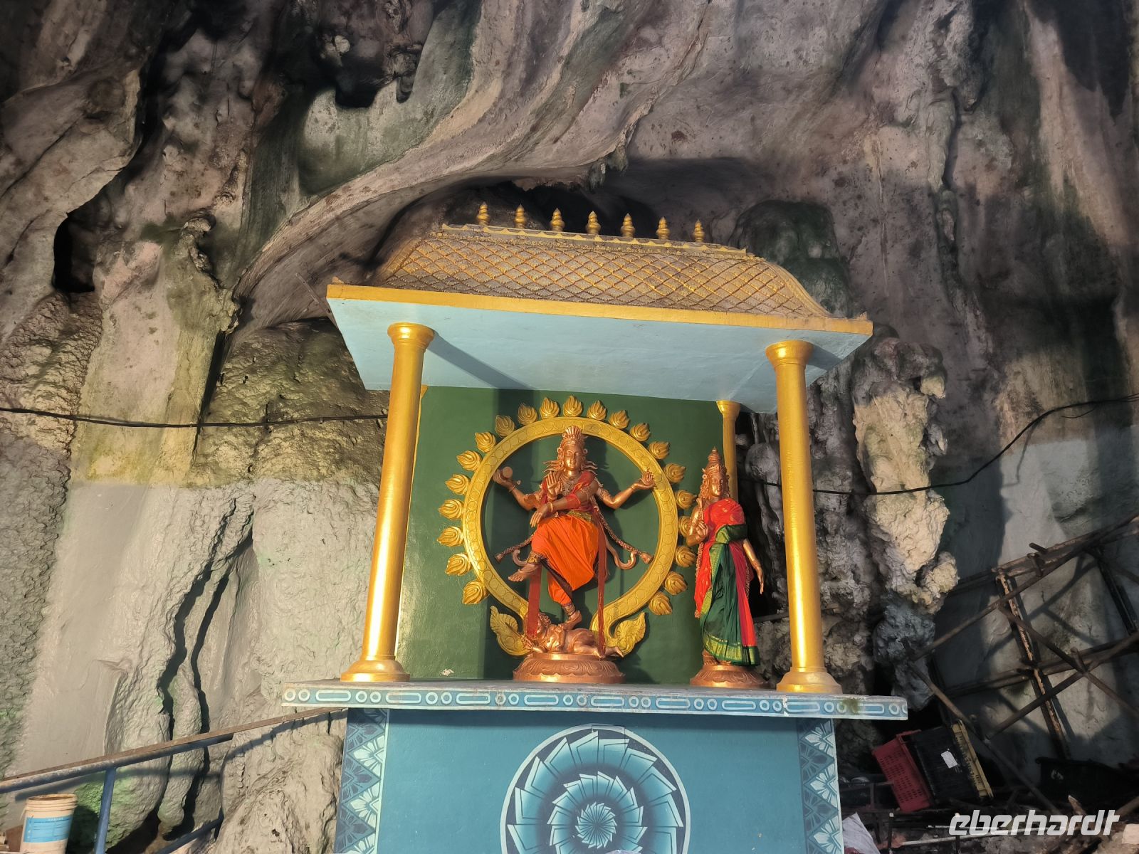272 steile Treppenstufen führen vom Vorplatz zunächst hinauf zum Eingang der Haupthöhle, bewacht von der 42,7 Meter hohen goldenen Statue Murugans auf dem Vorplatz Weitere Stufen gibt es im Inneren, wir überwinden insgesamt 356 davon. Viele Schreine erzählen die Geschichte vom Sieg des Gottes Murugan über den Dämon Soorapadam. Alljährlich Ende Januar oder Anfang Februar werden die Batu Caves zum Angelpunkt des hinduistischen Thaipusam-Festes mit seinen teilweise masochistisch anmutenden Riten, von denen uns Zul auf der Fahrt erzählt.