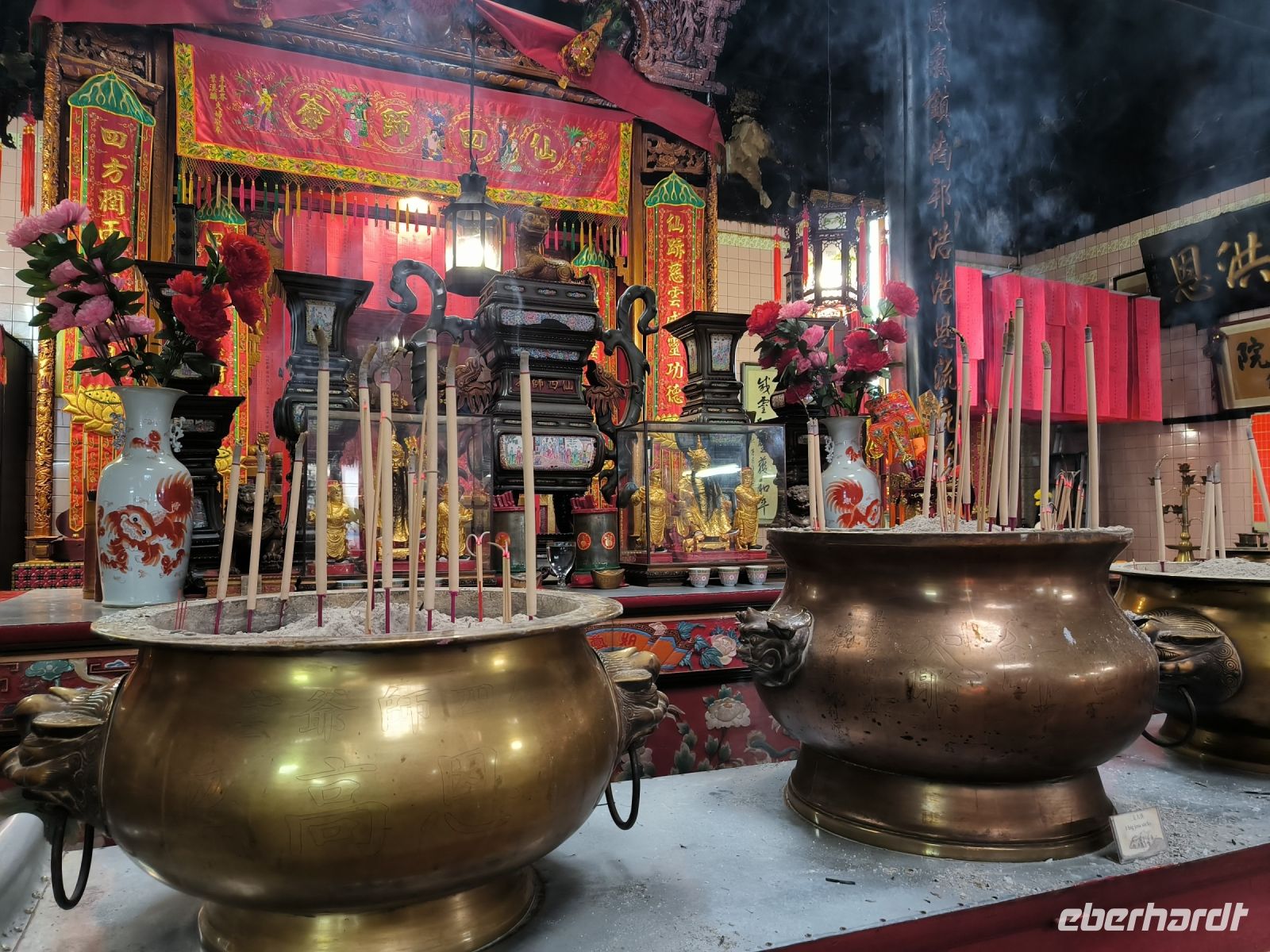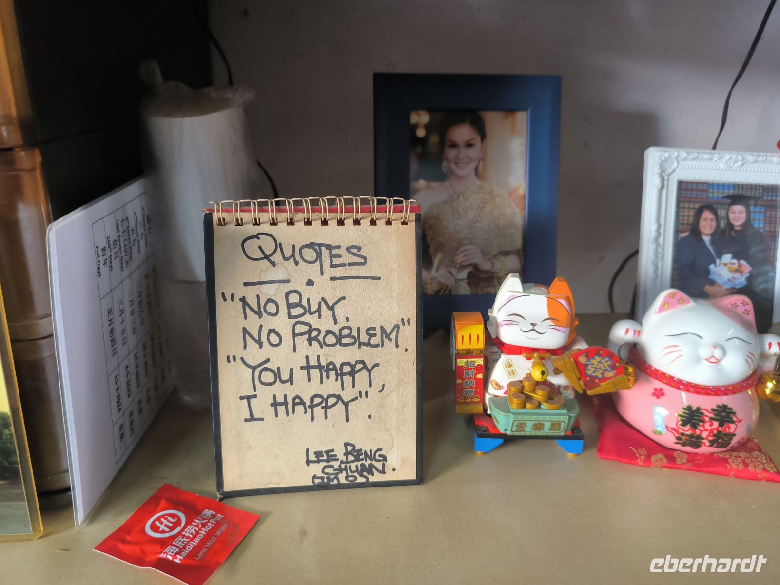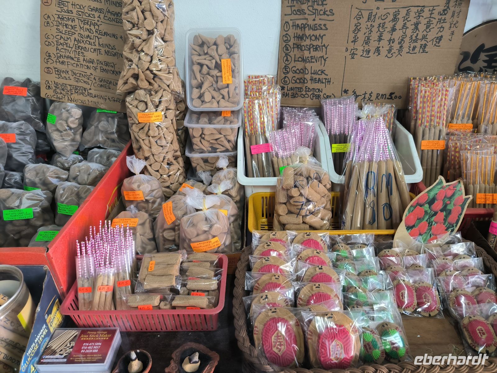 Interessant finden wir auch die traditionelle Handwerkskunst beim Räucherstäbchenmacher Lee Beng Chuan. Sein Motto „Kauf nix, kein Problem. Du bist glücklich, ich bin glücklich.“ Klingt tiefenentspannt. Wir kaufen trotzdem und sind auch glücklich.