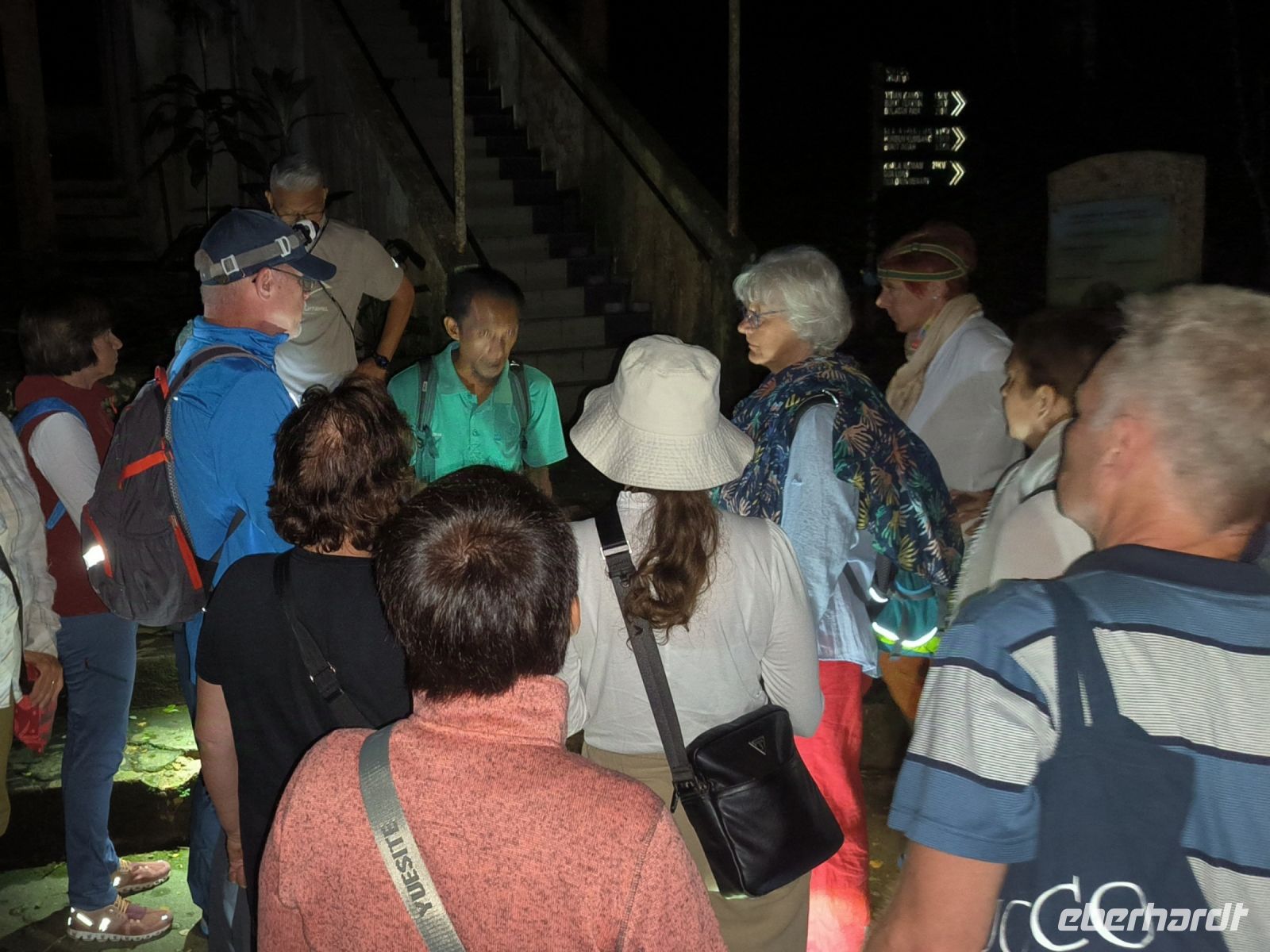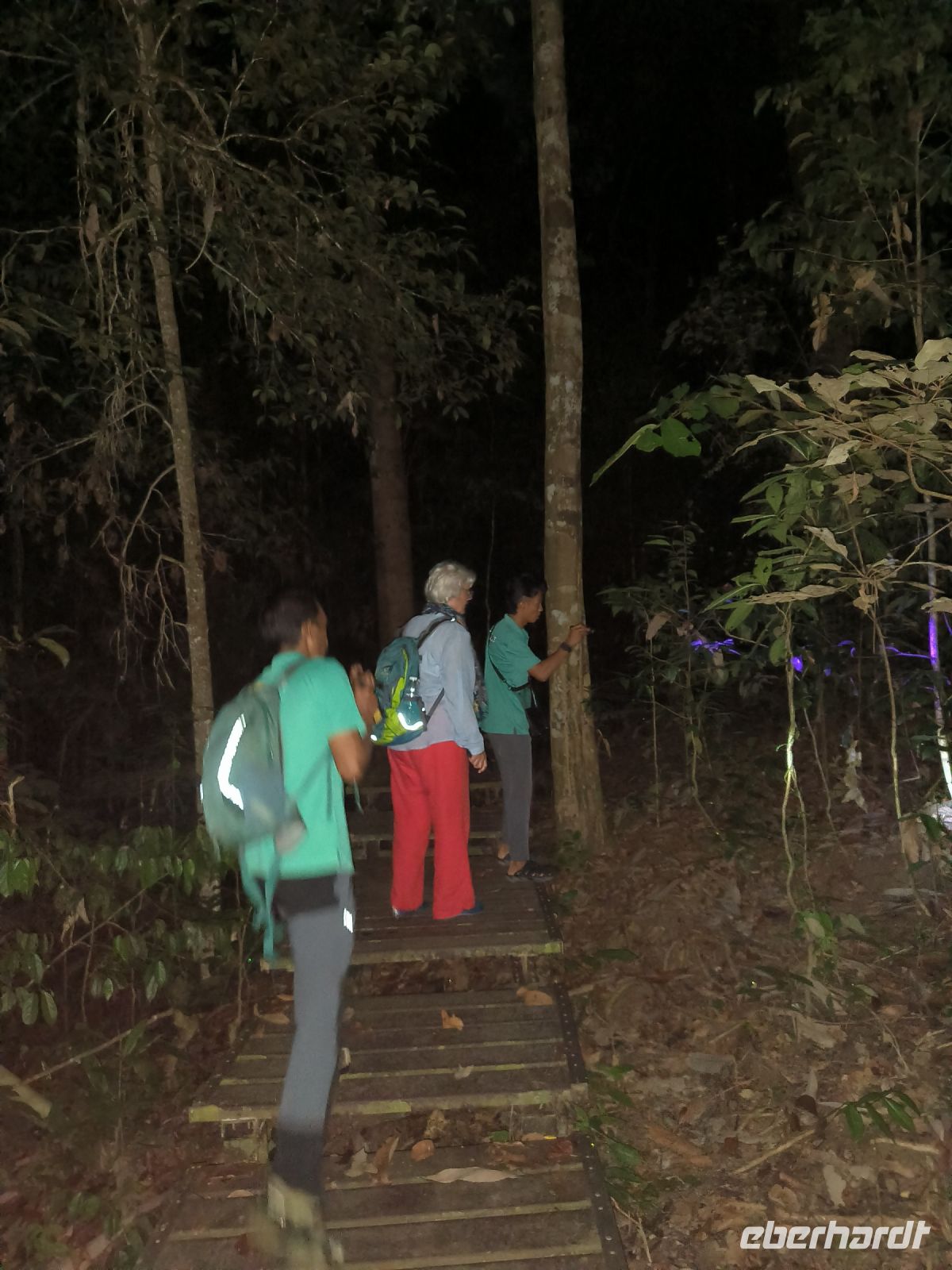 Am Nachmittag erkunden wir das auf der anderen Flussseite liegende muslimische Dorf Kuala Tahan, bevor wir – ausgerüstet mit Taschenlampen - am Abend zu einer spannenden Nachtwanderung aufbrechen. Wir lauschen dem Konzert der Natur und fühlen uns als Teil eines grandiosen Schauspiels. Dabei lernen wir von unseren beiden Rangerguides viel Wissenswertes über den Dschungel und können einheimische Lebewesen wie giftgrüne Schlangen, Skorpione, Spinnen, Stabheuschrecken und ein Chamäleon entdecken.