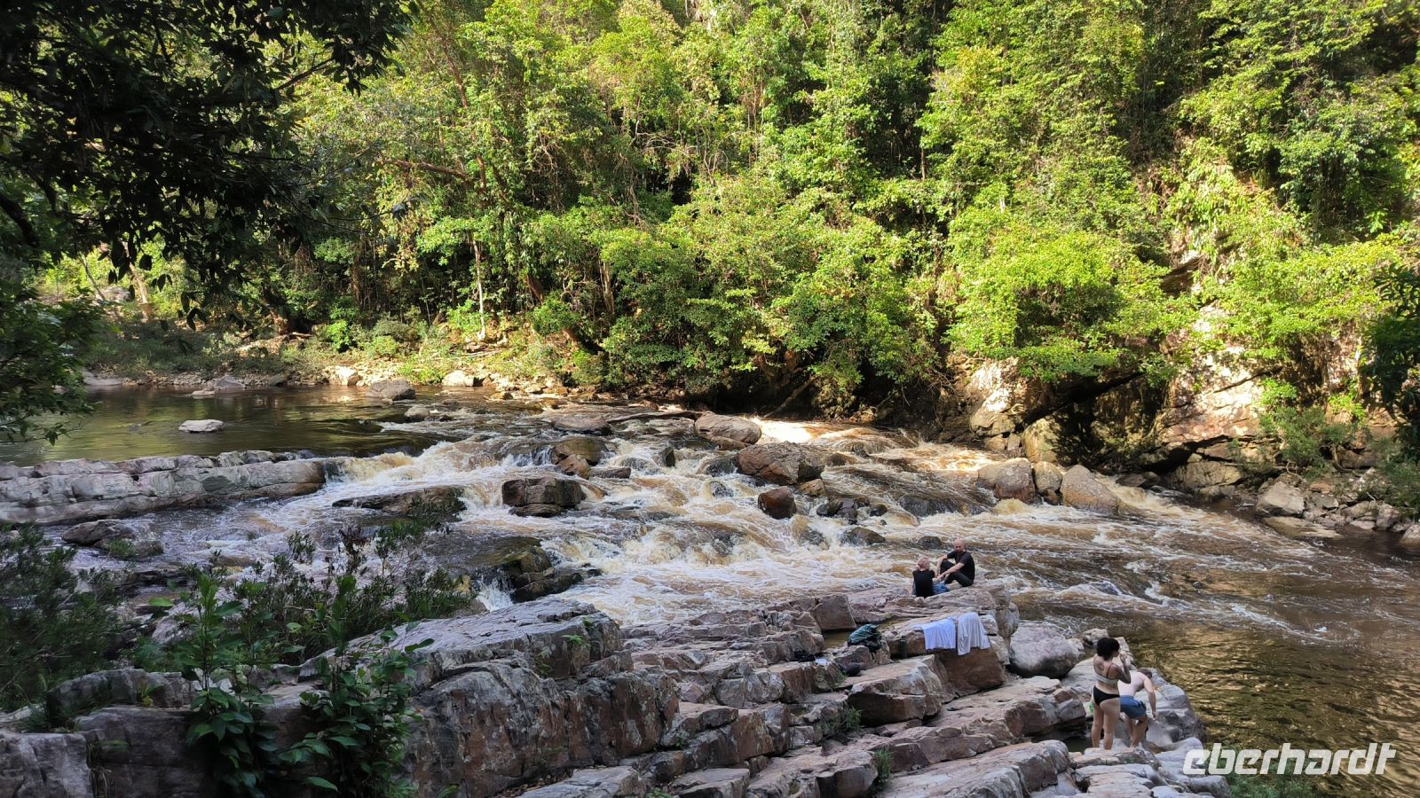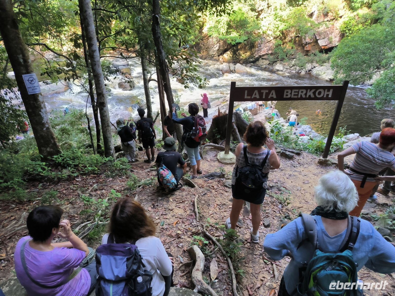 Unser Ziel ist Lata Berkoh. Als die Boote in dem flachen Wasser nicht mehr weiter fahren können, steigen wir aus und wandern auf einem recht unebenen Weg am Flussufer entlang bis zu den Kaskaden, die ein kühles Bad ermöglichen. Solche „Eskapaden“ traut sich aber dann doch keiner von uns. Auf der Rückfahrt können wir – mit dem Strom schwimmend – einige Zeit die Motoren ausschalten und die Ruhe genießen. Wären da nicht die lauten Zikaden, ein paar Vogelstimmen oder ab und zu das Gekreische der Affen.