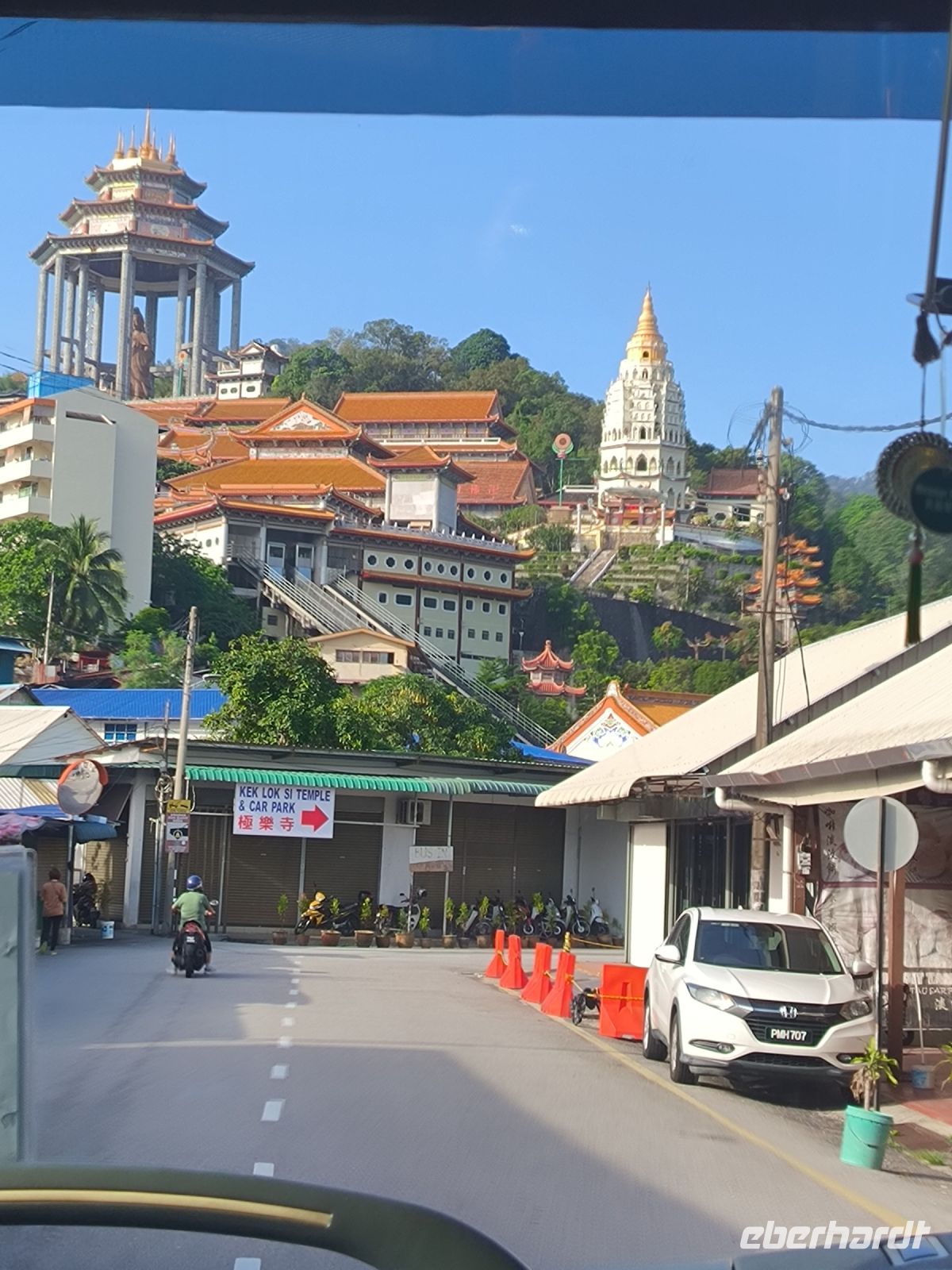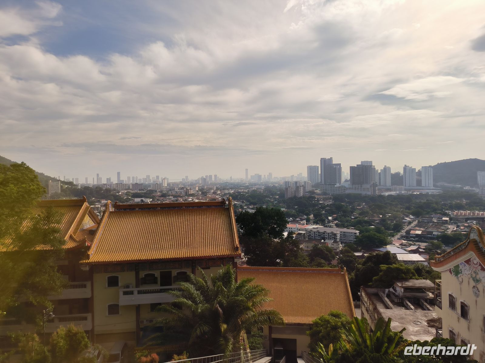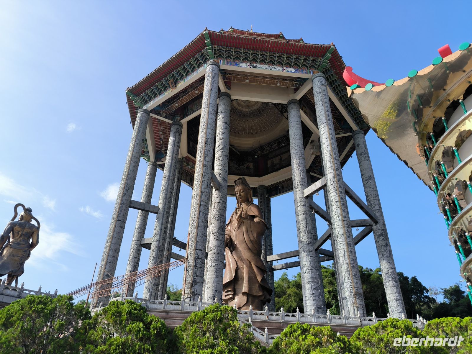 Es beginnt unser letzter Tag, aber so ganz am Ende ist die Reise noch nicht. Wir fahren zum buddhistischen Kek-Lok-Si Tempel am Rande der Stadt. Eine Standseilbahn und Jeeps bringen uns zum Eingang des Tempels auf den Hügel. Wir haben das Glück, einem Teil einer Zeremonie beiwohnen zu können. Ganz oben an der Spitze des Tempelkomplexes befindet sich die majestätische Statue von Kuan Yin, der Göttin der Barmherzigkeit. Mit fast 37 Metern Höhe ist die aus Bronze bestehende Statue eine der größten Statuen Malaysias. Sie überragt ganz Georgetown, segnet die Stadt und vielleicht auch uns. Ganz bestimmt wünscht sie uns eine gute Heimreise.