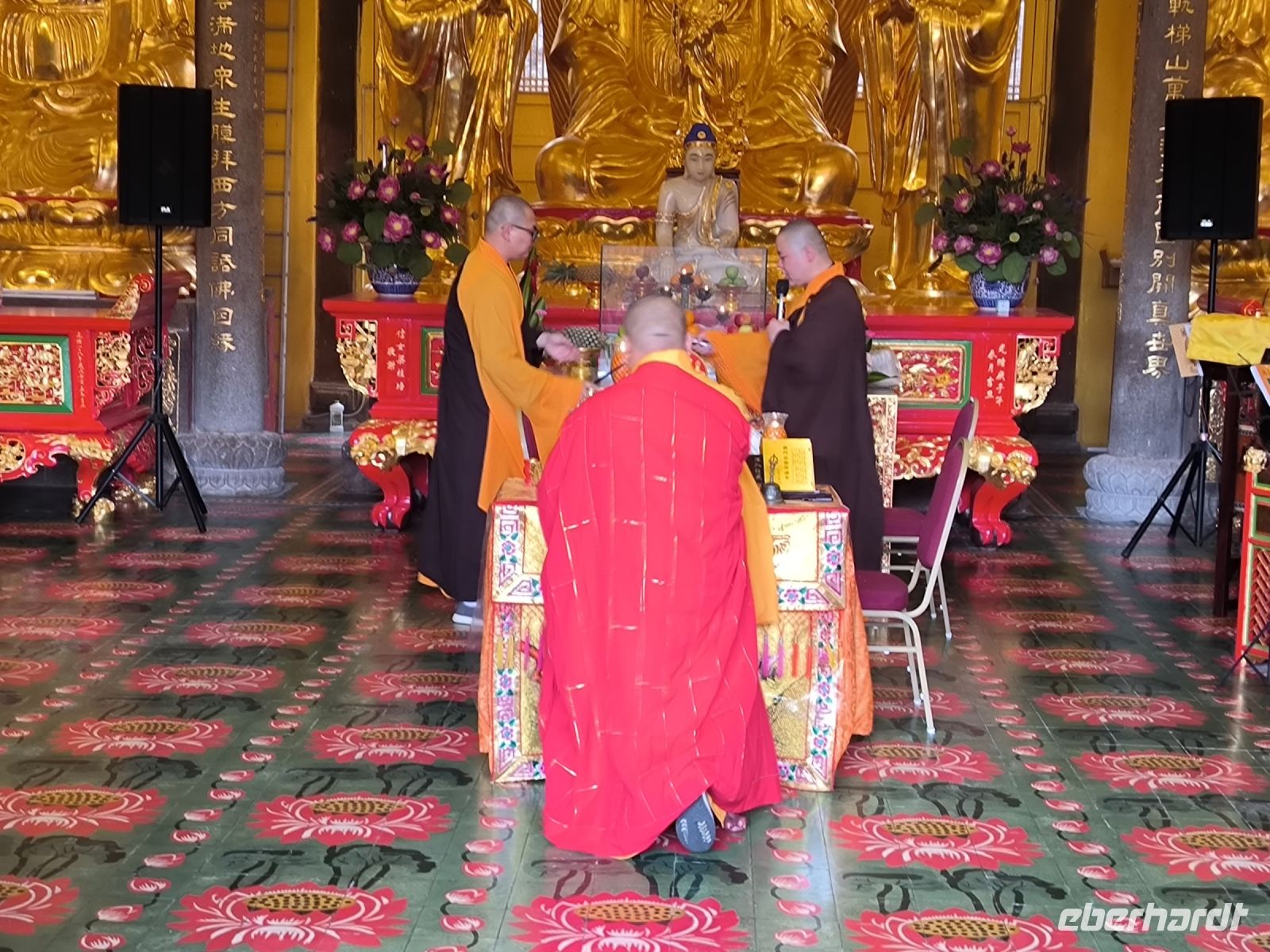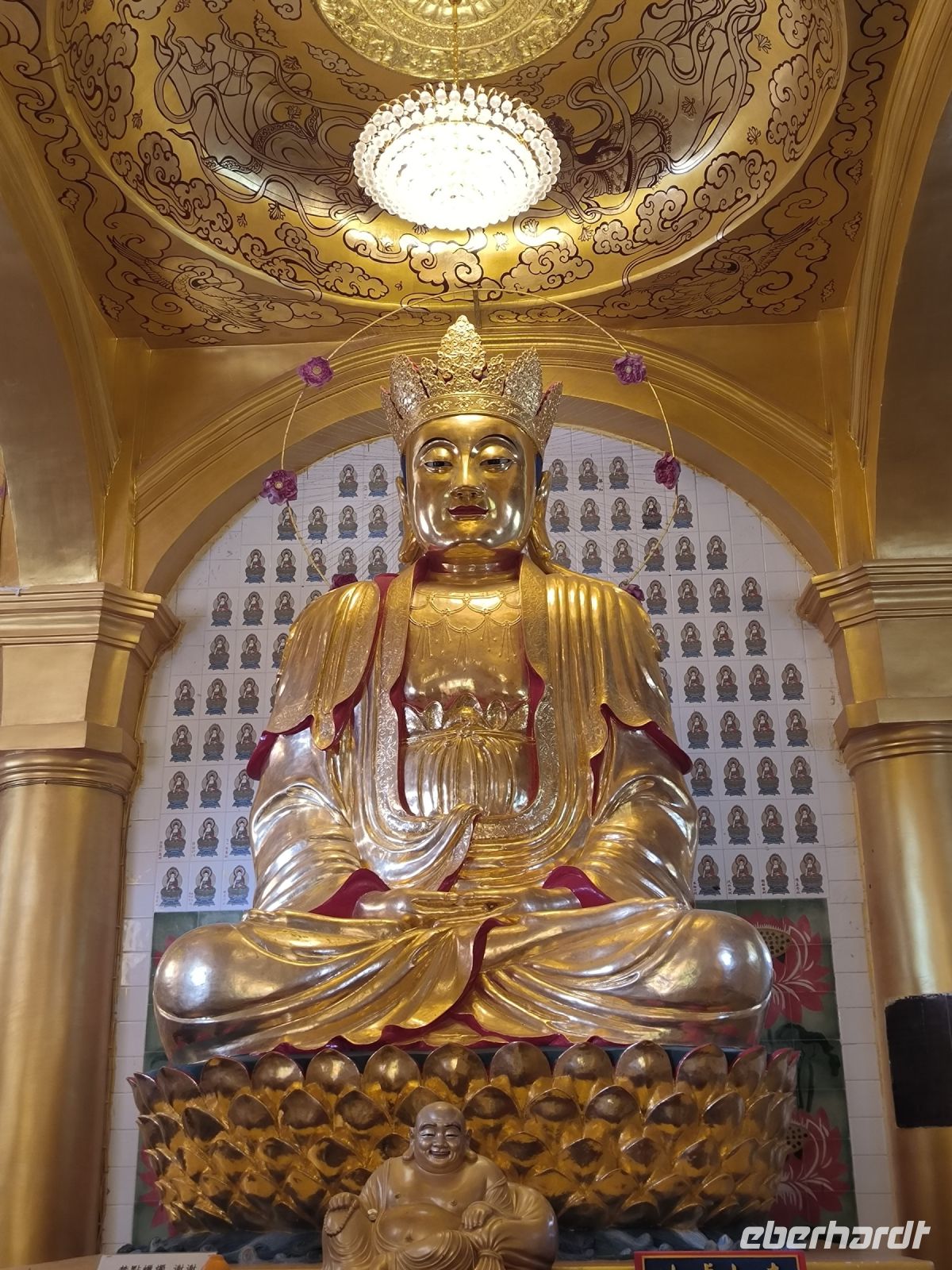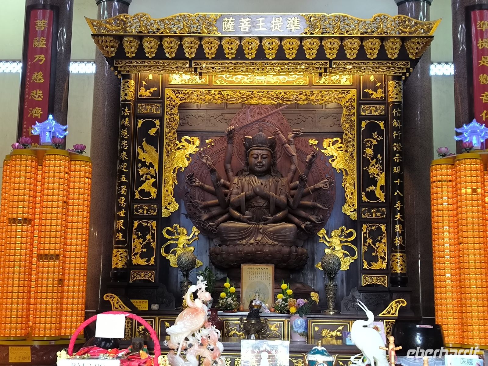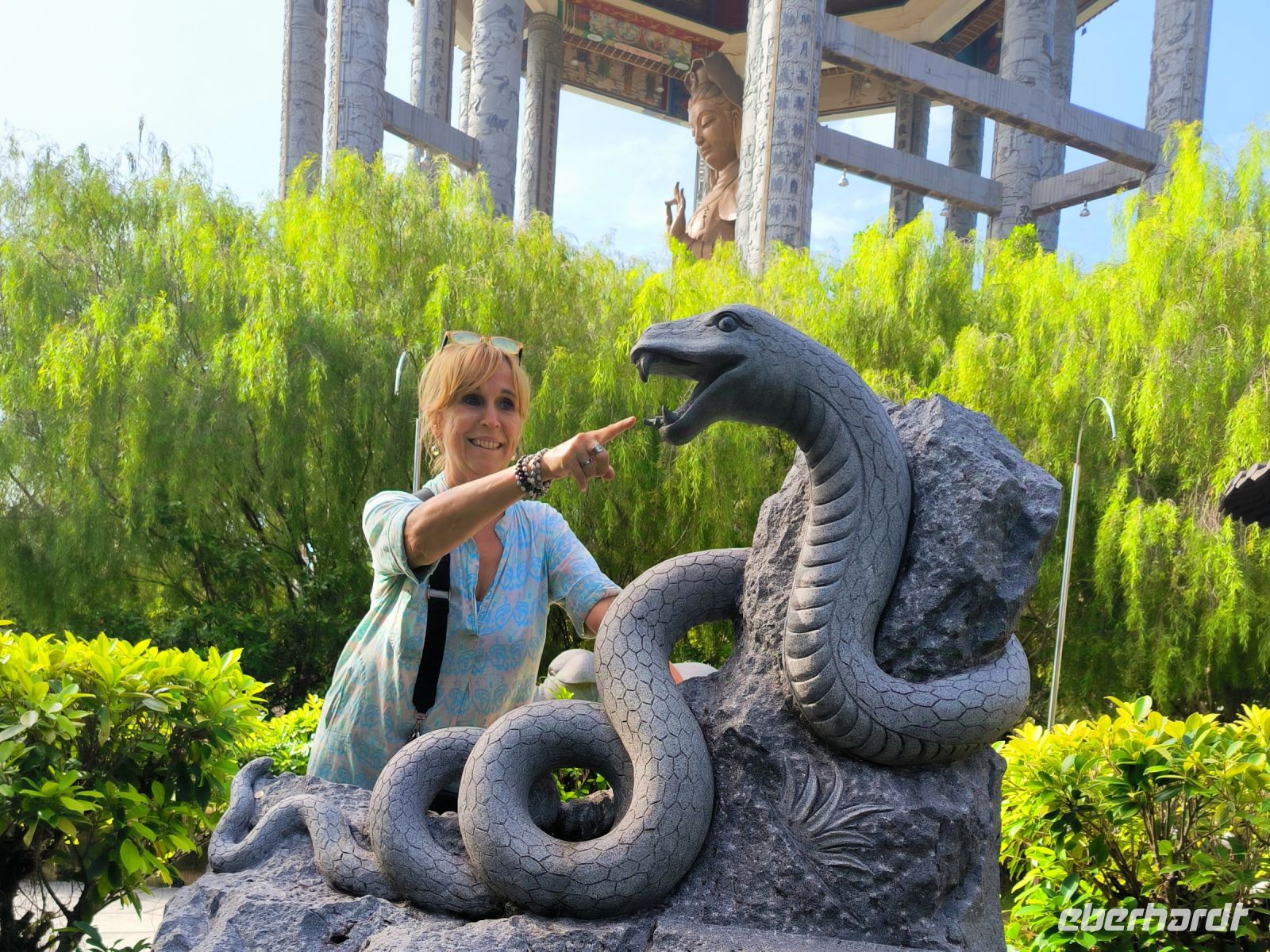 Es beginnt unser letzter Tag, aber so ganz am Ende ist die Reise noch nicht. Wir fahren zum buddhistischen Kek-Lok-Si Tempel am Rande der Stadt. Eine Standseilbahn und Jeeps bringen uns zum Eingang des Tempels auf den Hügel. Wir haben das Glück, einem Teil einer Zeremonie beiwohnen zu können. Ganz oben an der Spitze des Tempelkomplexes befindet sich die majestätische Statue von Kuan Yin, der Göttin der Barmherzigkeit. Mit fast 37 Metern Höhe ist die aus Bronze bestehende Statue eine der größten Statuen Malaysias. Sie überragt ganz Georgetown, segnet die Stadt und vielleicht auch uns. Ganz bestimmt wünscht sie uns eine gute Heimreise.