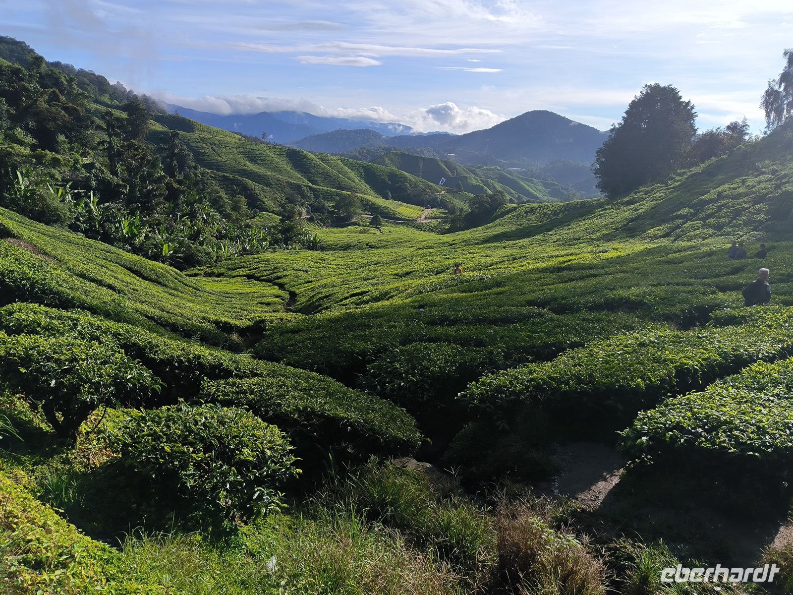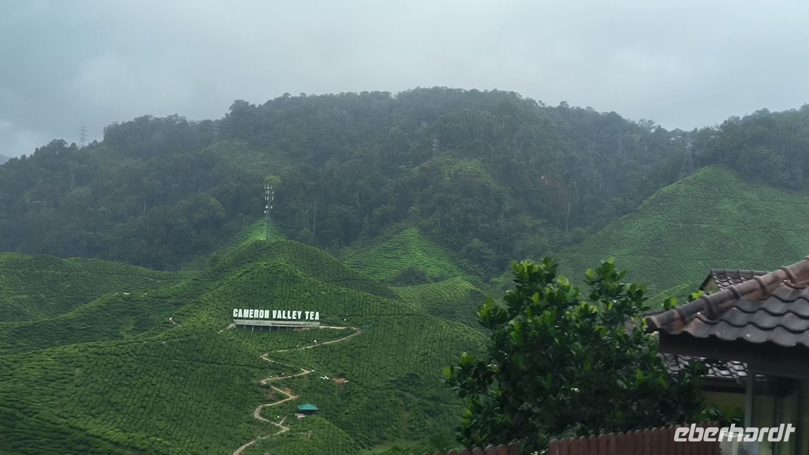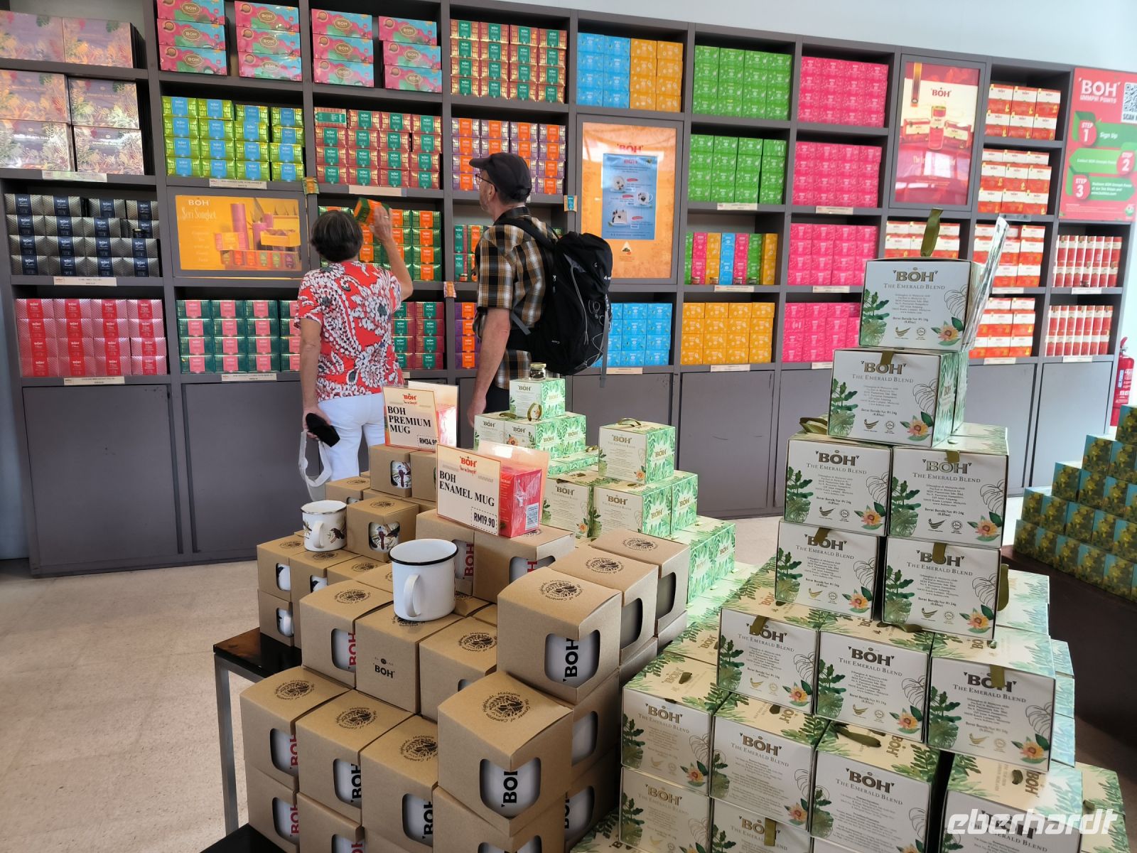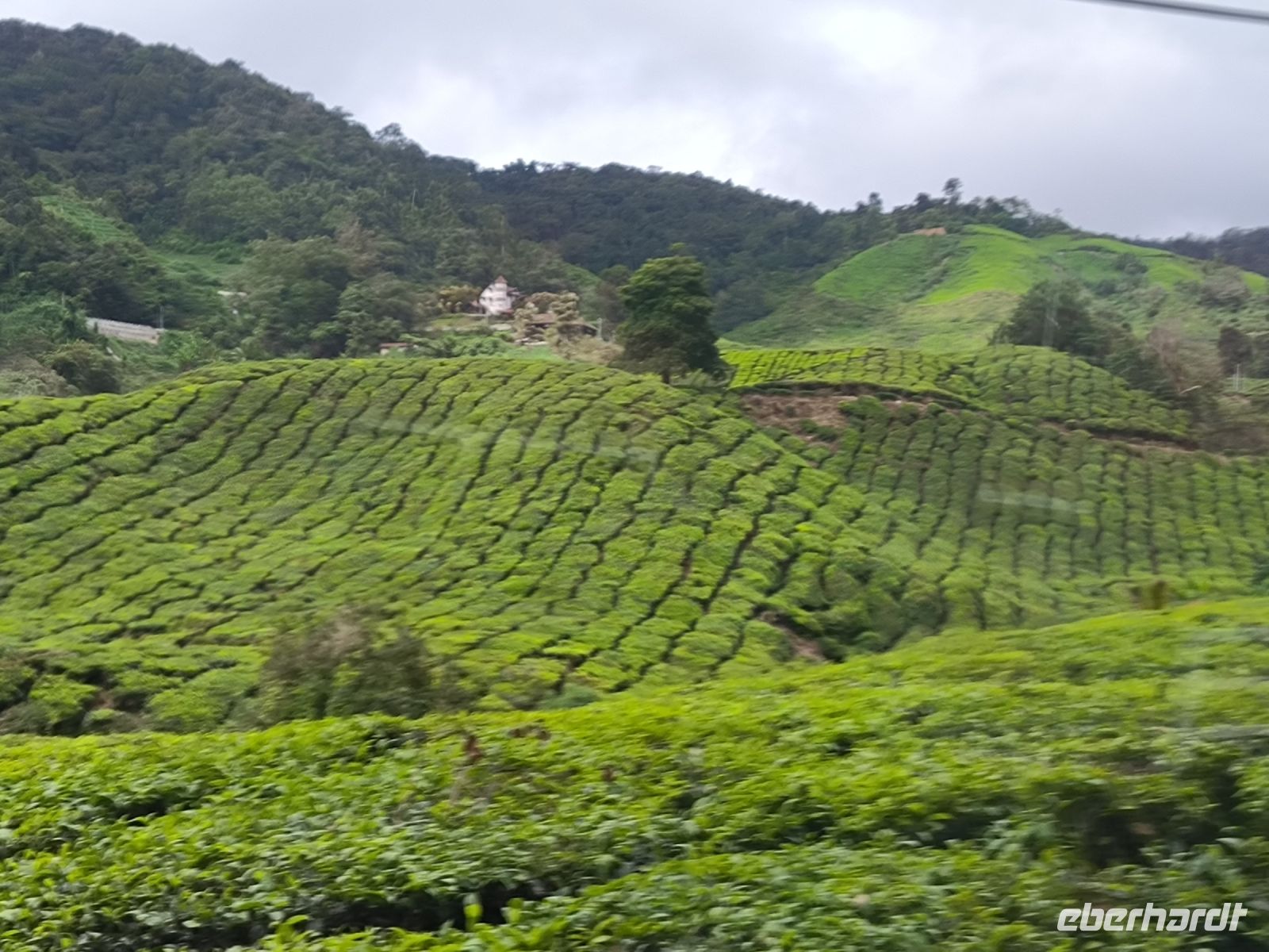 Wir müssen das schöne Hotel leider schon wieder verlassen und machen uns auf den Weg, um die BOH Tea Plantage zu besuchen. Hierfür müssen wir in einen der gelben Schulbusse umsteigen. Während die Kinder in der Schule sitzen, bringen die schmaleren Busse die Touristen die engen Straßen hinauf in die Teeplantagen. Wir haben einen tollen Blick über die besondere Struktur der Anbaufelder. Oben angekommen zeigt uns Zul einen Teil der Fabrik und erklärt die mühsame Herstellung des Tees. Hier dürfen keine Fotos gemacht werden. Natürlich gibt es im großen Besucherzentrum einen Shop, wo alle Teeprodukte gekauft werden können. Anschließend können wir auf der Terrasse mit der spektakulären Aussicht eine Tasse Palas Supreme Tee mit Scones genießen.