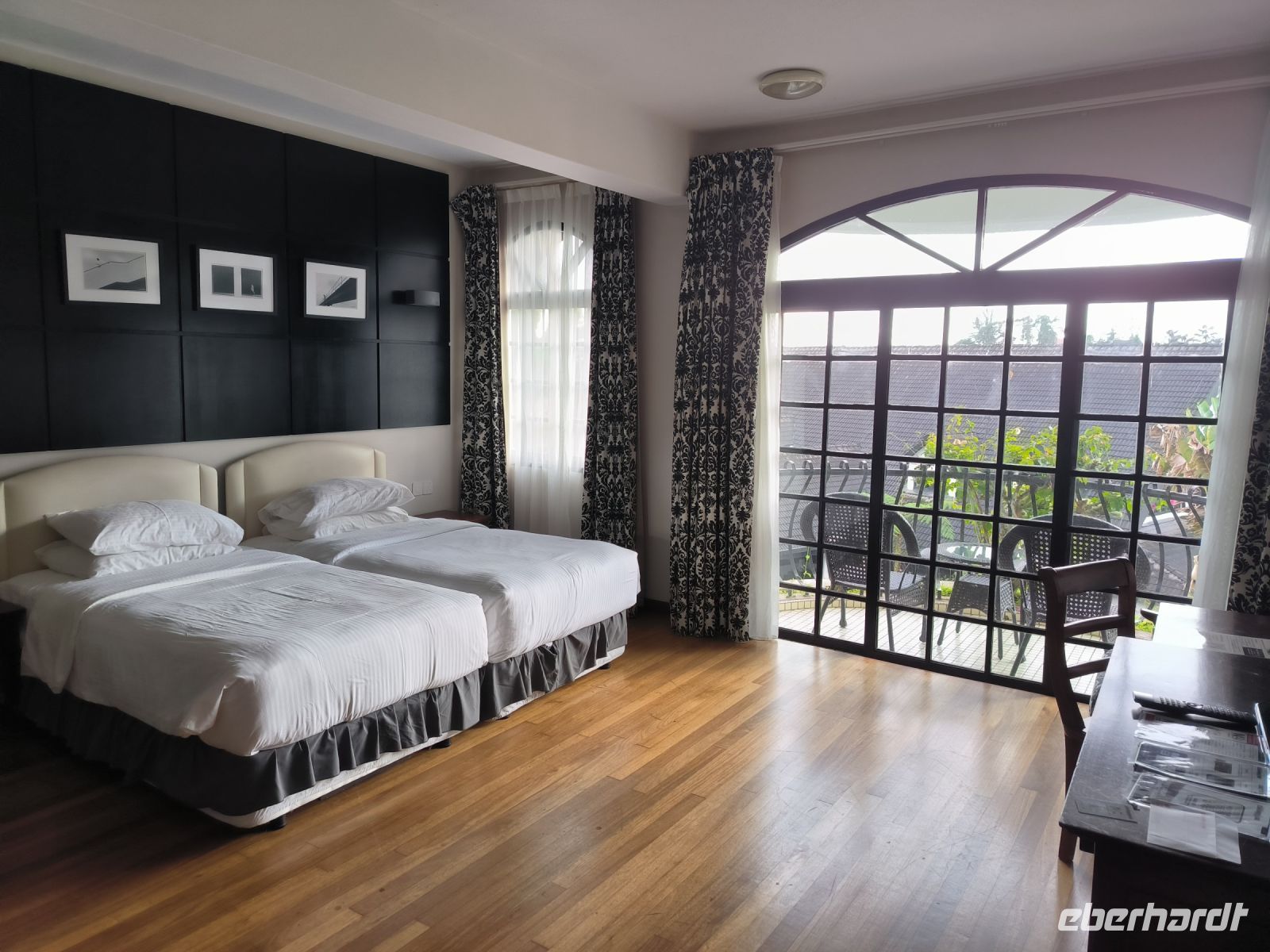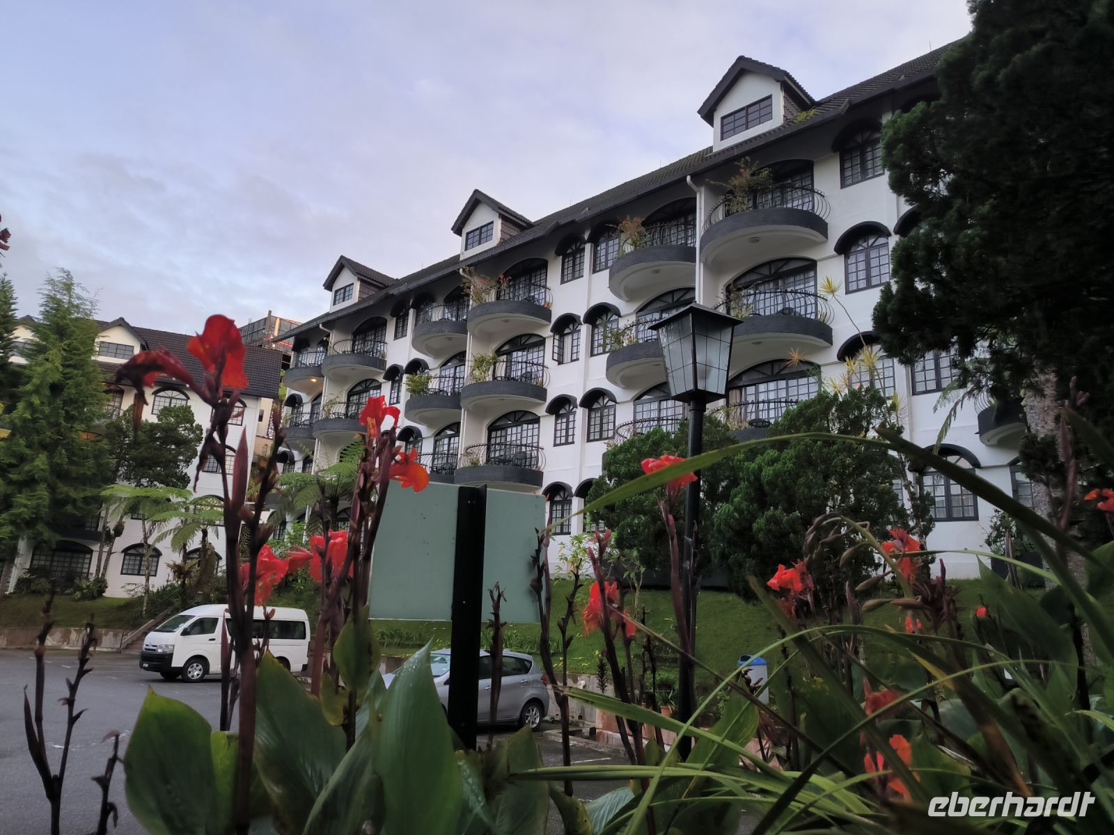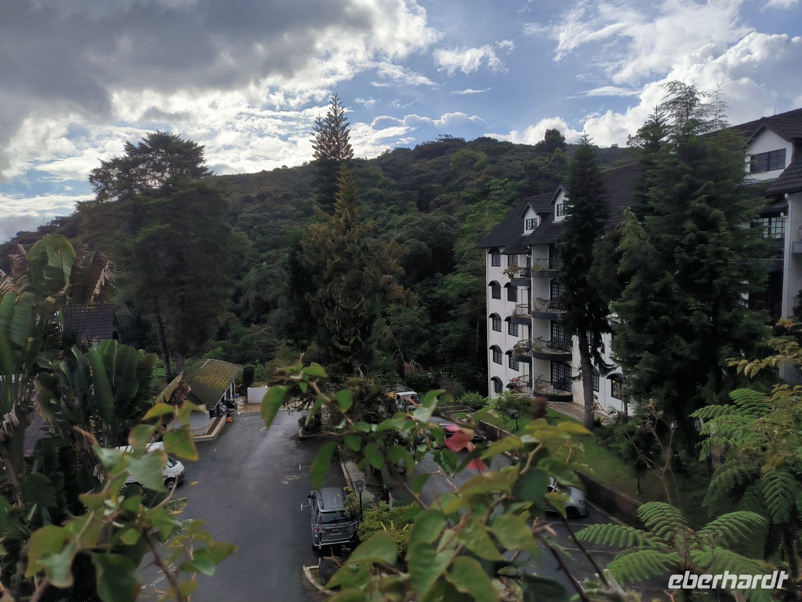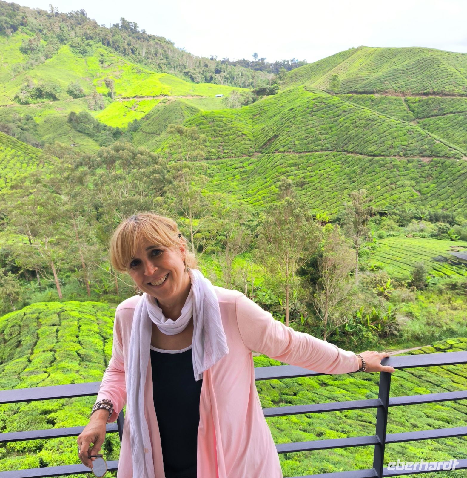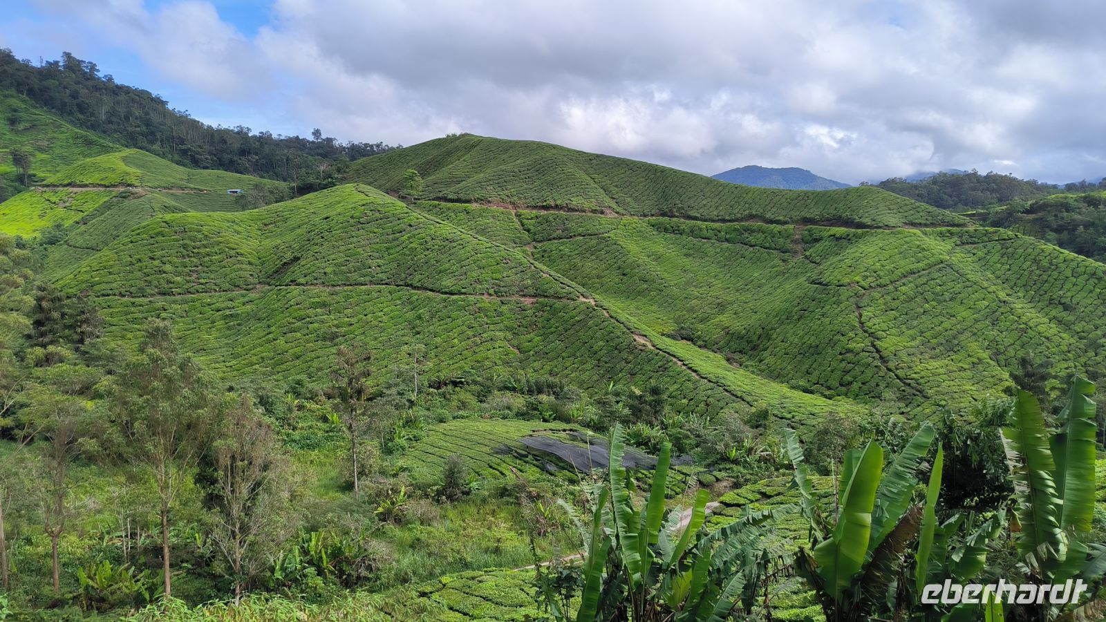 Wir müssen das schöne Hotel leider schon wieder verlassen und machen uns auf den Weg, um die BOH Tea Plantage zu besuchen. Hierfür müssen wir in einen der gelben Schulbusse umsteigen. Während die Kinder in der Schule sitzen, bringen die schmaleren Busse die Touristen die engen Straßen hinauf in die Teeplantagen. Wir haben einen tollen Blick über die besondere Struktur der Anbaufelder. Oben angekommen zeigt uns Zul einen Teil der Fabrik und erklärt die mühsame Herstellung des Tees. Hier dürfen keine Fotos gemacht werden. Natürlich gibt es im großen Besucherzentrum einen Shop, wo alle Teeprodukte gekauft werden können. Anschließend können wir auf der Terrasse mit der spektakulären Aussicht eine Tasse Palas Supreme Tee mit Scones genießen.