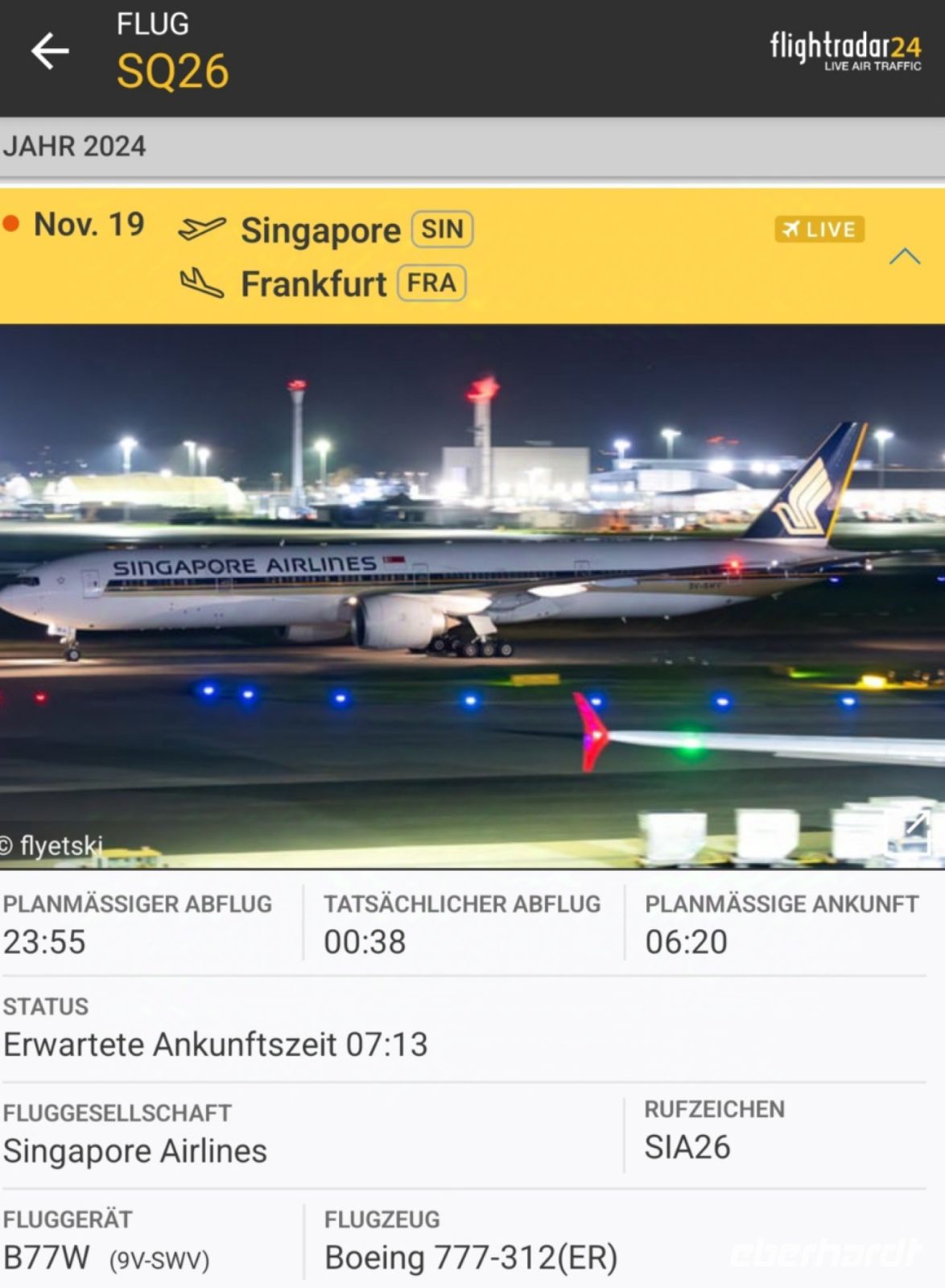 Tag 1: Donnerstag, 07.11.2024: Anreise und Treff der Gruppe am Frankfurter Flughafen, Flug nach Singapur