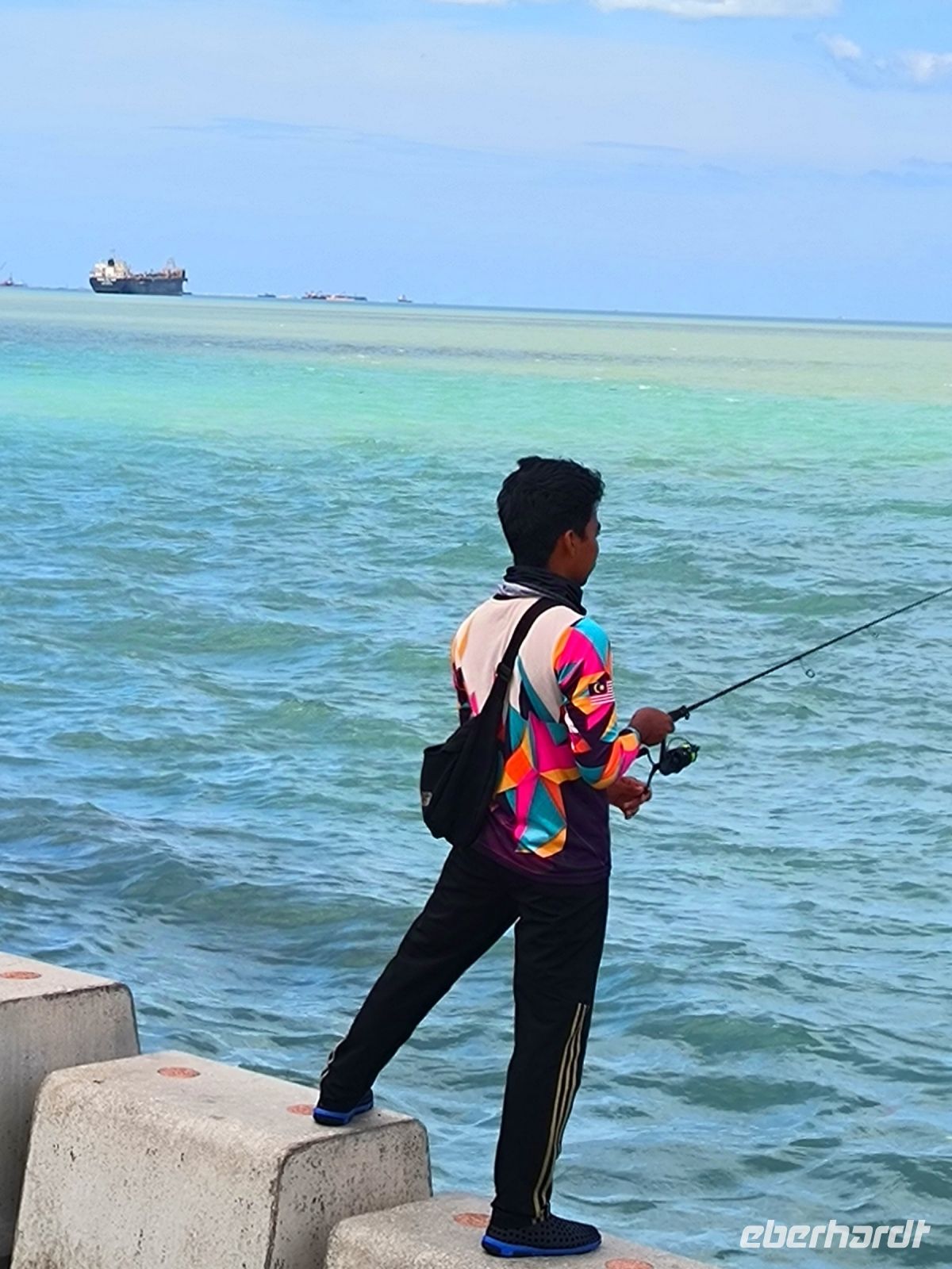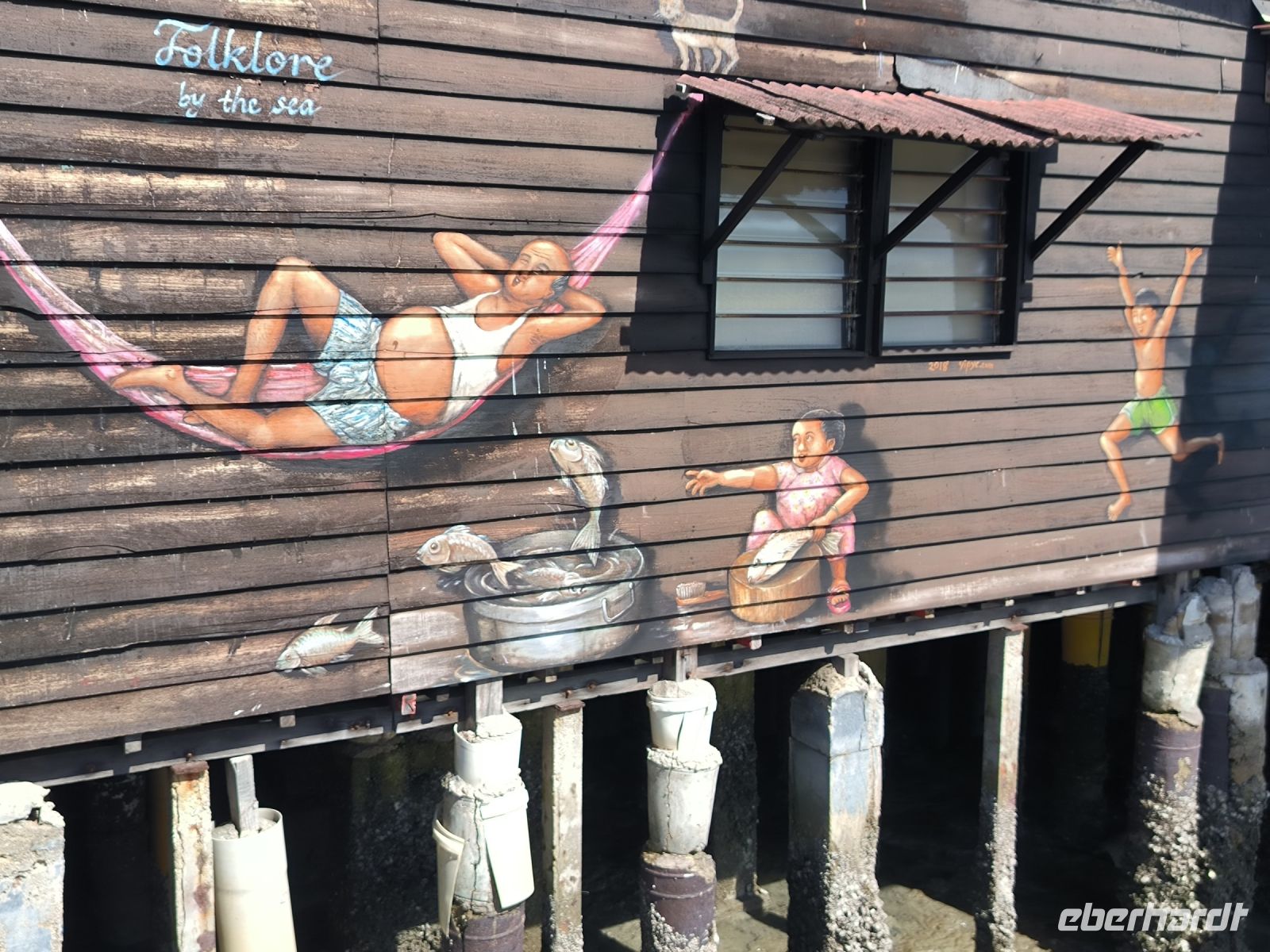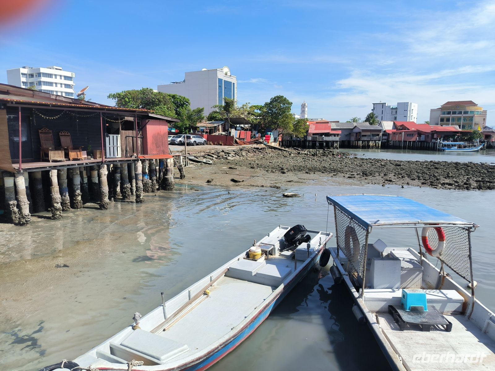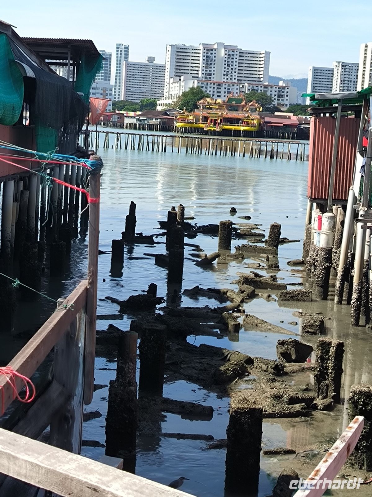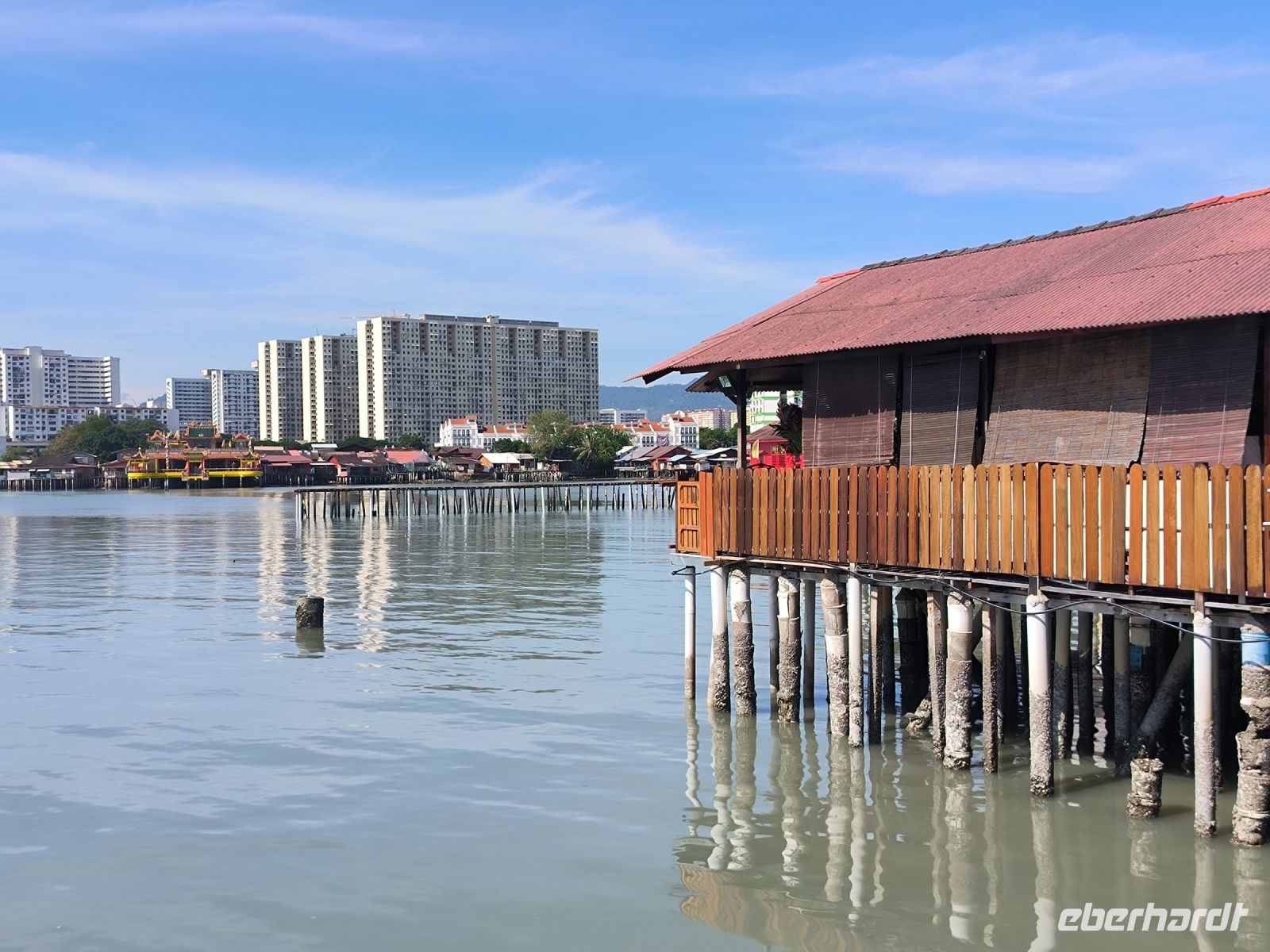 Die Chew Jetty ist eine der sechs Clan Jetties in Penang. Hier leben sechs chinesische Clans auf je einem Pier. Streng zwischen den Clans getrennt stehen die Häuser auf wilden Stelzenkonstruktionen im Wasser, weil die Chinesen auf dem Wasser keine Steuern zahlen müssen. Bis heute sozusagen eine Steueroase mitten in Penang. Es gibt je einen Tempel zur Land- und zur Wasserseite.