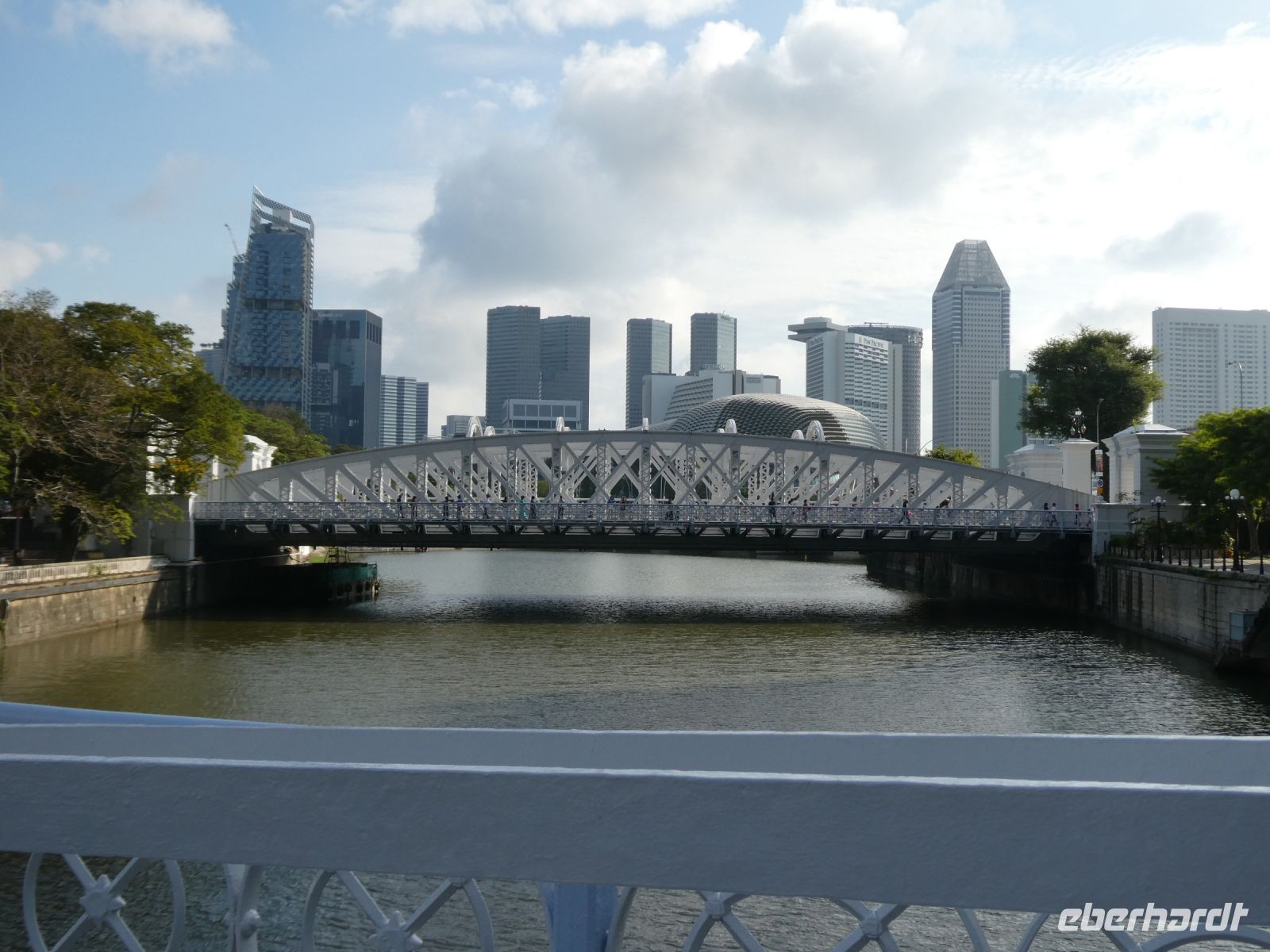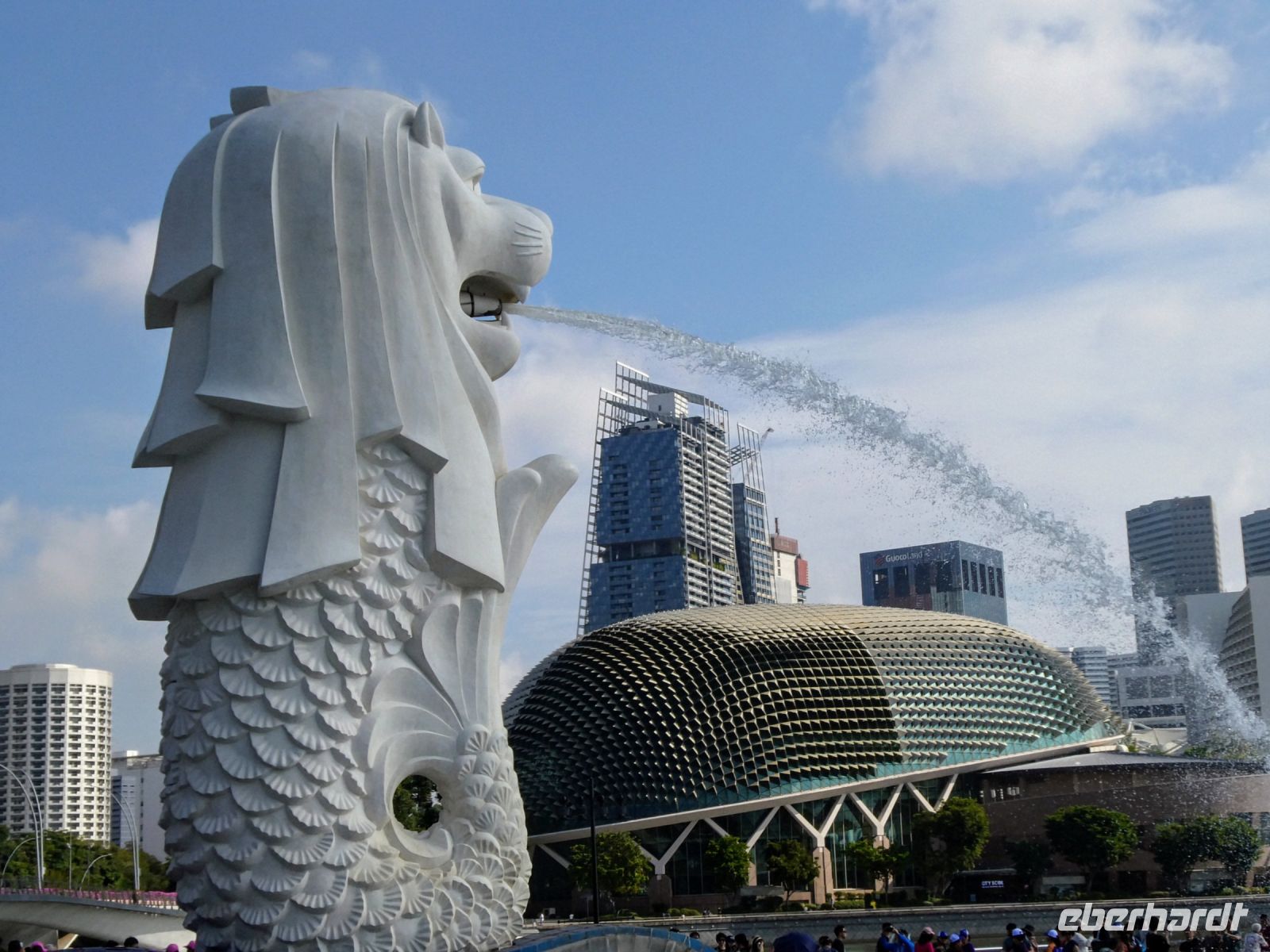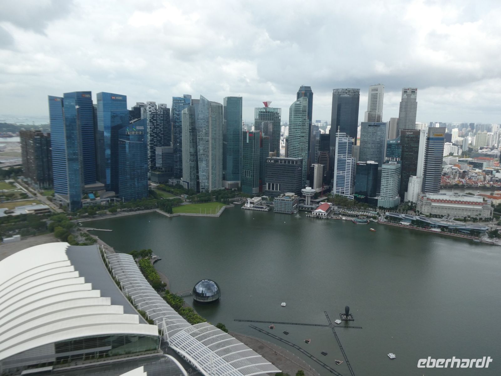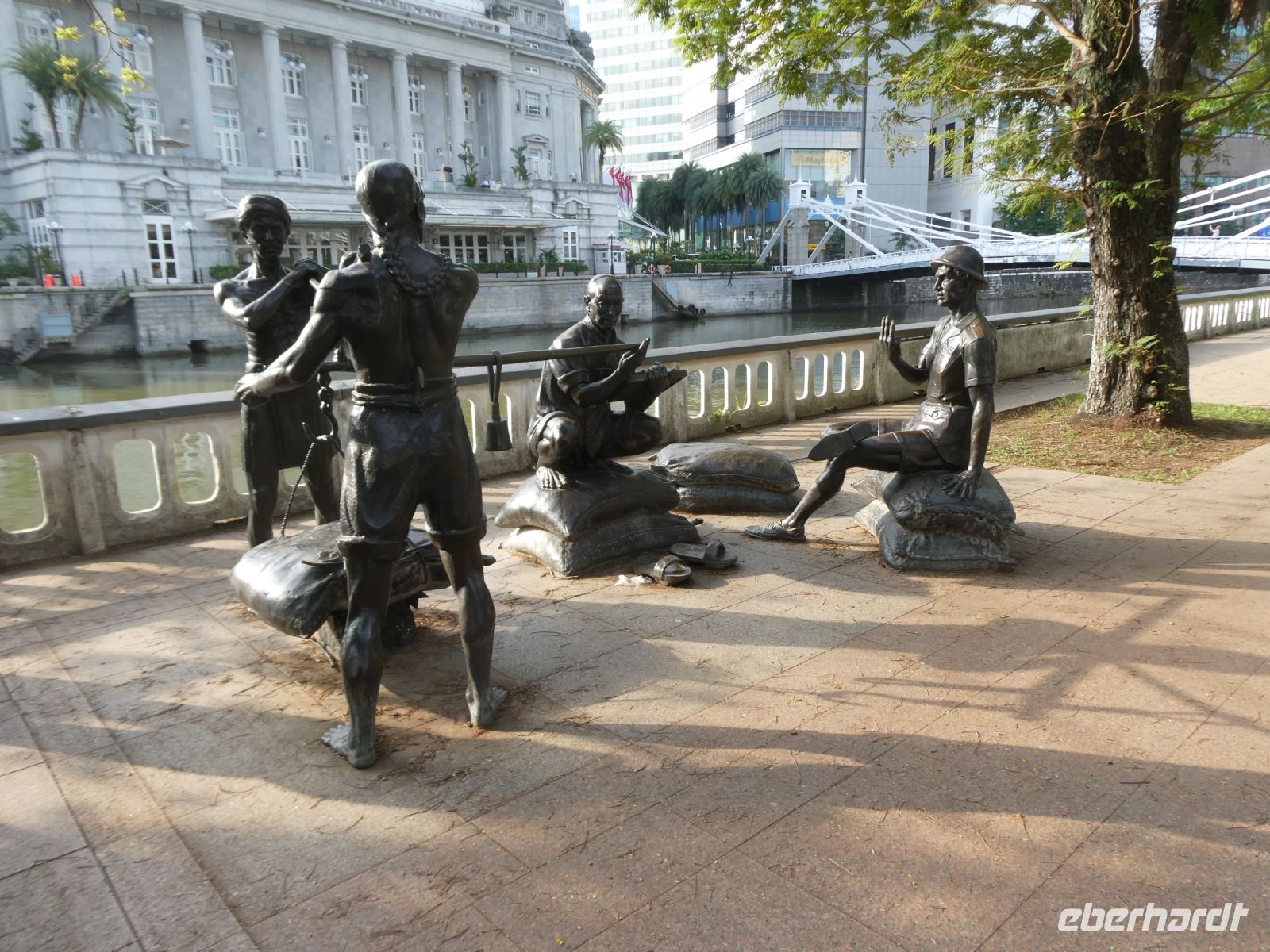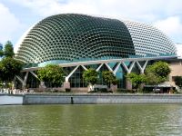 Wir sehen Wolkenkratzer auf der anderen Seite des Singapur Rivers der die Stadt durchzieht. Er spielte in historischen Zeiten eine wichtige Rolle in der Entwicklung der Stadt. Eine Statue von Herrn Raffles steht vor dem Victoria Theater, ein ansprechender Kolonialbau. Wir bewundern das ehemalige Postamt in dem heute das Fullerton Hotel seine Gäste bewirtet und durchqueren das Souterrain des Hotels bis auf die andere Seite von wo wir auf das Marina Bay Sands Hotel blicken. Es ist ein futuristischer Bau, der seit seiner Eröffnung im Jahr 2010 mit anderen sehr modern wirkenden Gebäuden die Skyline von Singapur prägt. Den 340 m langen Dachgarten, der quer über die 3 Hoteltürme erbaut wurde, werden wir am Montag besuchen.