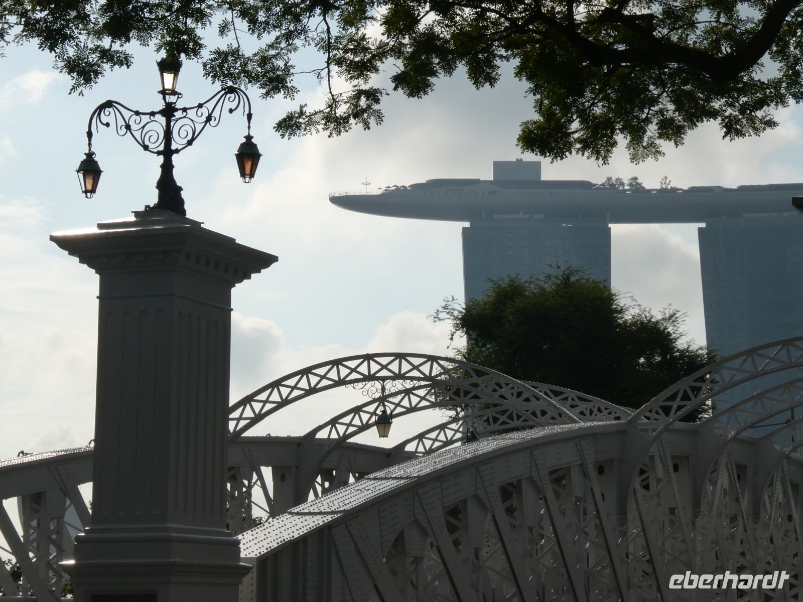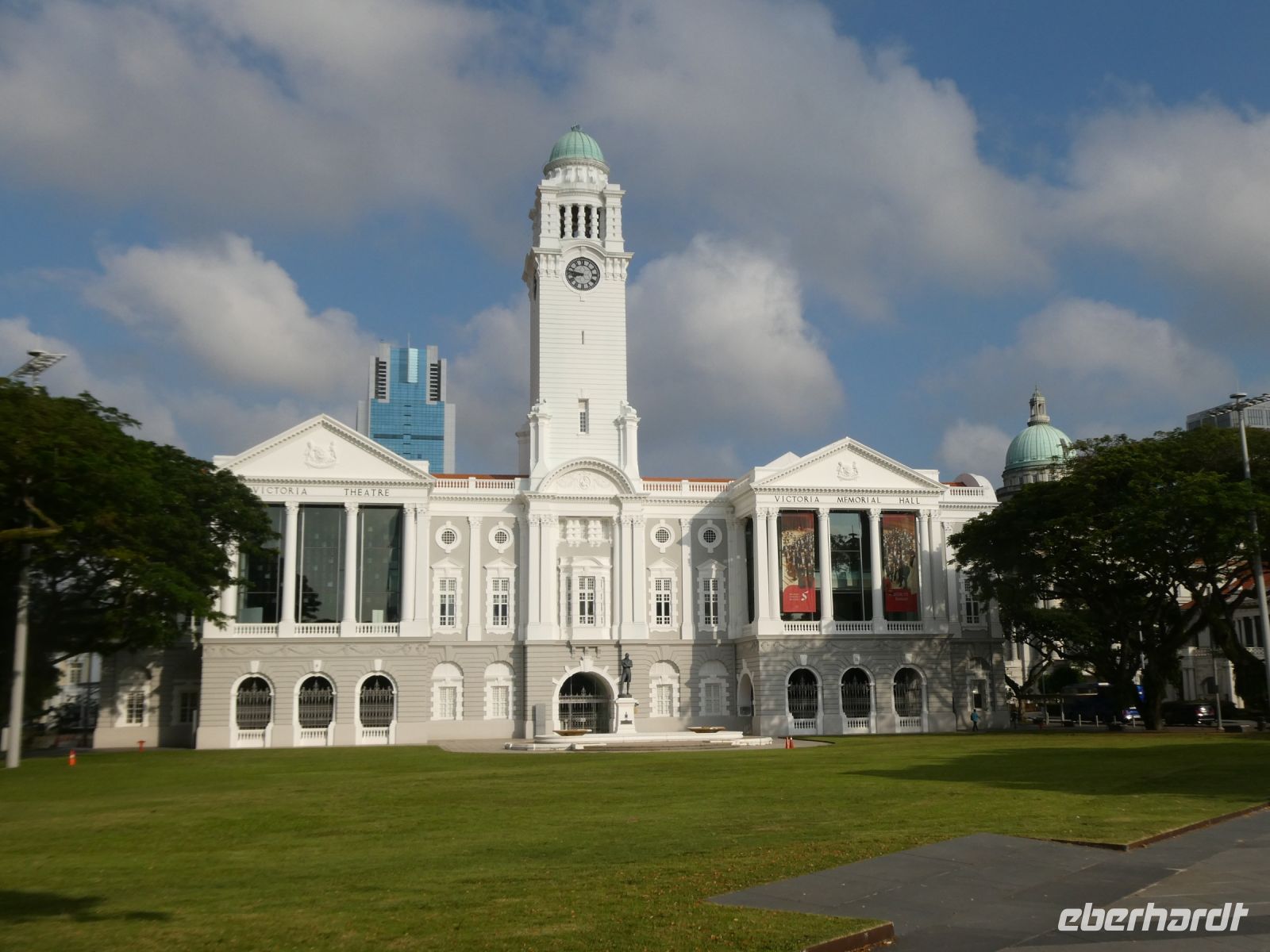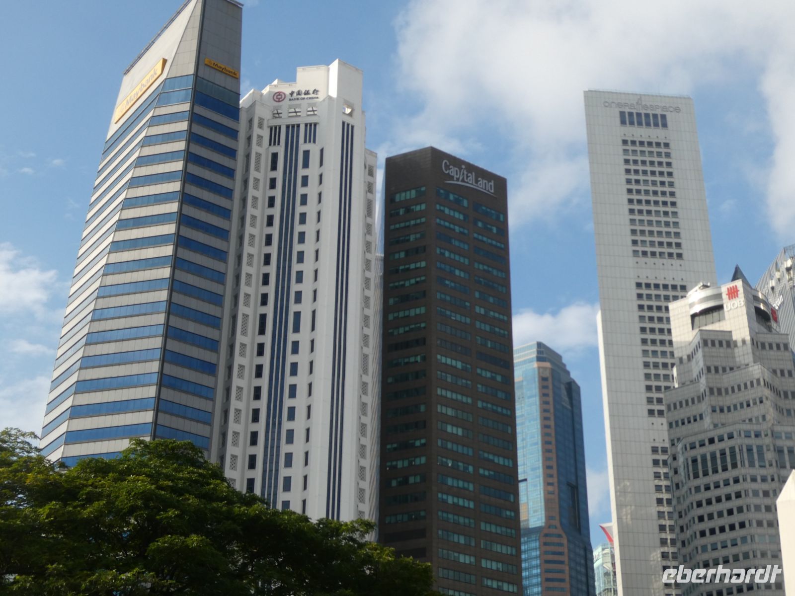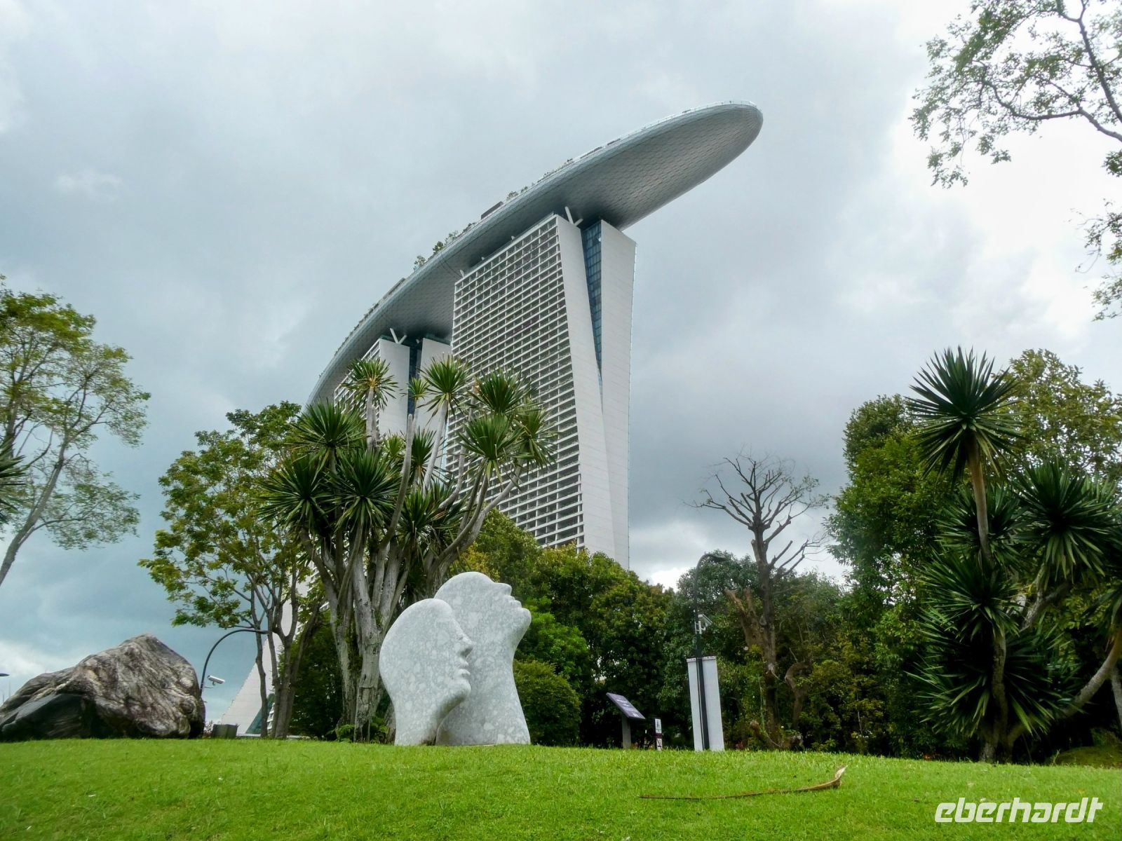 Wir sehen Wolkenkratzer auf der anderen Seite des Singapur Rivers der die Stadt durchzieht. Er spielte in historischen Zeiten eine wichtige Rolle in der Entwicklung der Stadt. Eine Statue von Herrn Raffles steht vor dem Victoria Theater, ein ansprechender Kolonialbau. Wir bewundern das ehemalige Postamt in dem heute das Fullerton Hotel seine Gäste bewirtet und durchqueren das Souterrain des Hotels bis auf die andere Seite von wo wir auf das Marina Bay Sands Hotel blicken. Es ist ein futuristischer Bau, der seit seiner Eröffnung im Jahr 2010 mit anderen sehr modern wirkenden Gebäuden die Skyline von Singapur prägt. Den 340 m langen Dachgarten, der quer über die 3 Hoteltürme erbaut wurde, werden wir am Montag besuchen.