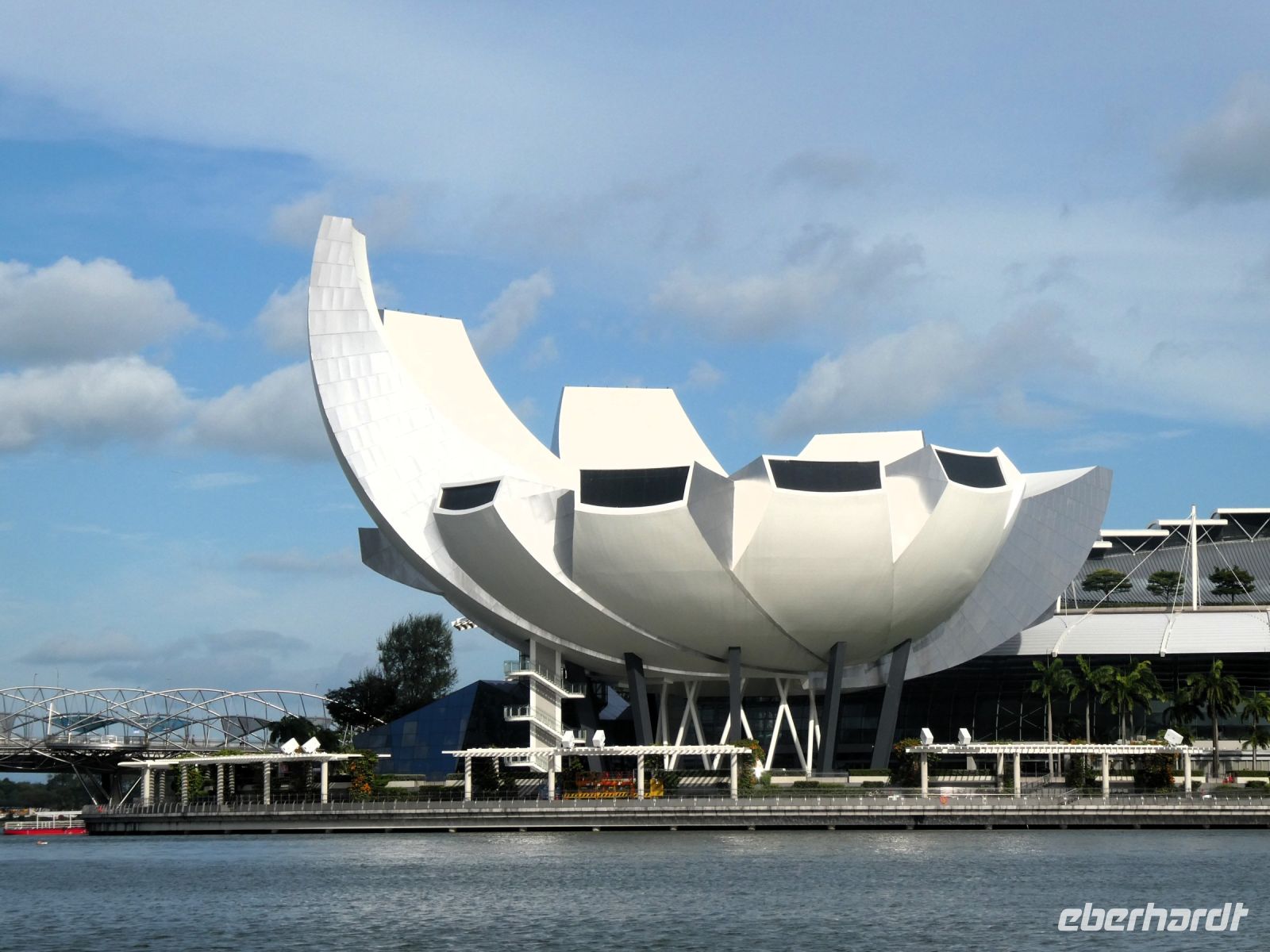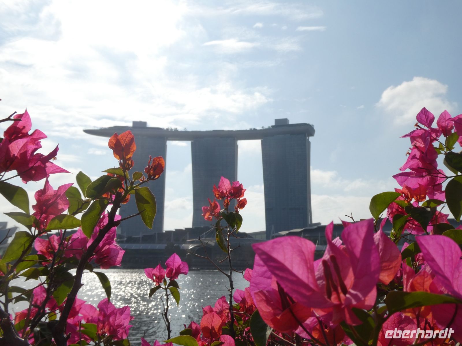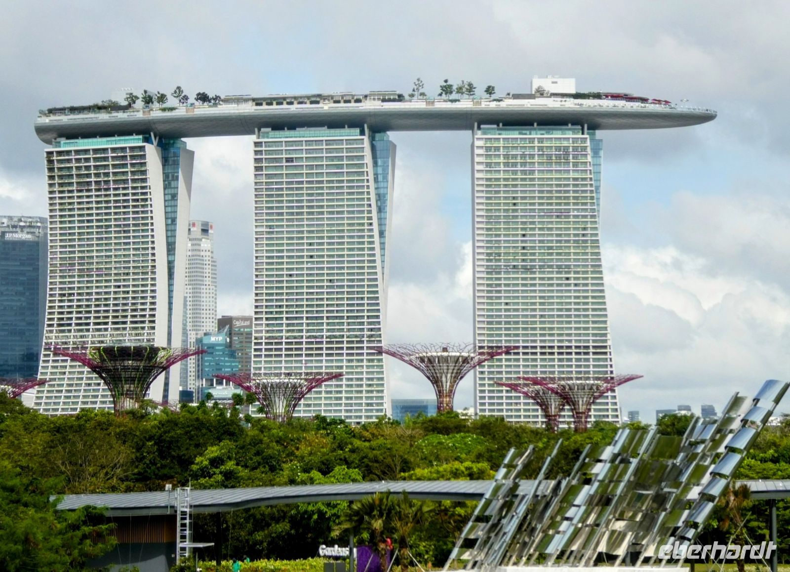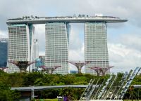 Danach steht das berühmte Hotels "Marina Bay Sands" auf dem Programm, bzw. der Besuch der obersten Etage, auf die wir nach Anmeldung und gegen Eintritt mit dem Fahrstuhl fahren. Die Ebene liegt in einer Höhe von fast 200 Metern. Der Bau von dem Architekten Mosche Safdie wurde von mehreren Feng-Shui-Meistern abgesegnet. Wir können über die Platform spazieren und auch einen seitlichen Blick auf den größte Außenschwimmbad in dieser Höhe erhaschen. Der Rundumblick ist grandios, eine Superlative unter den weltweiten Hotelbauten. Allerdings muss man einen 3-stelligen Betrag der mit einer 5 beginnt anlegen um hier zu wohnen.