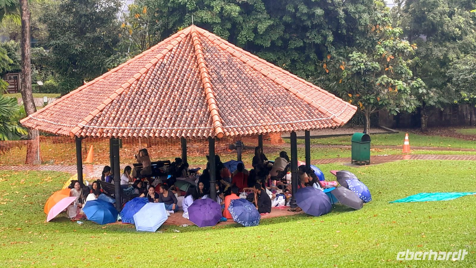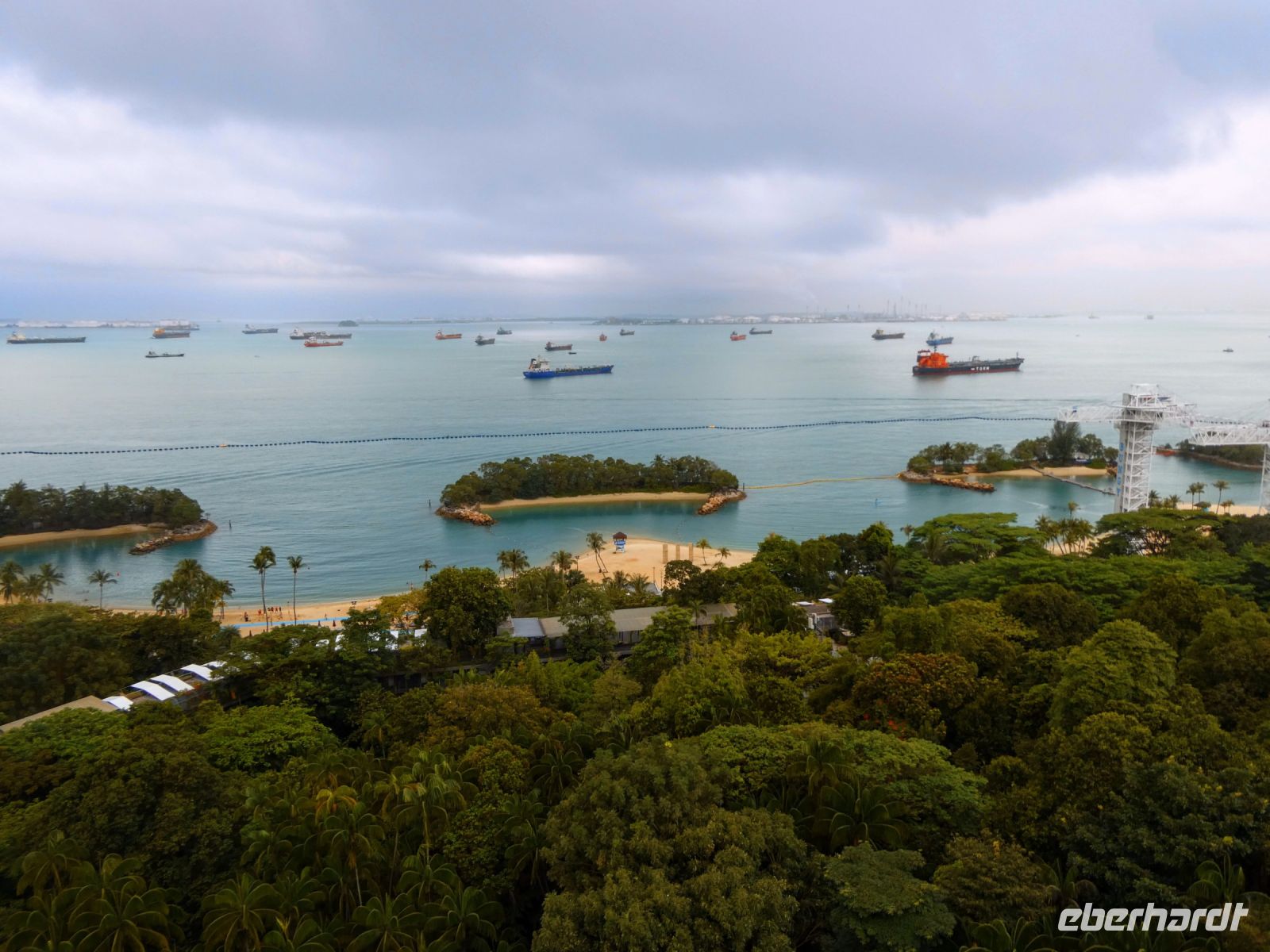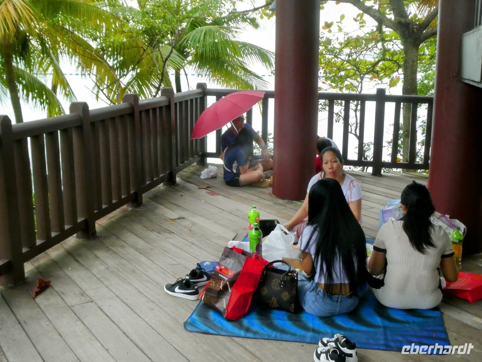 Anschließend fahren wir zu einem Knotenpunkt von dem wir zu einer Hängebrücke gelangen. Über diese schwankende Brücke gelangen wir zu einem Aussichtspunkt. Von dort oben können wir auf die Strände von Sentosa blicken, denn bei schönem Wetter kommen am Wochende die Familien zum Baden und Picknicken hierher. Heute dient der überdachte Aussichtsturm als Picknickplatz, da es regnet.