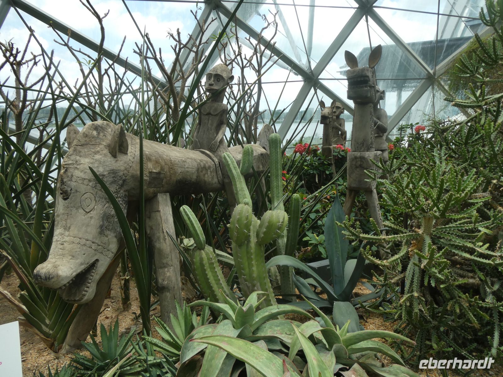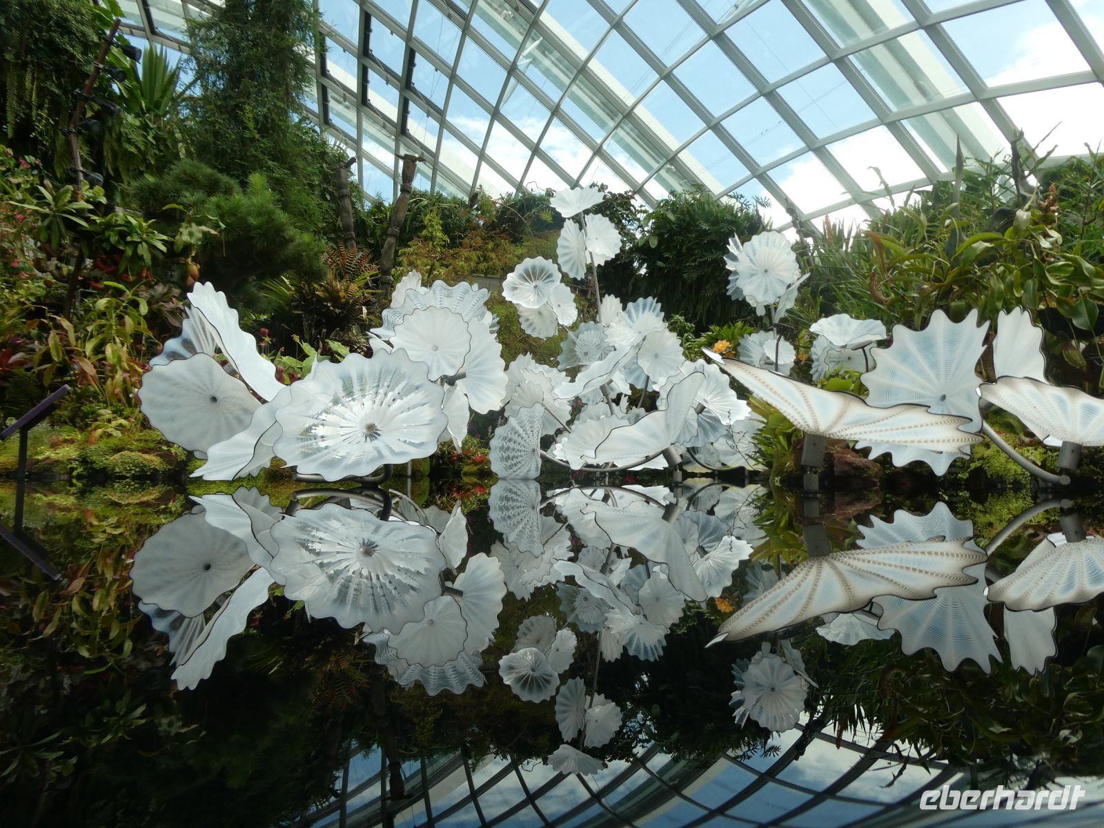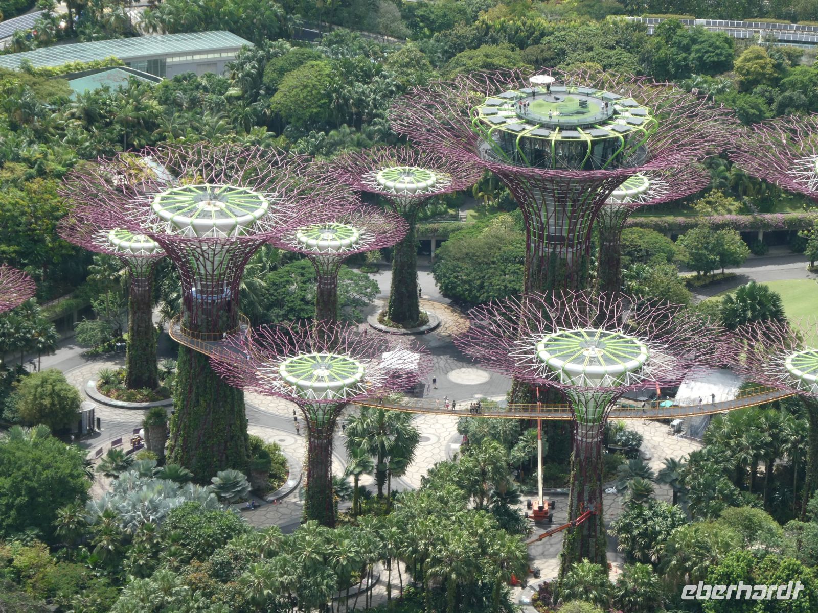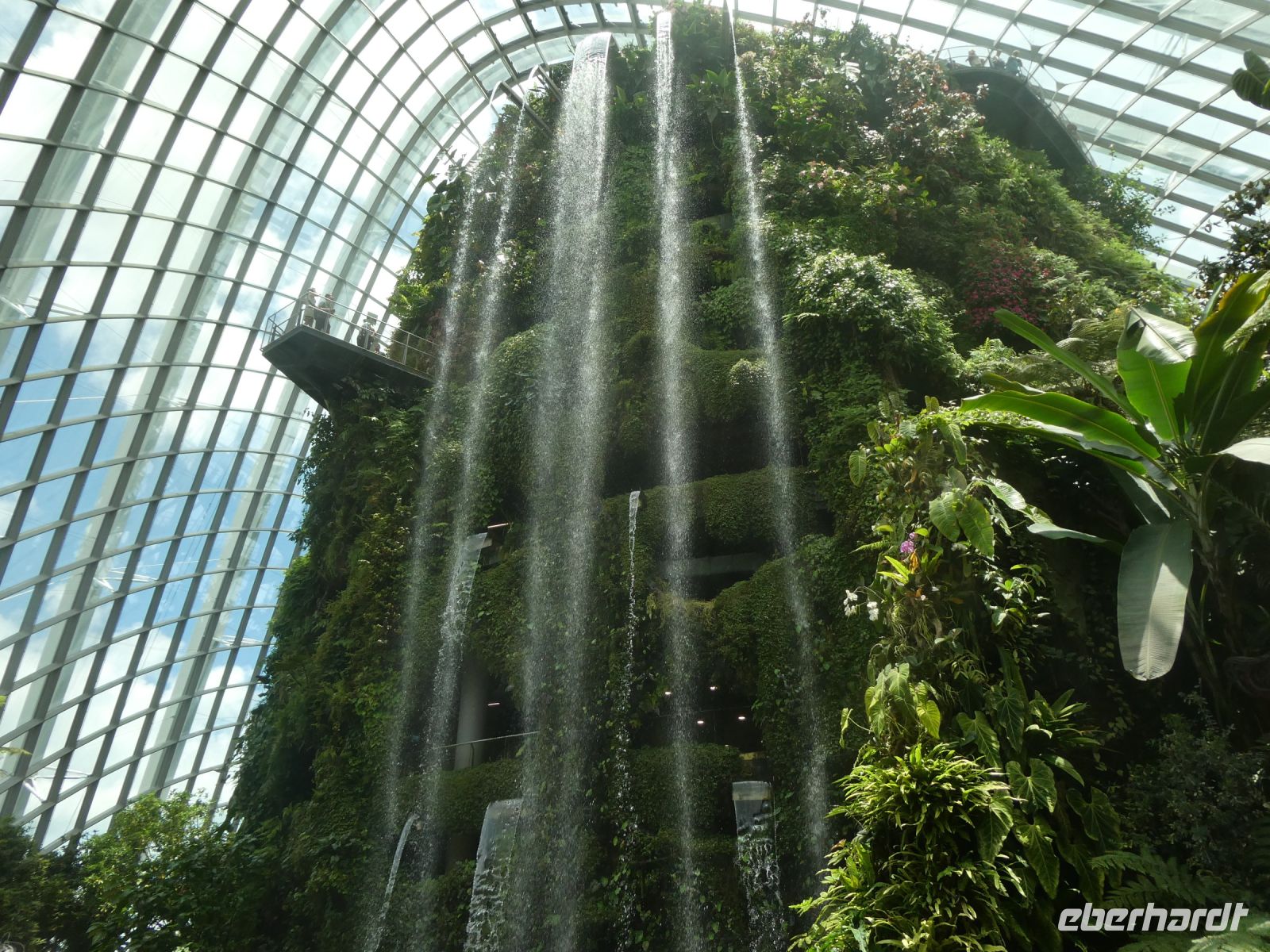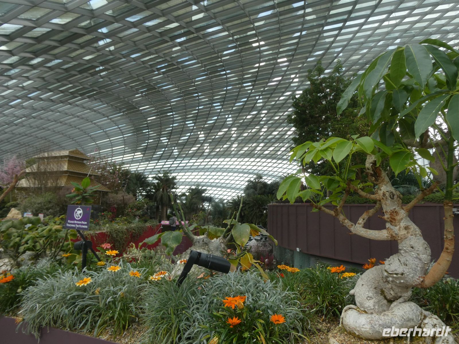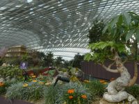 Nach diesem spektakulären Besuch machen wir einen Spaziergang zu den Gardens-by-the-Bay, ein 101 Hektar großes Parkgelände auf künstlich aufgeschüttetem Land. Auf ihm befinden sich die Supertrees und der Flower Dome. Alle haben den fakultativen Eintritt gebucht und wir beginnen mit einer Reise durch den Flower Dome, einem gigantischen Gewächshaus wo sich Pflanzen aus den subtropischen Bereichen der Erde befinden. Im Moment gibt es eine Sonderausstellung über die Kirschblüte in Japan. Anschließend dann machen wir einen Ausflug zu einem tropischen Wasserfall in einem der Supertrees. Das ganze Projekt unterhält sich energetisch autark und ist auch eine technische Meisterleistung, die zukunftsweisend ist.